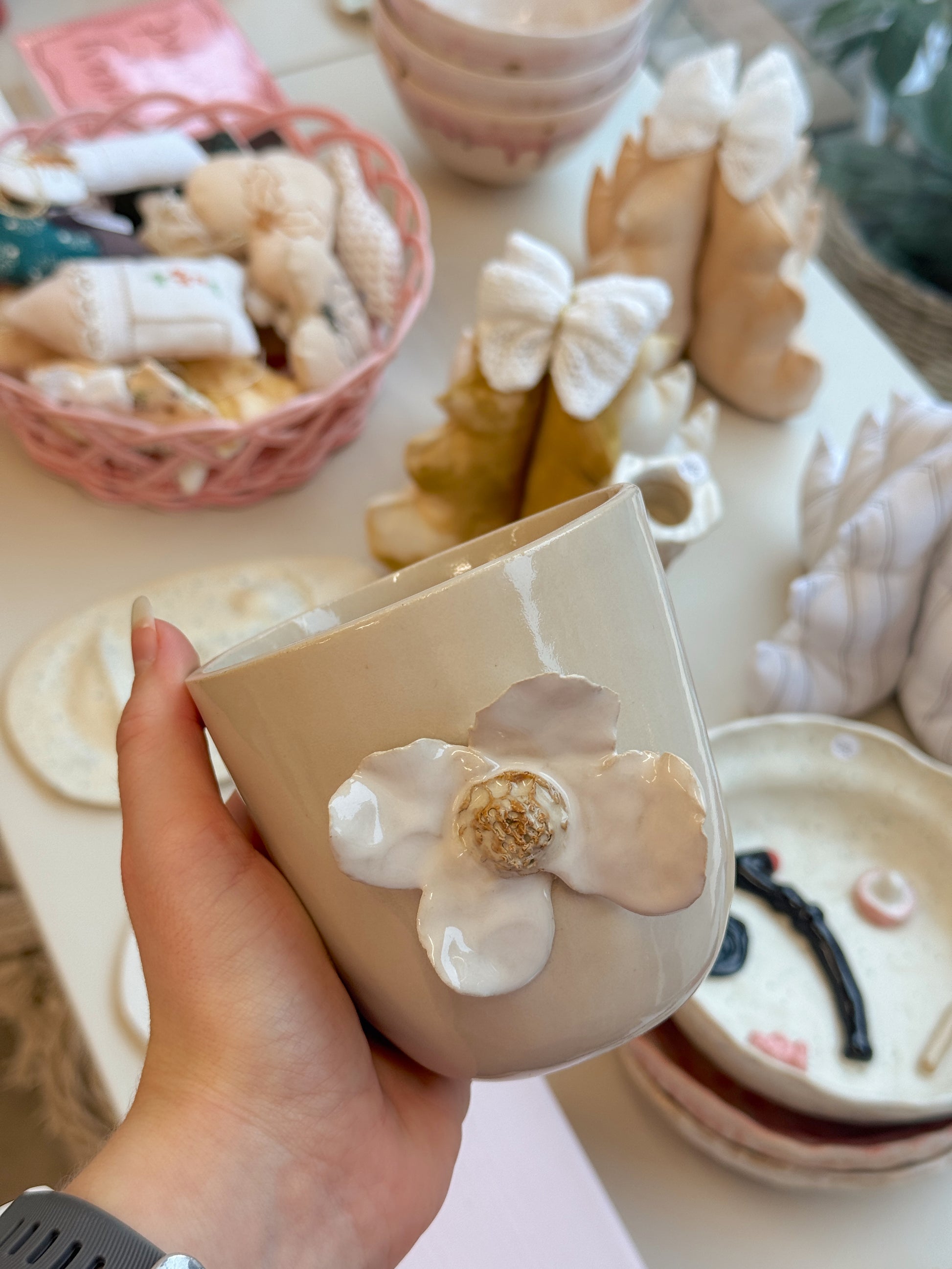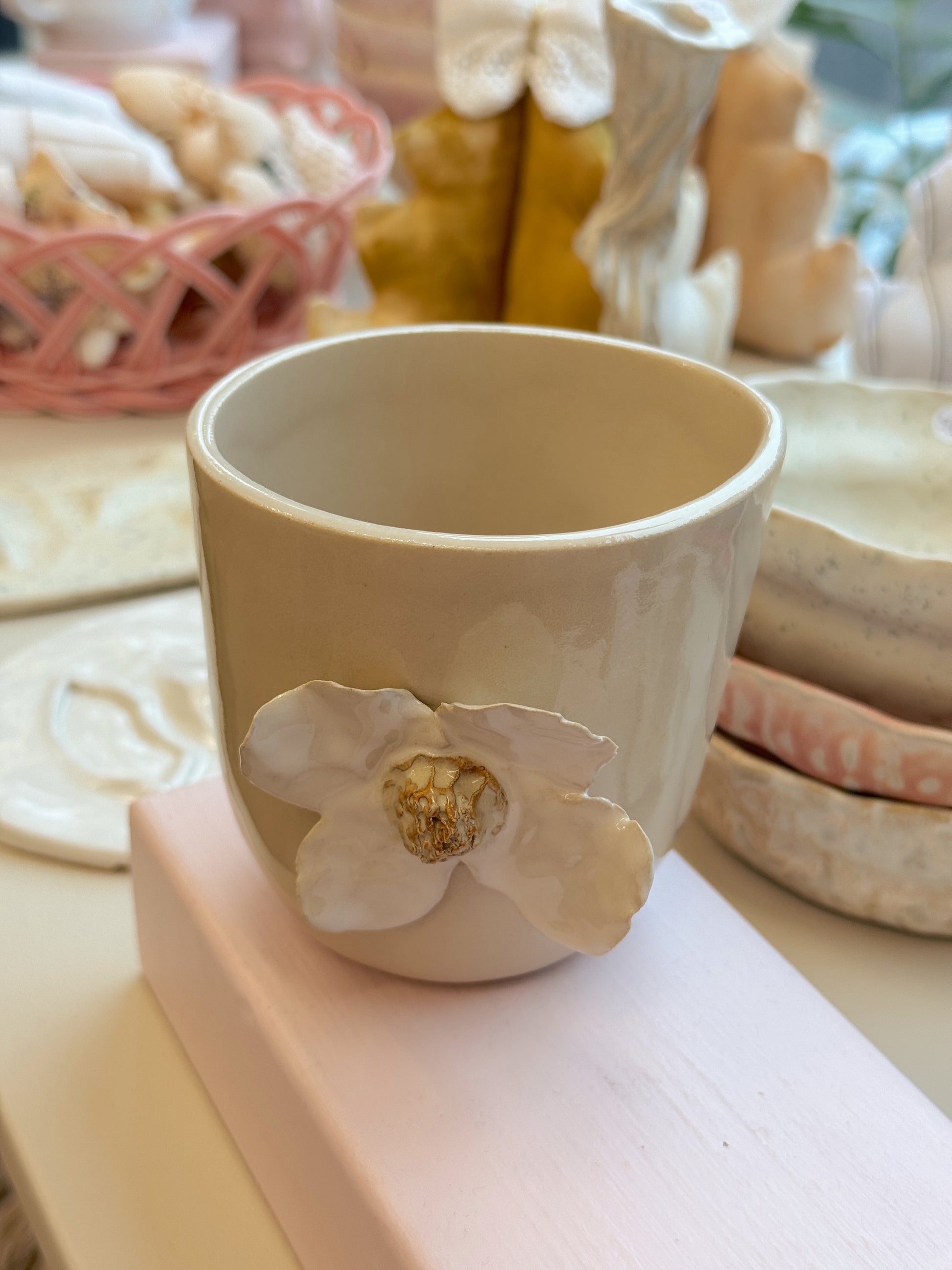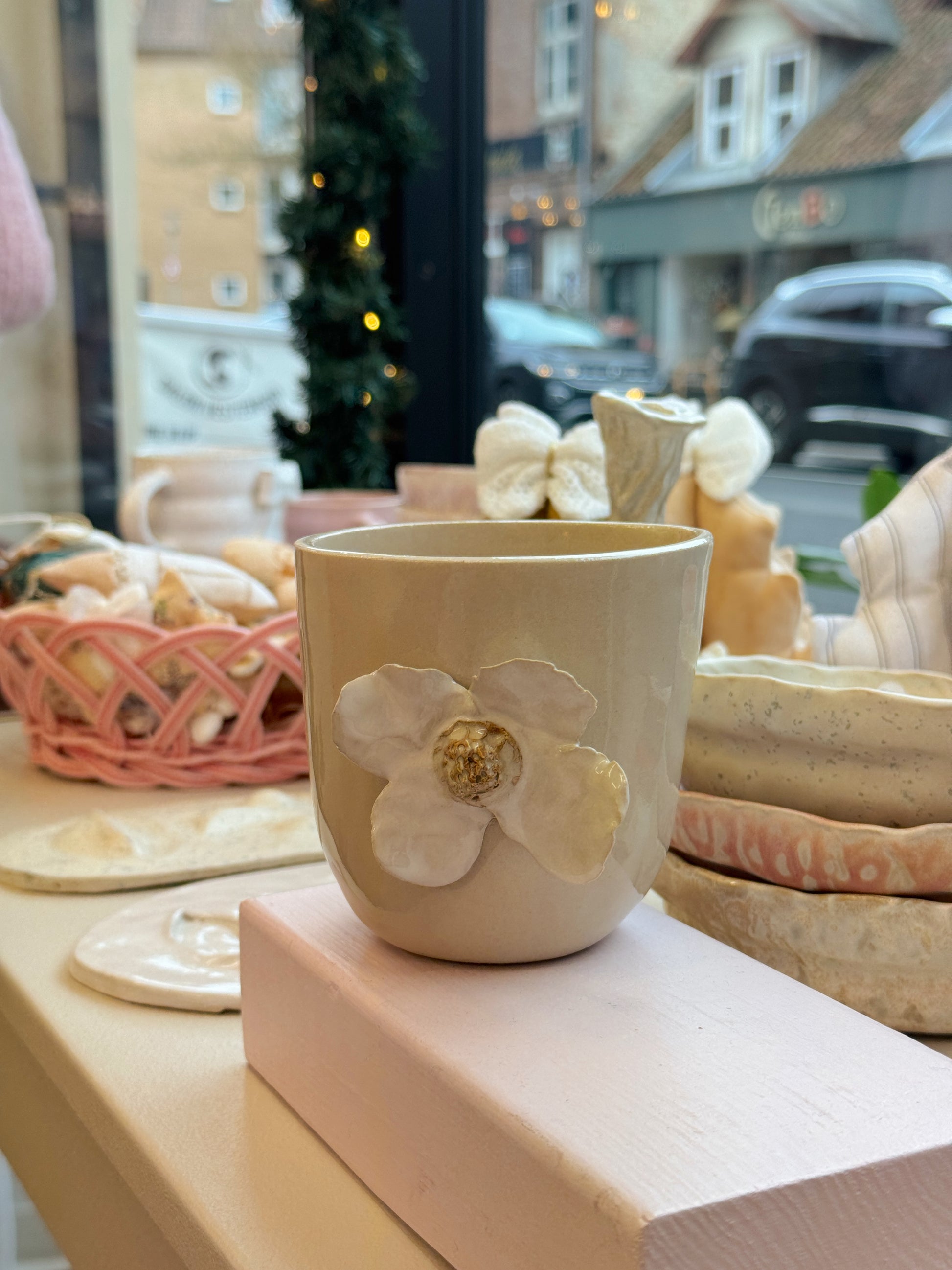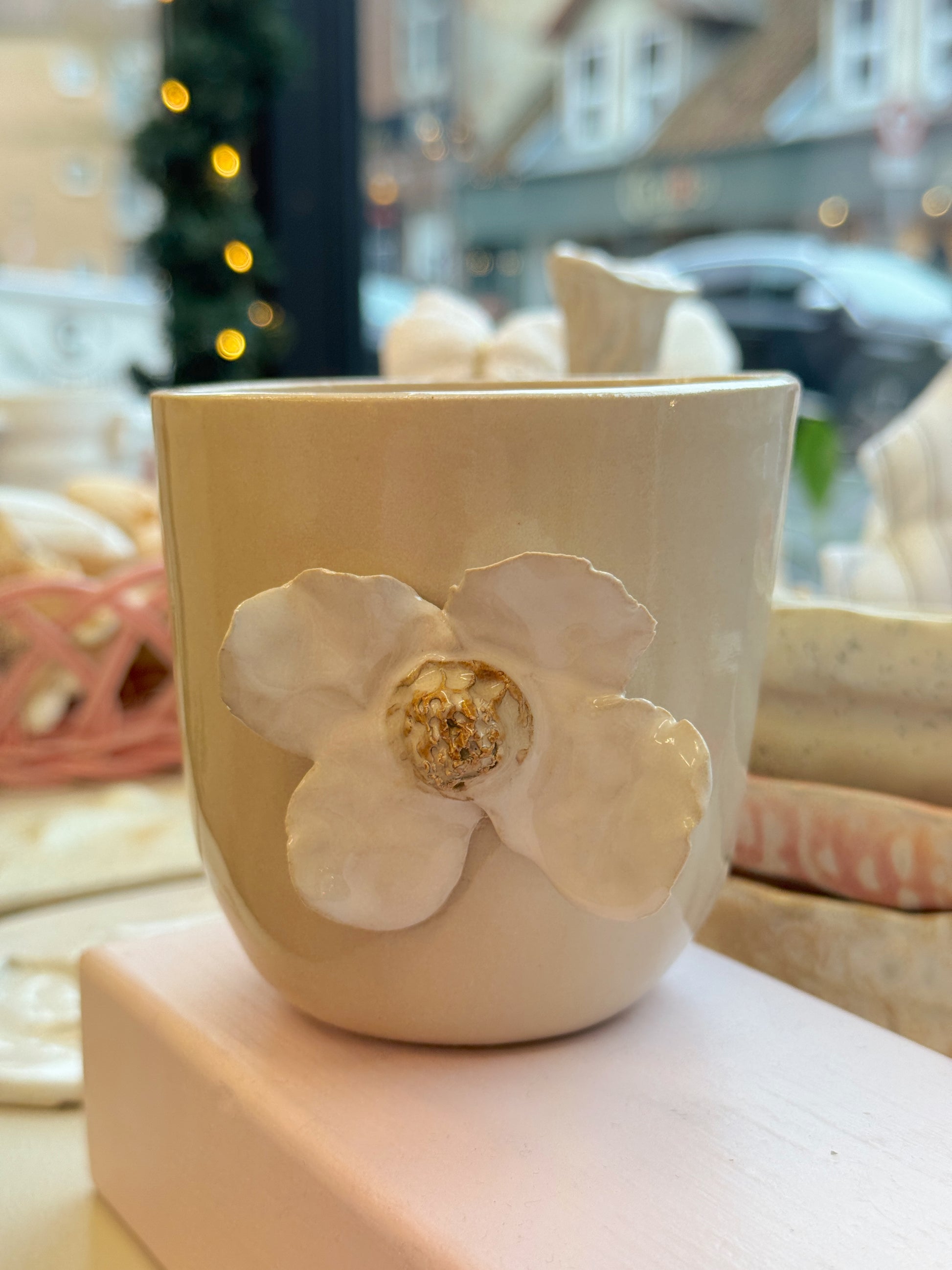 Blomsterkop fra Solkoppen med blomst på siden, et naturligt og unikt udtryk. Solkoppen former og håndmaler alle sine keramikværker. Hver en kop, skål eller stage bliver derfor helt sin egen og unik.