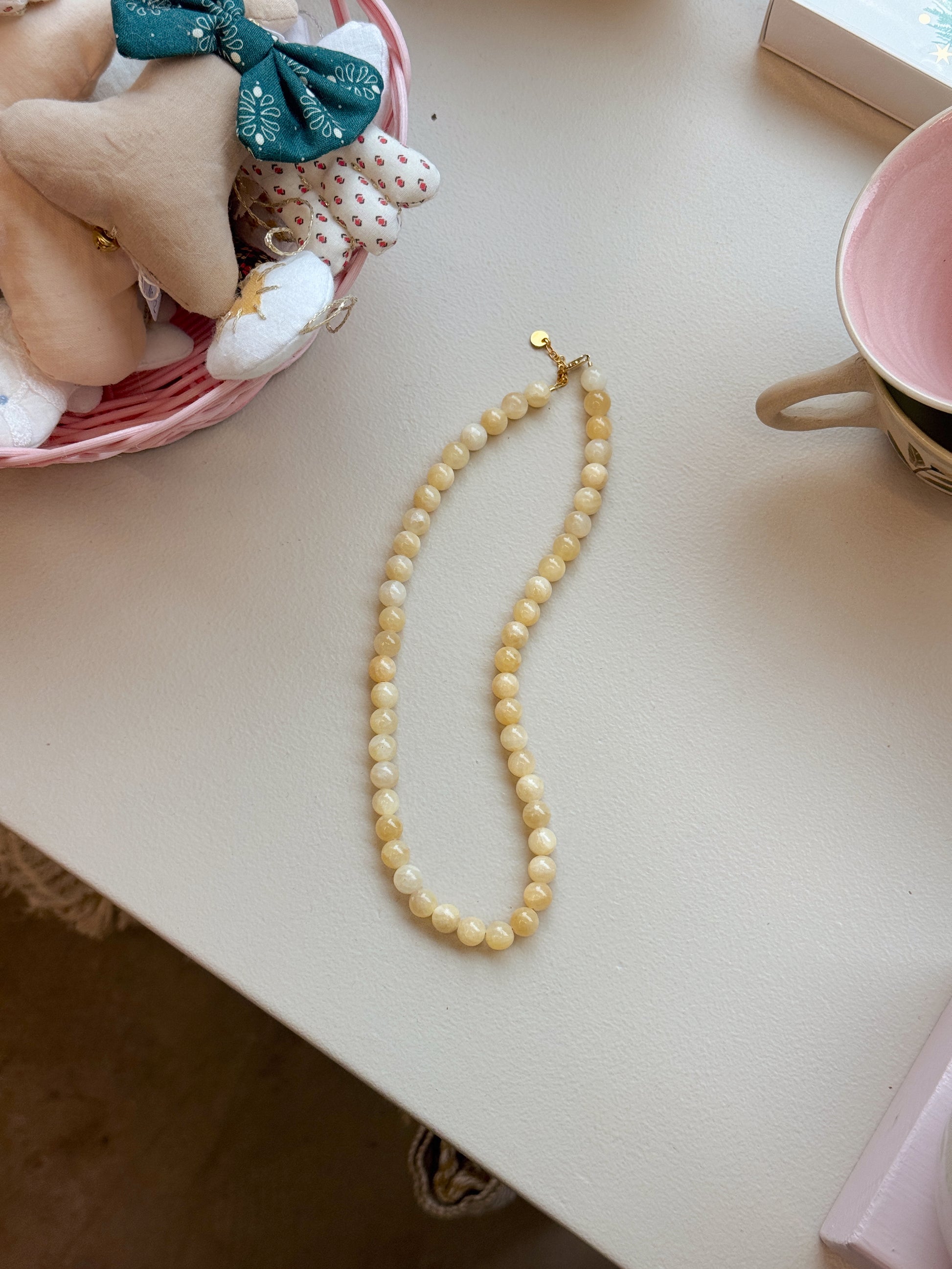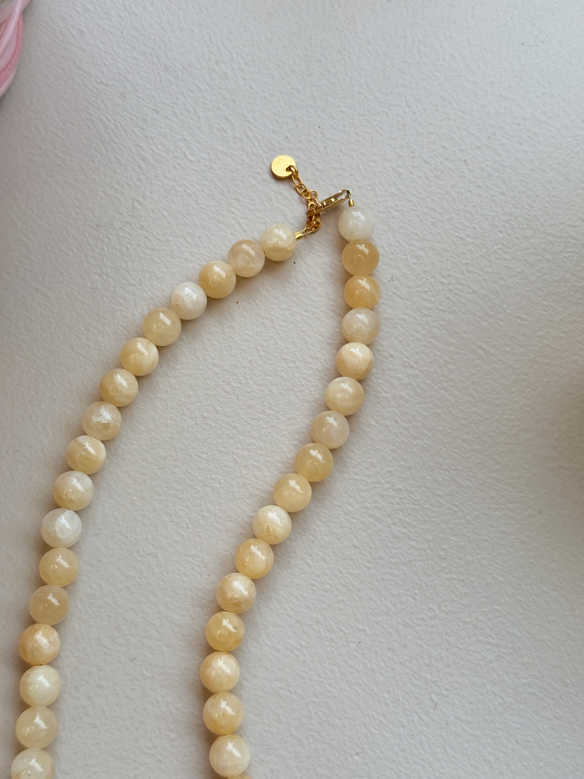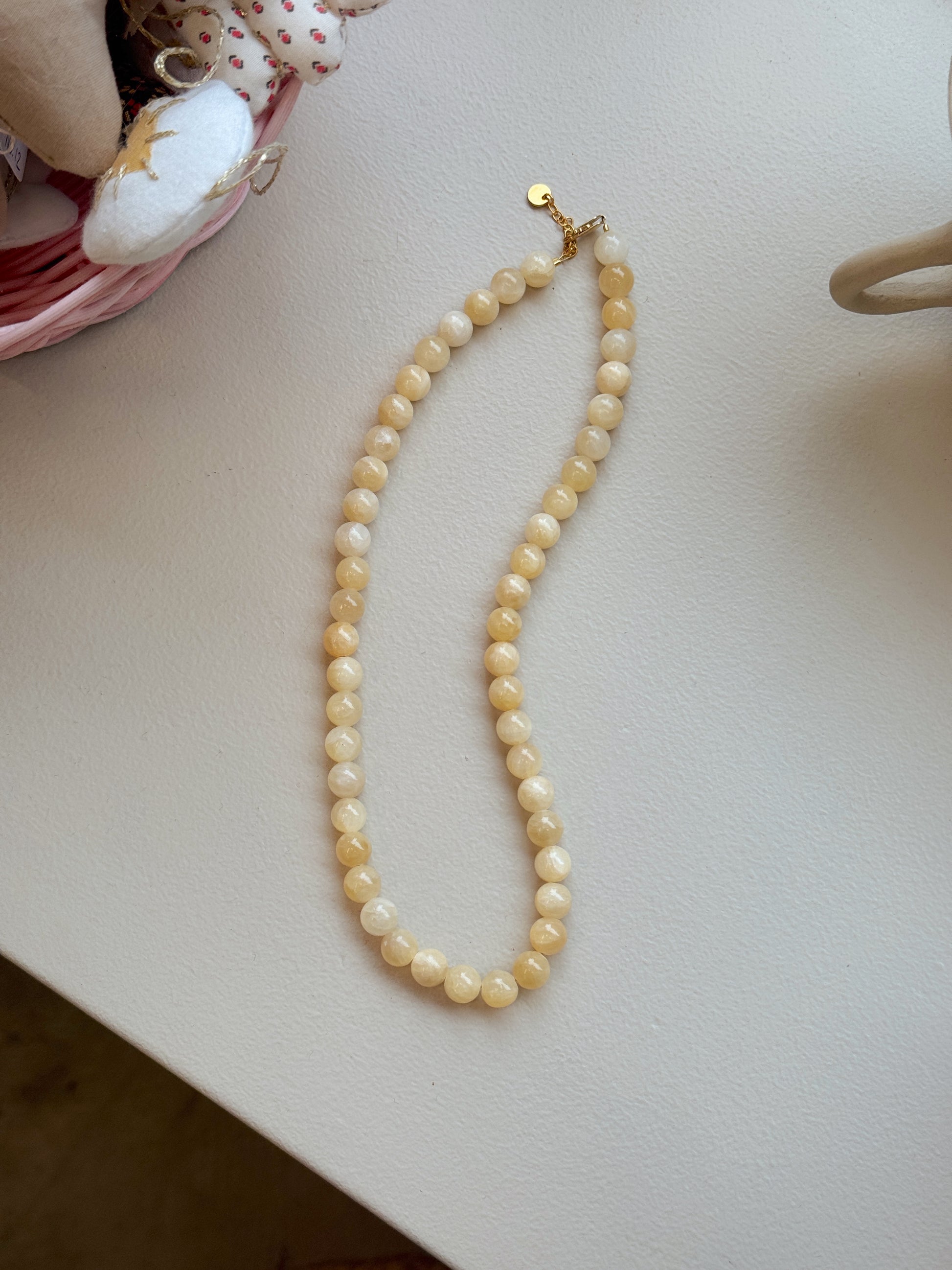 Kæden består af 8mm naturstensperler - den fås i flere forskellige farver. Perlerne er trukket på en wire, som gør kæden holdbar.