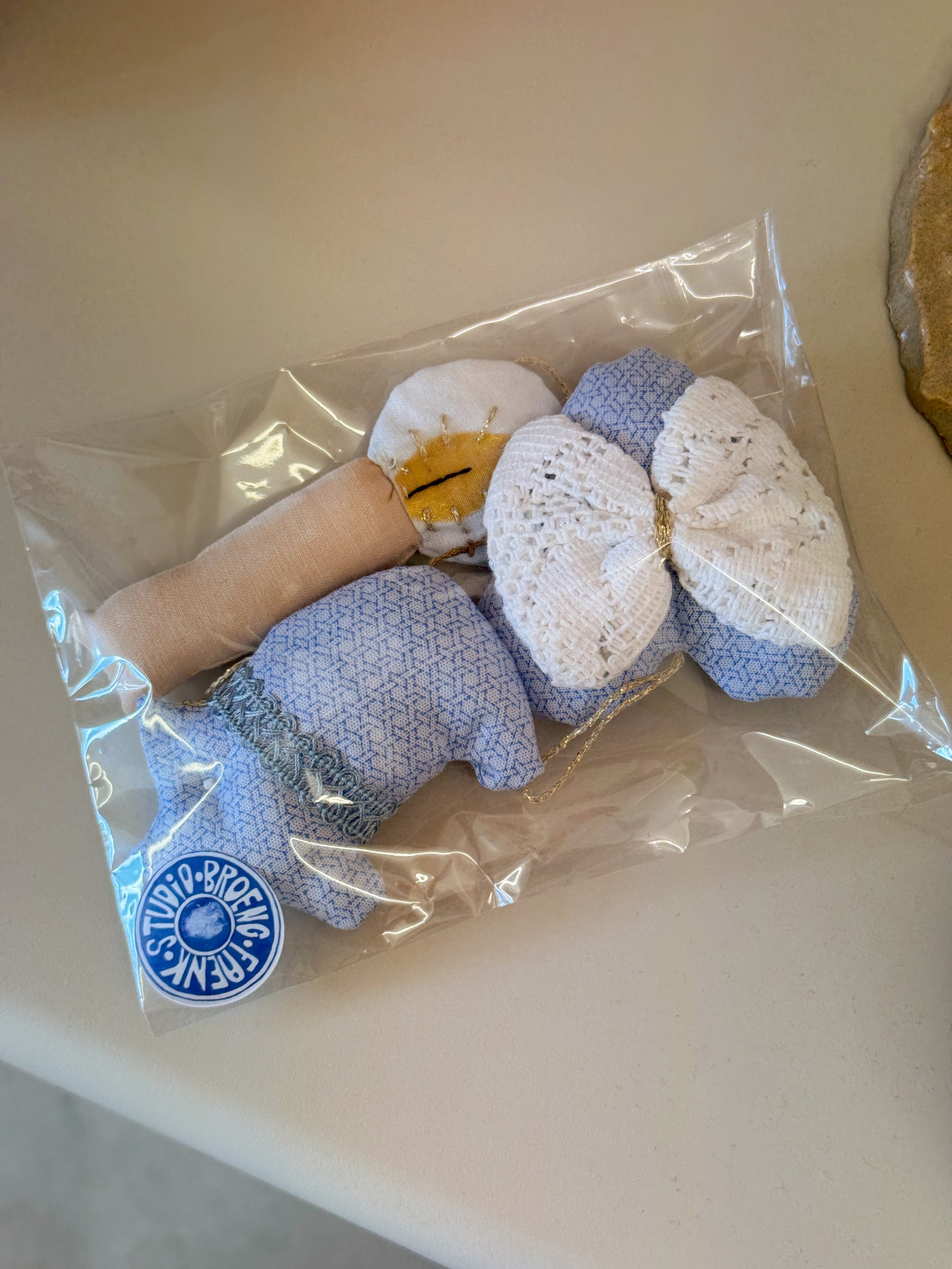 3-pak med forskellige udgaver af julepynt. Fåes i flere udgaver som alle er skabt i et mix af vintage- og plantefarvede tekstiler.