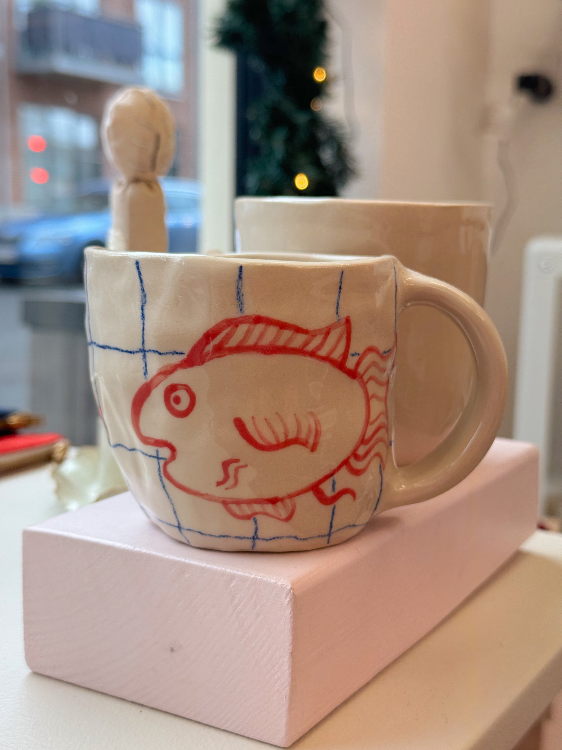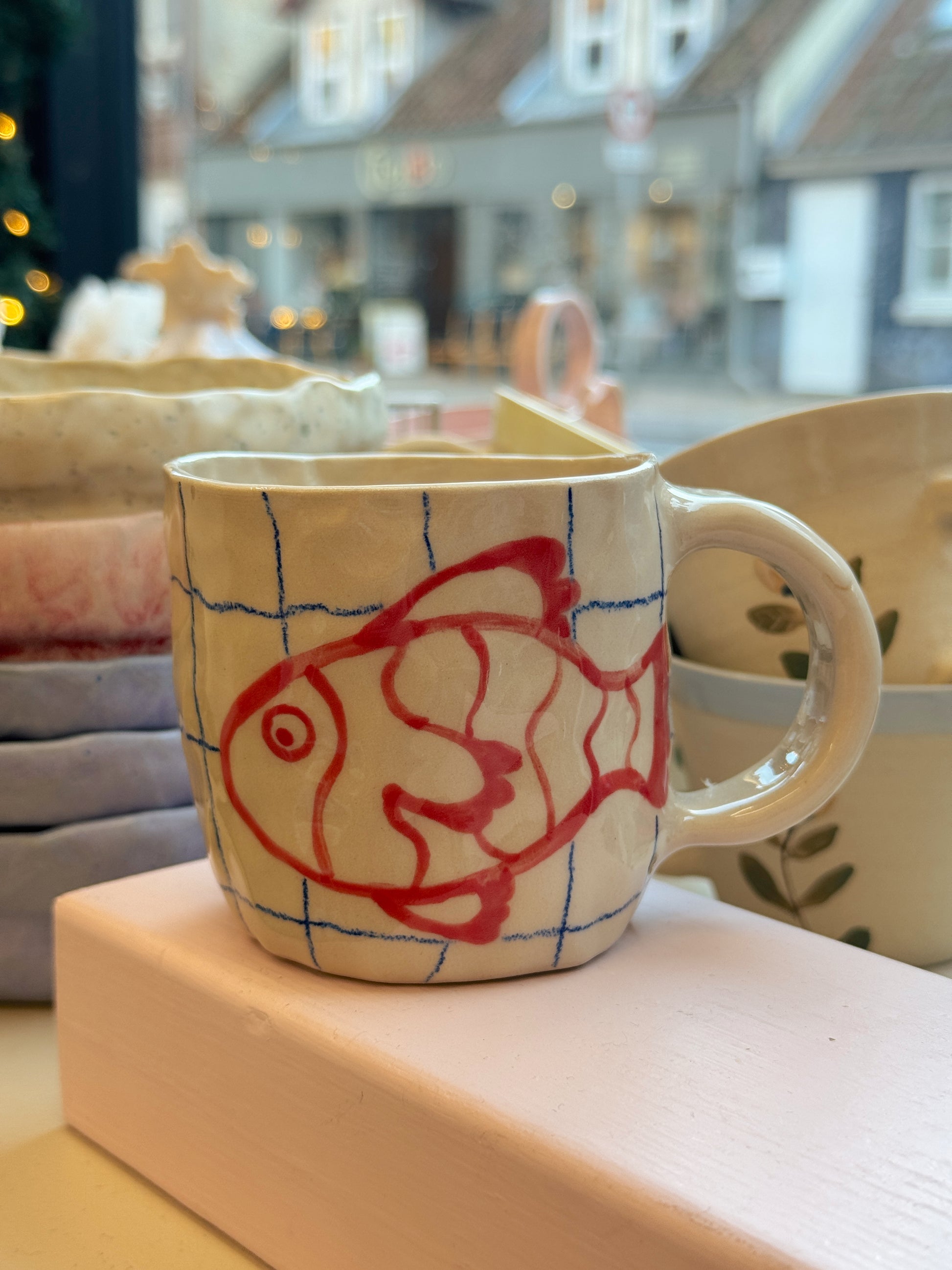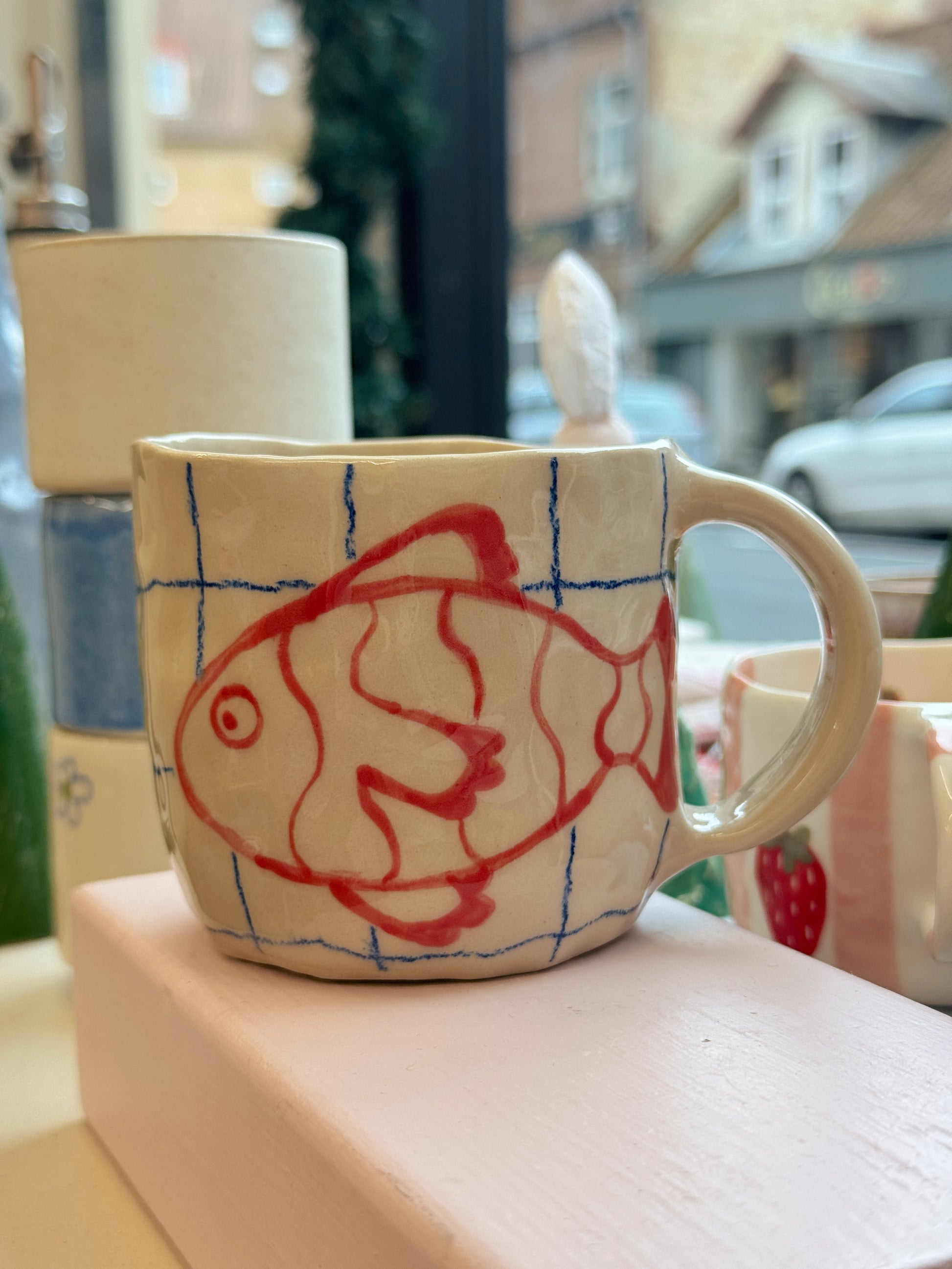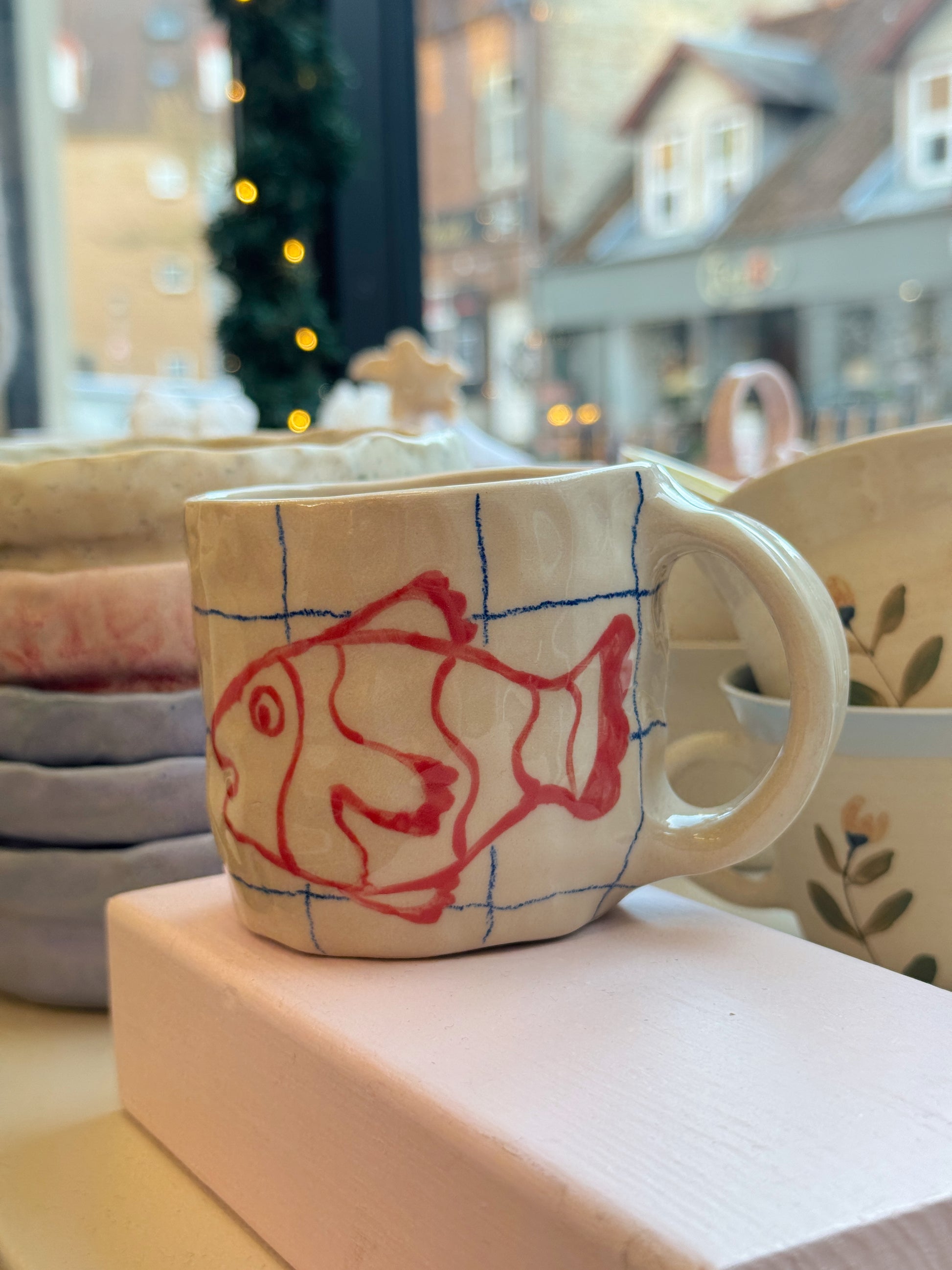 Håndformet og håndmalet kop med fisk af Alberte Hall. Alberte Hall håndformer alle hende produkter, hvorfor hver stage, kop eller kande bliver sin egen og helt unik.