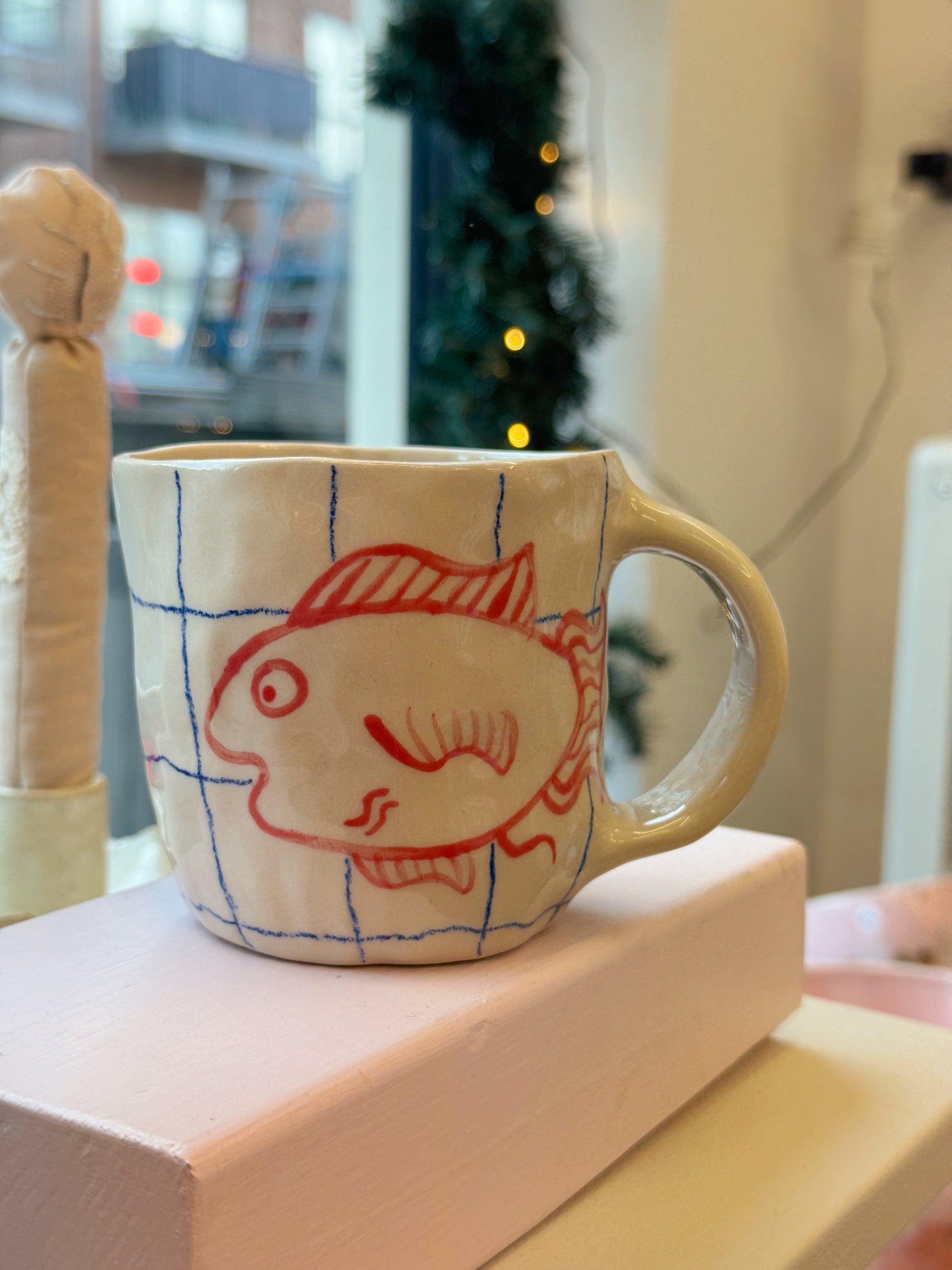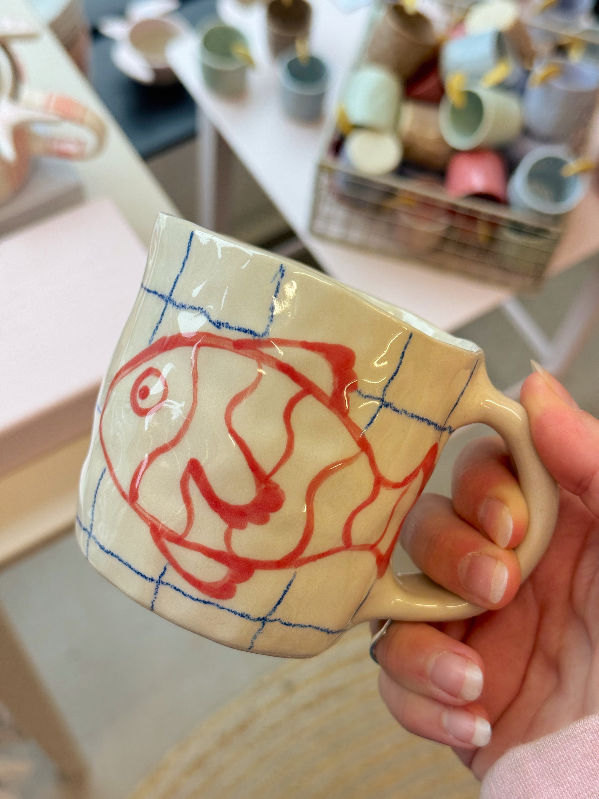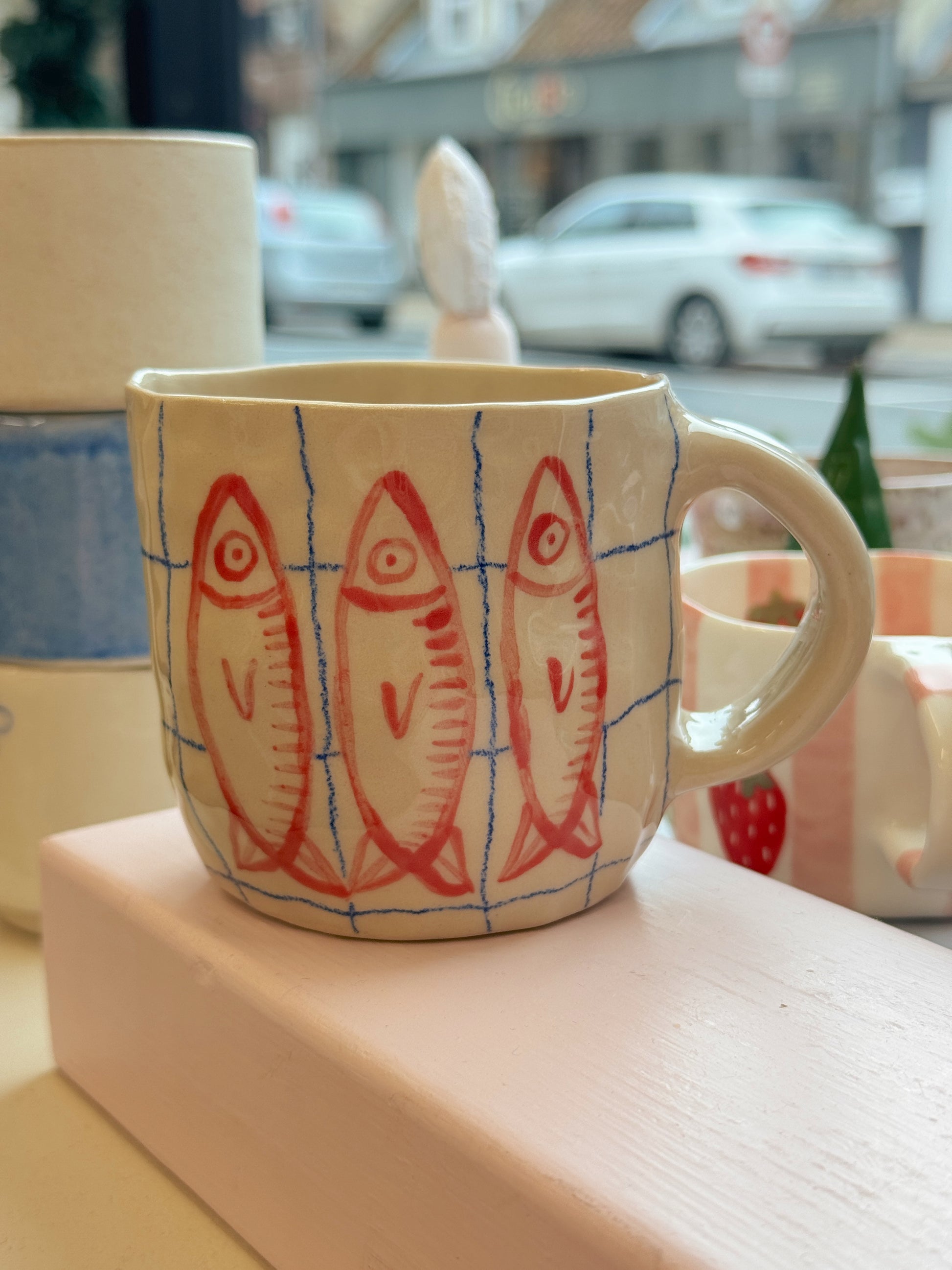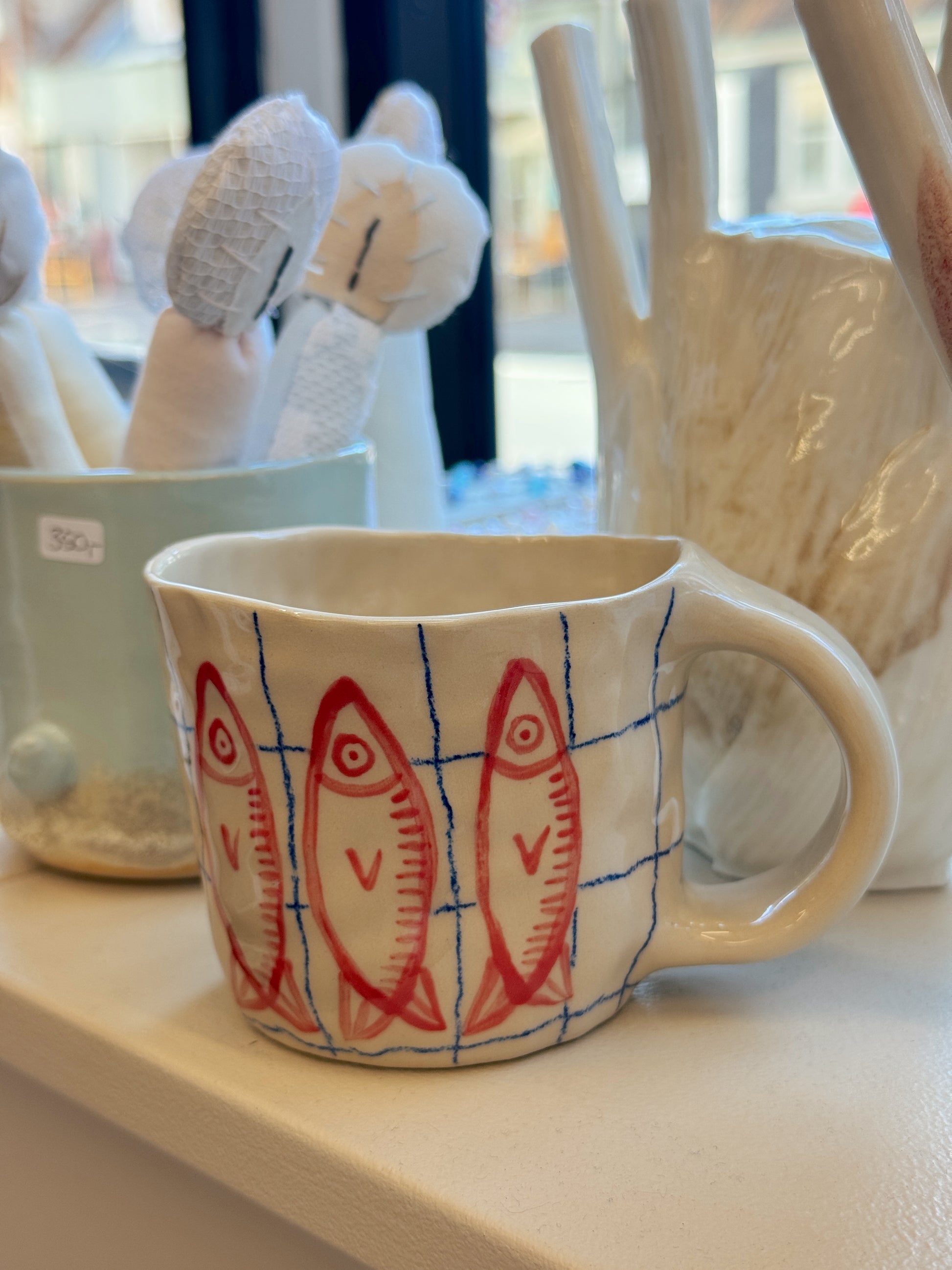 Håndformet og håndmalet kop med fisk af Alberte Hall. Alberte Hall håndformer alle hende produkter, hvorfor hver stage, kop eller kande bliver sin egen og helt unik.