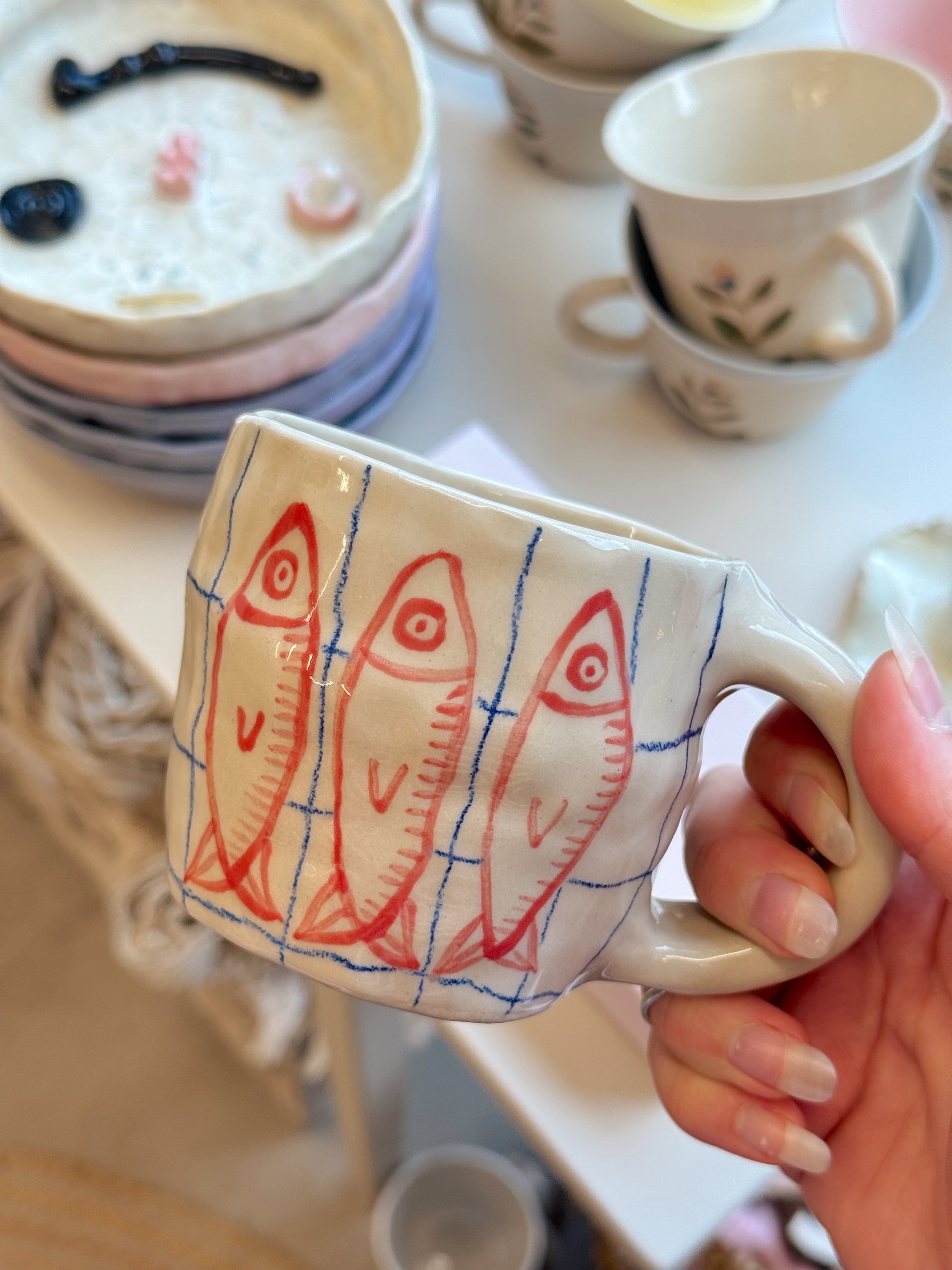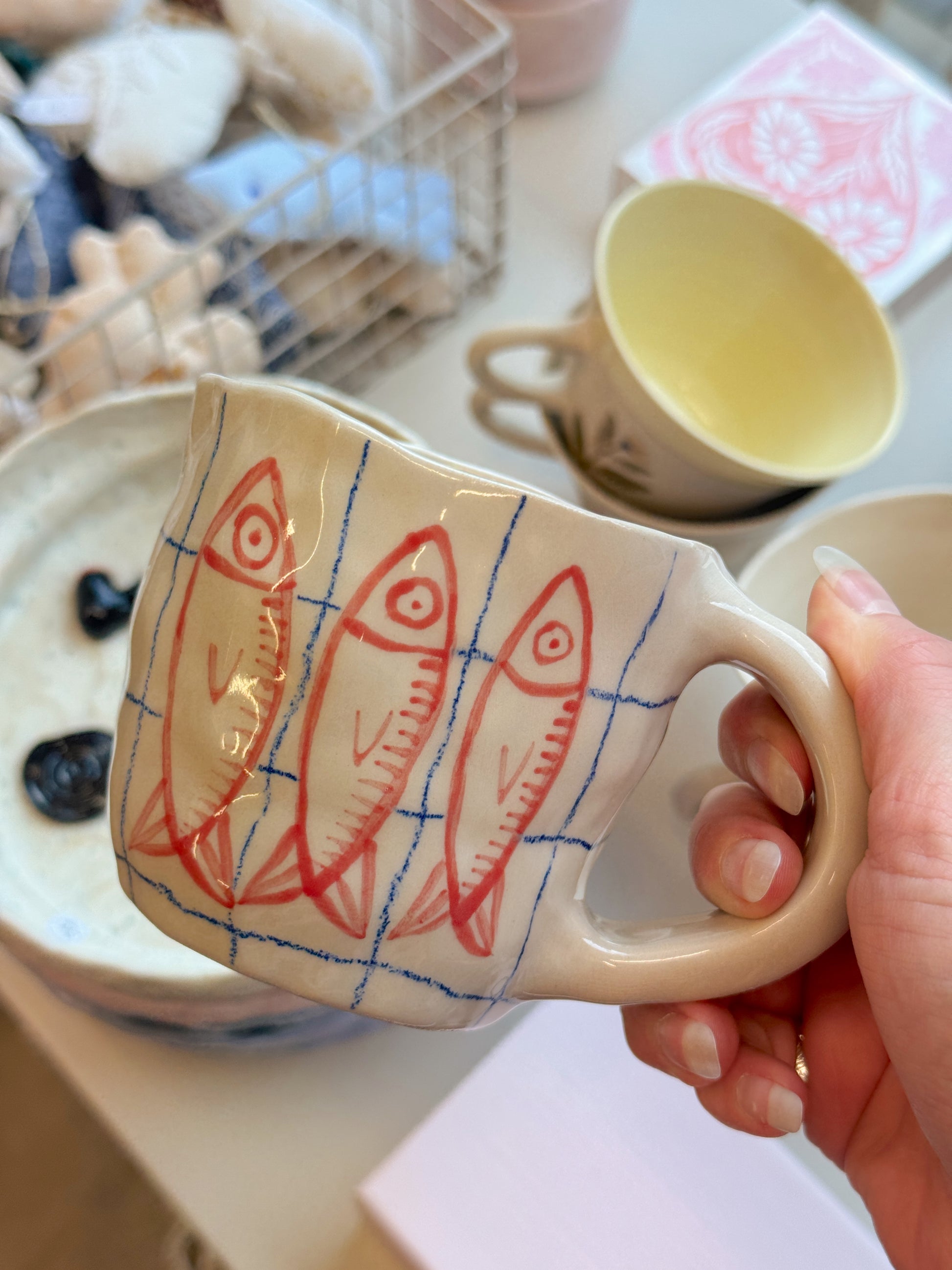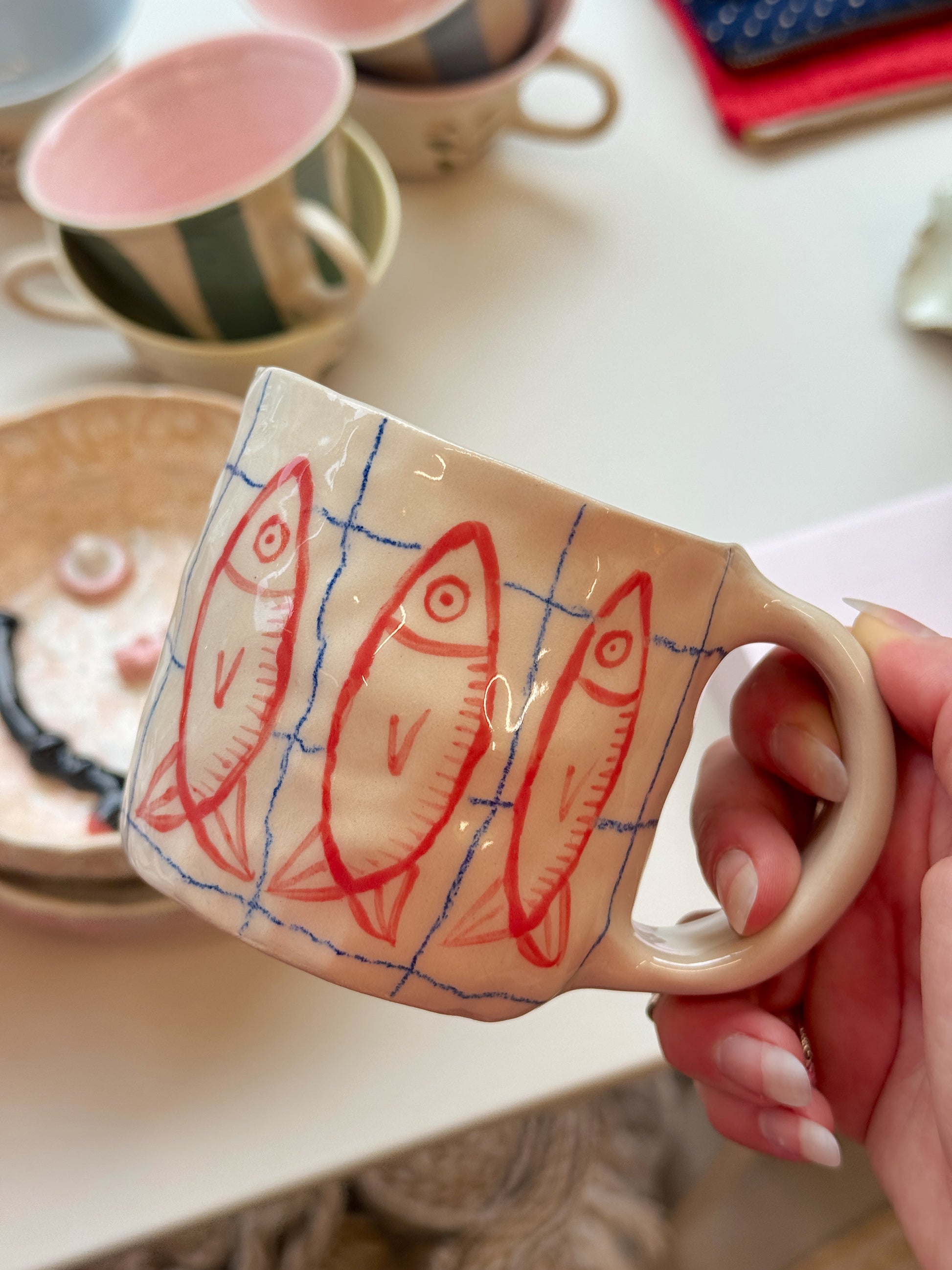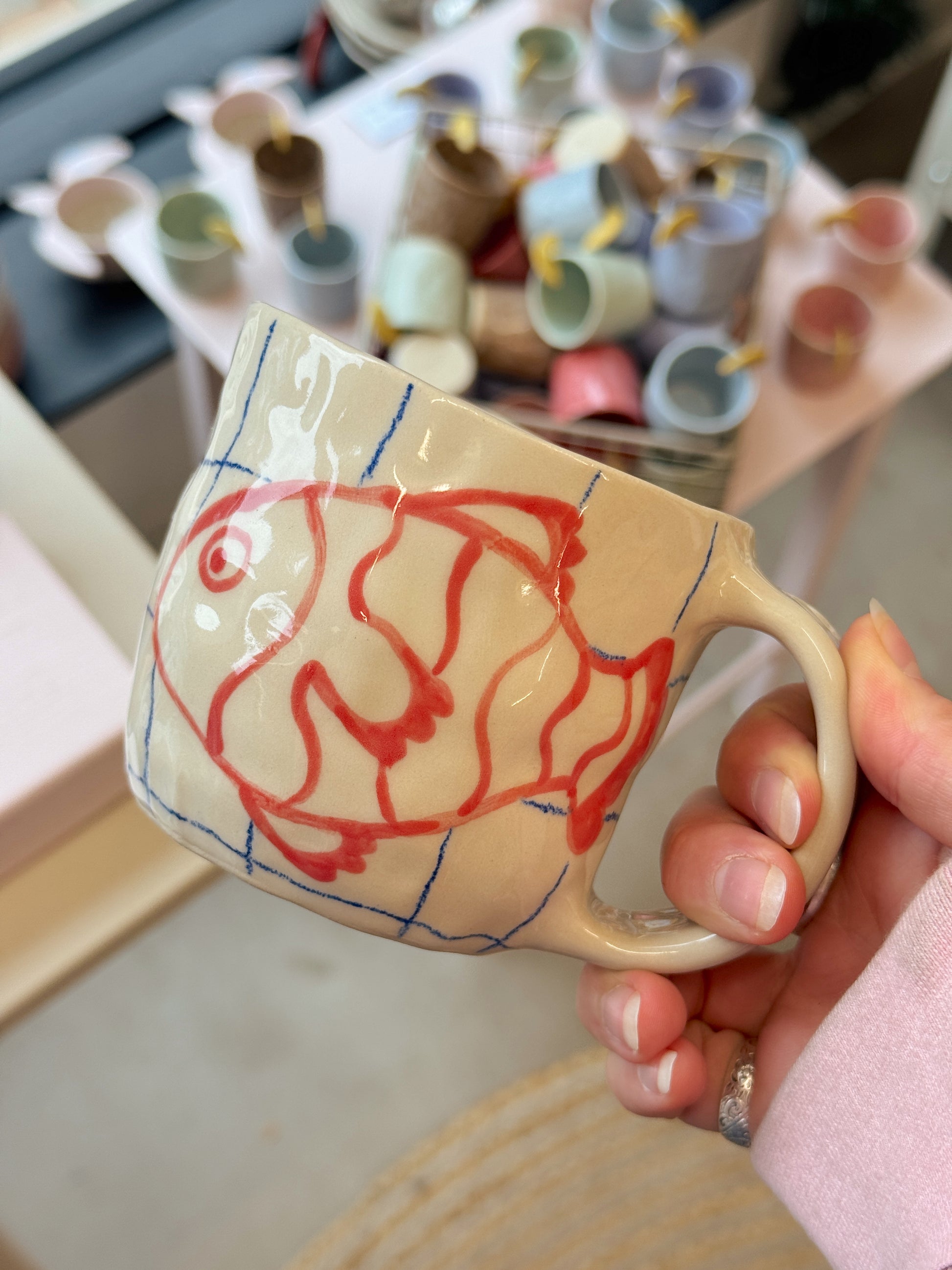 Håndformet og håndmalet kop med fisk af Alberte Hall. Alberte Hall håndformer alle hende produkter, hvorfor hver stage, kop eller kande bliver sin egen og helt unik.
