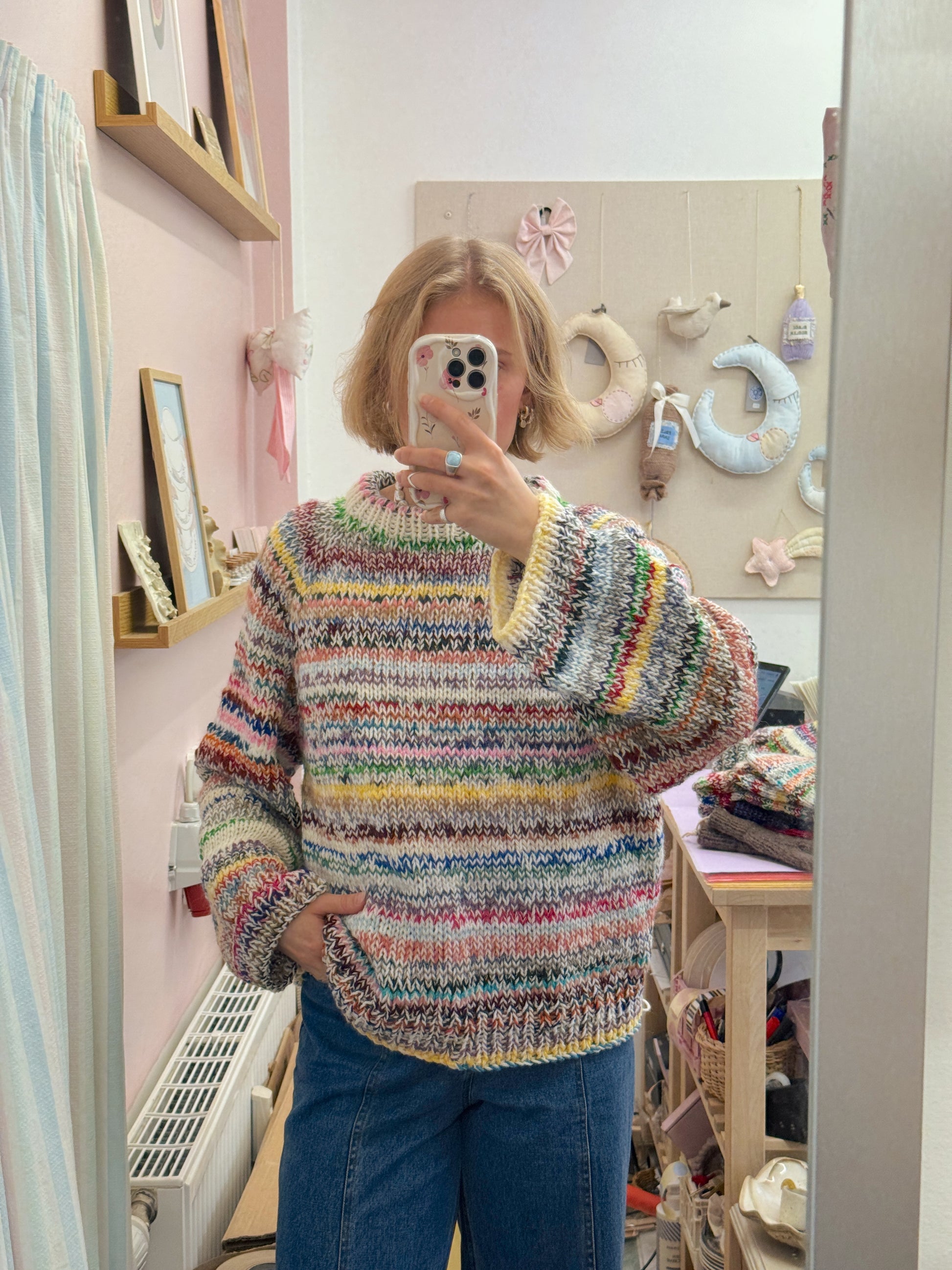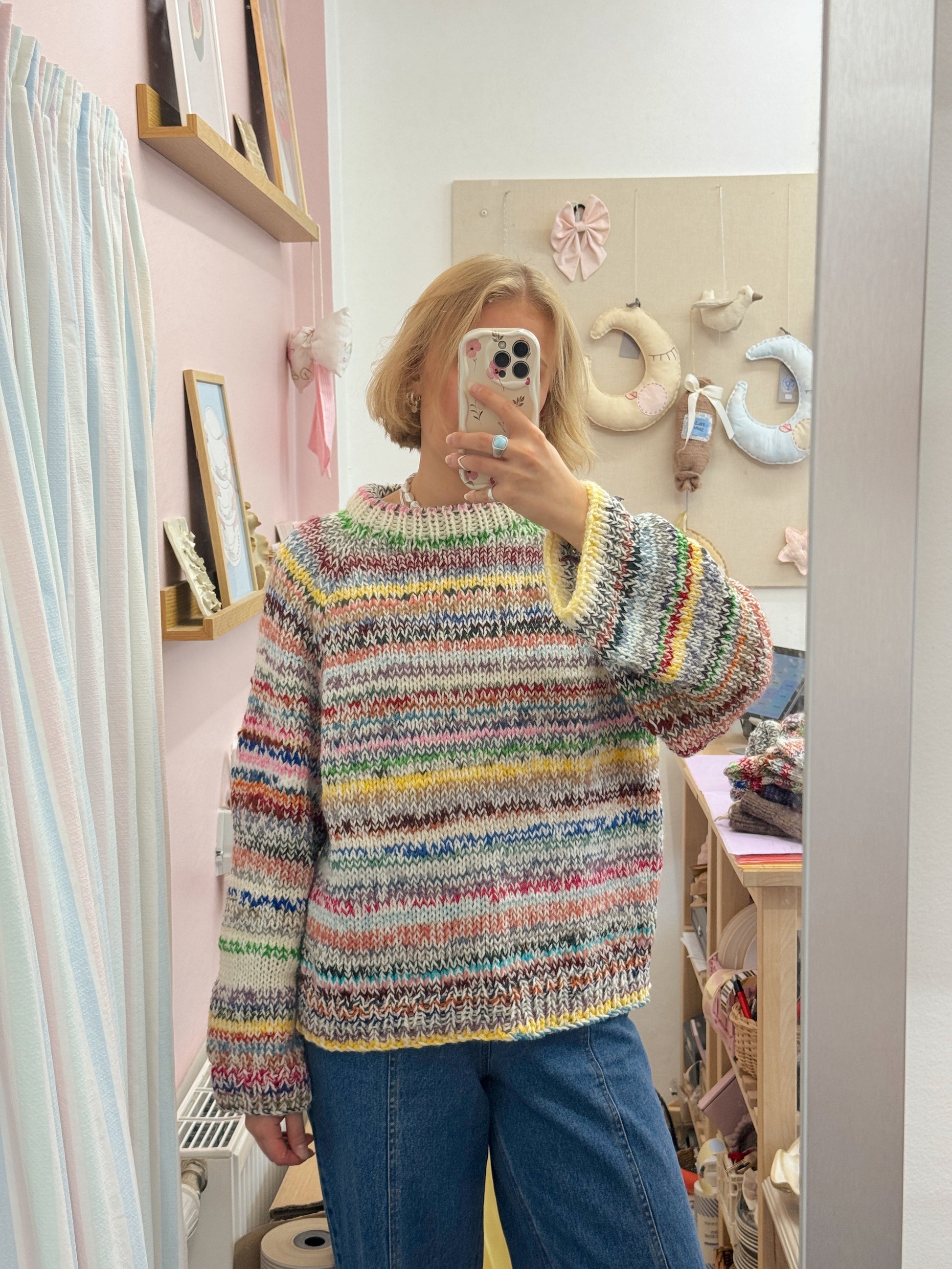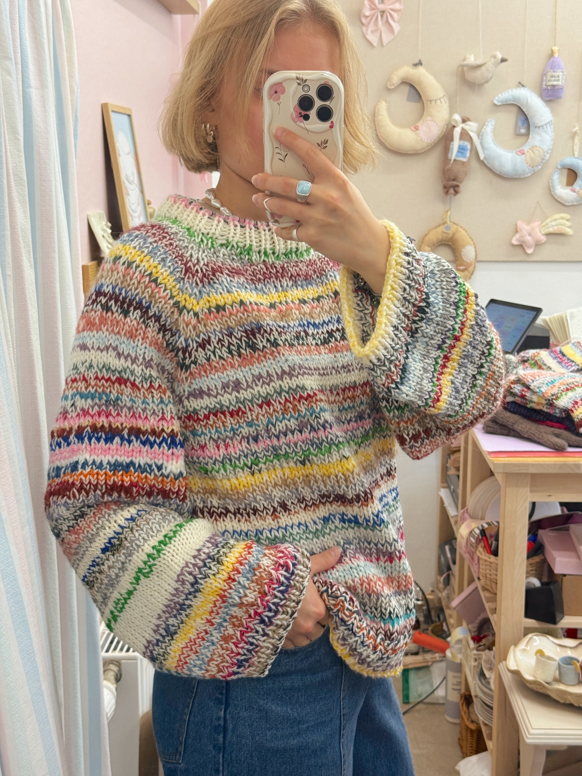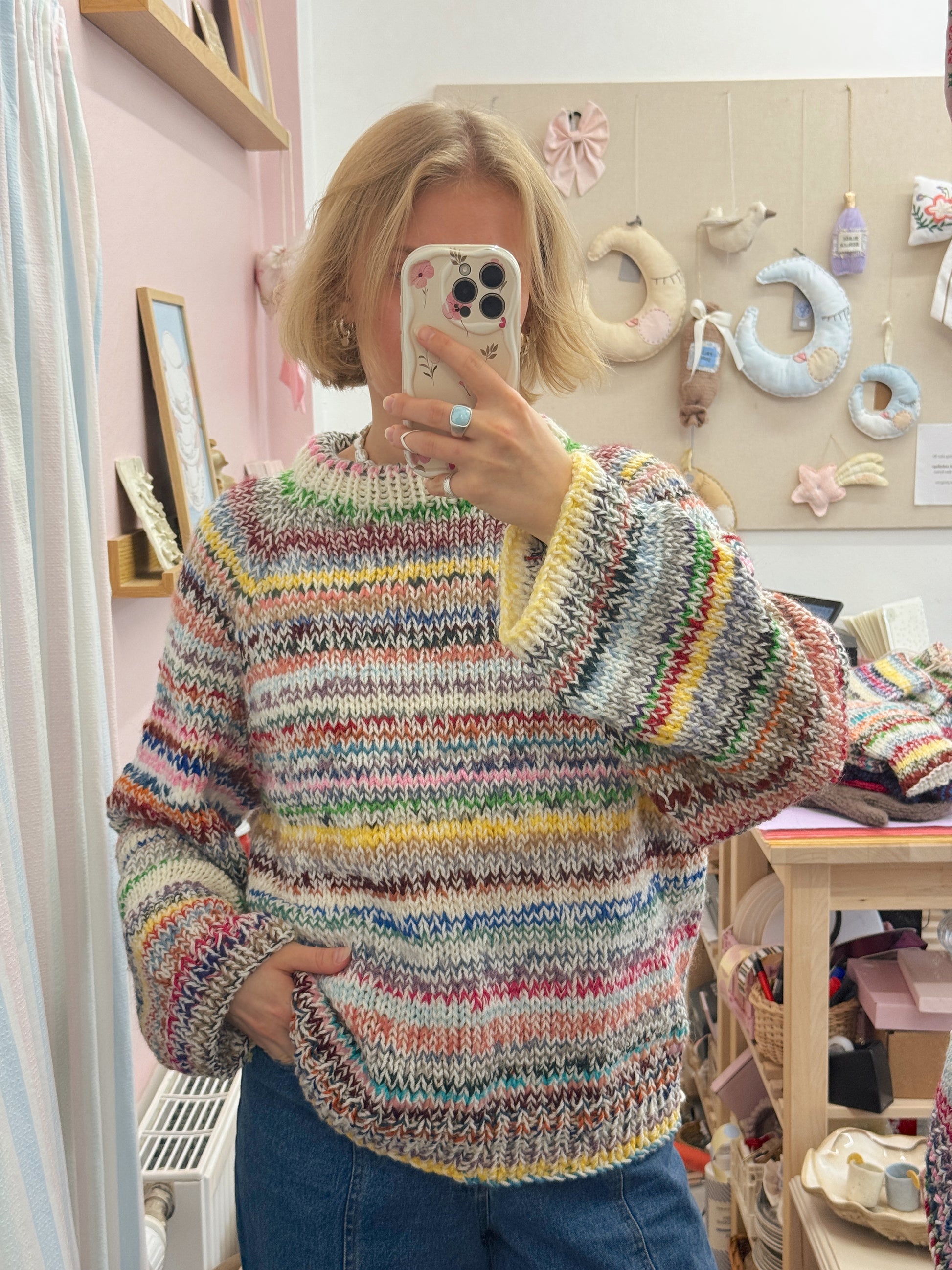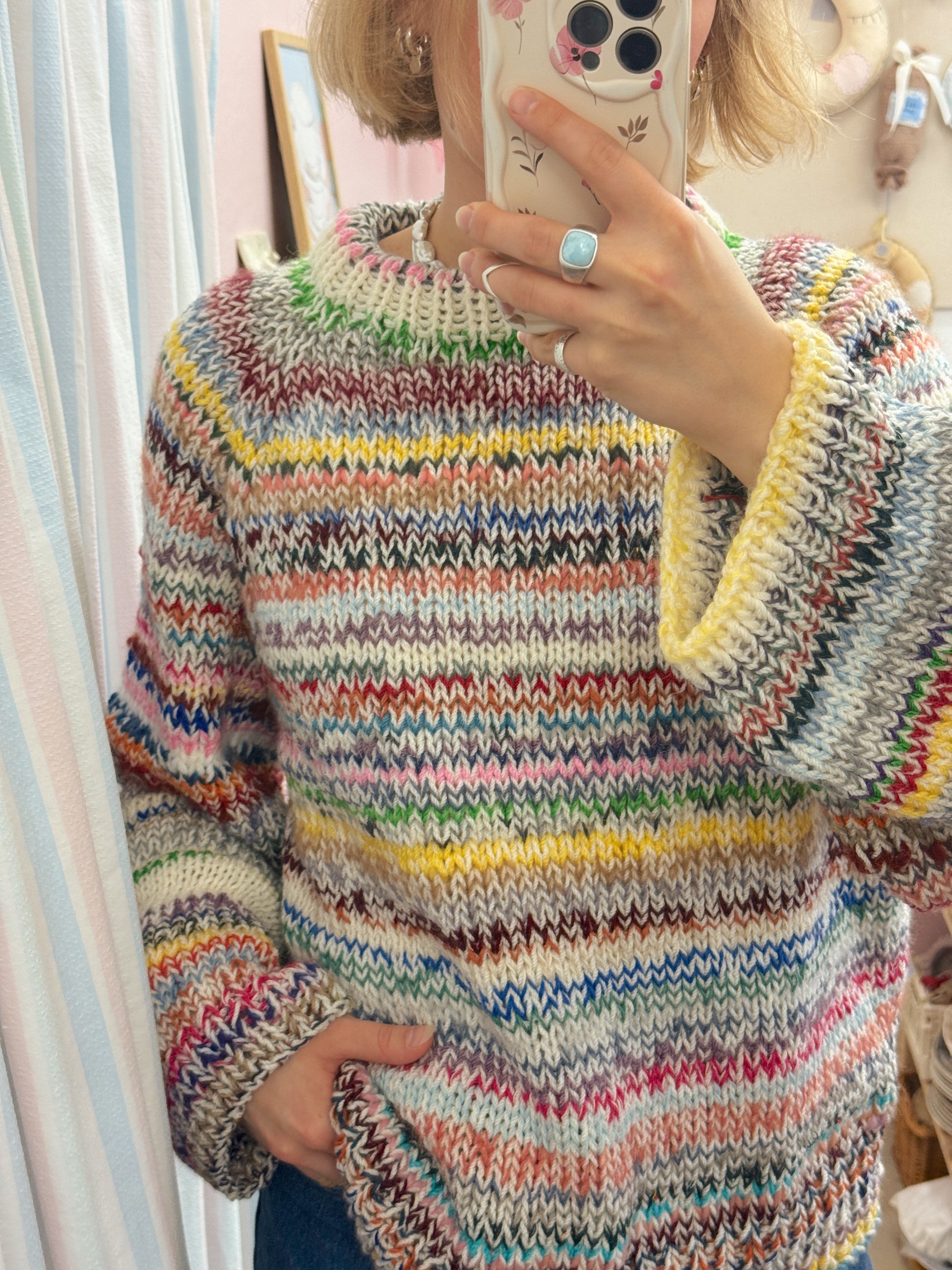 Striktrøje fra KC.Knitting, som strikker i genbrugsgarn. Den smukkeste multifarvede sag med vidde ærmer. Fås i flere størrelser og varianter.