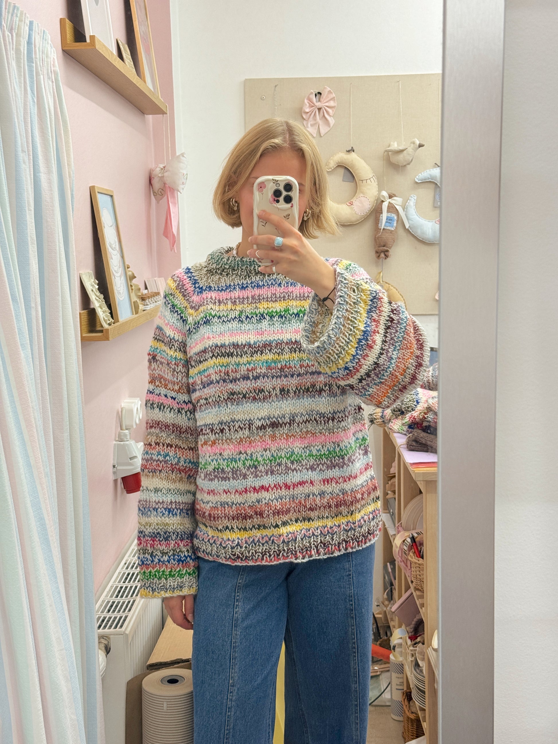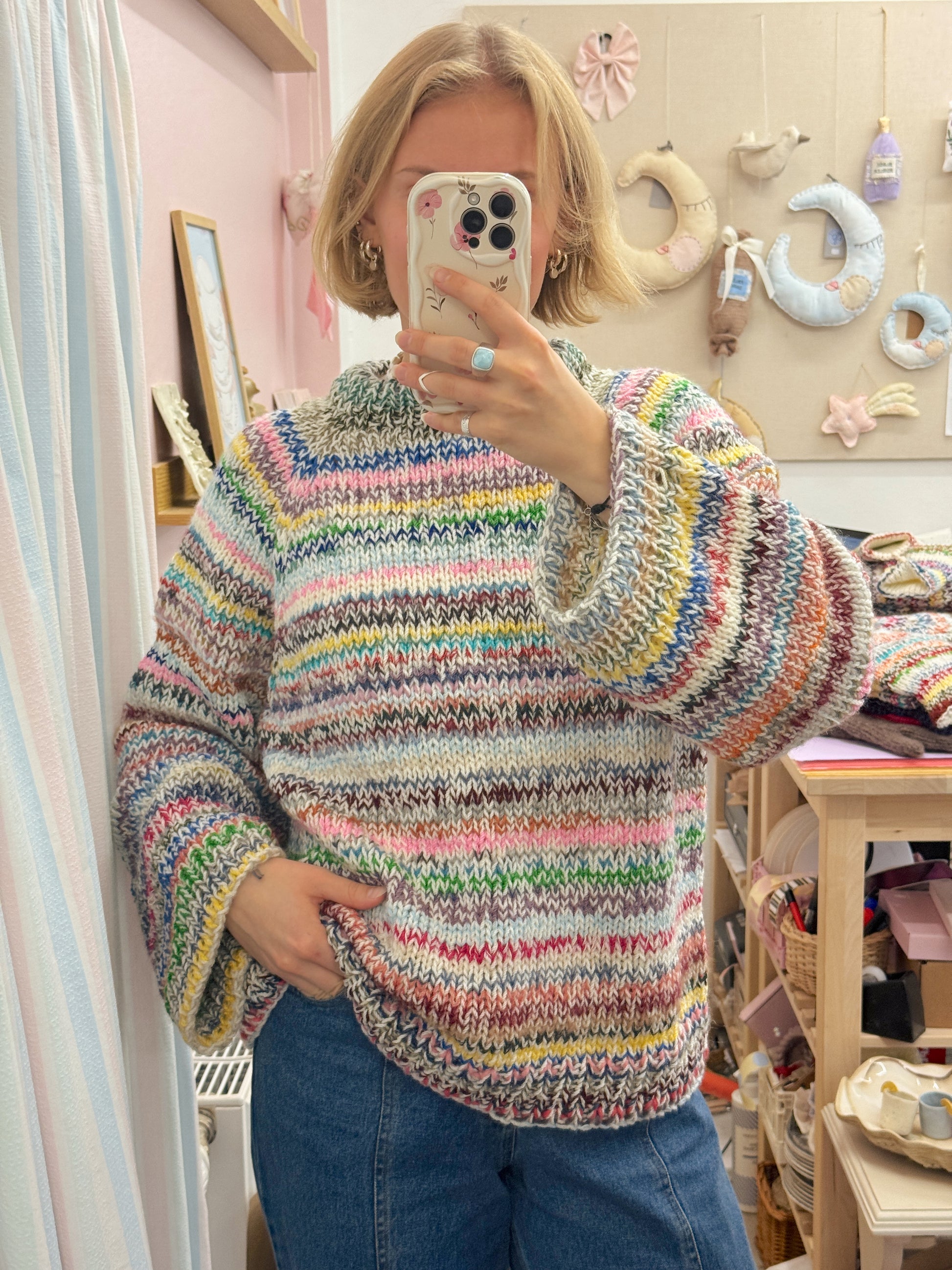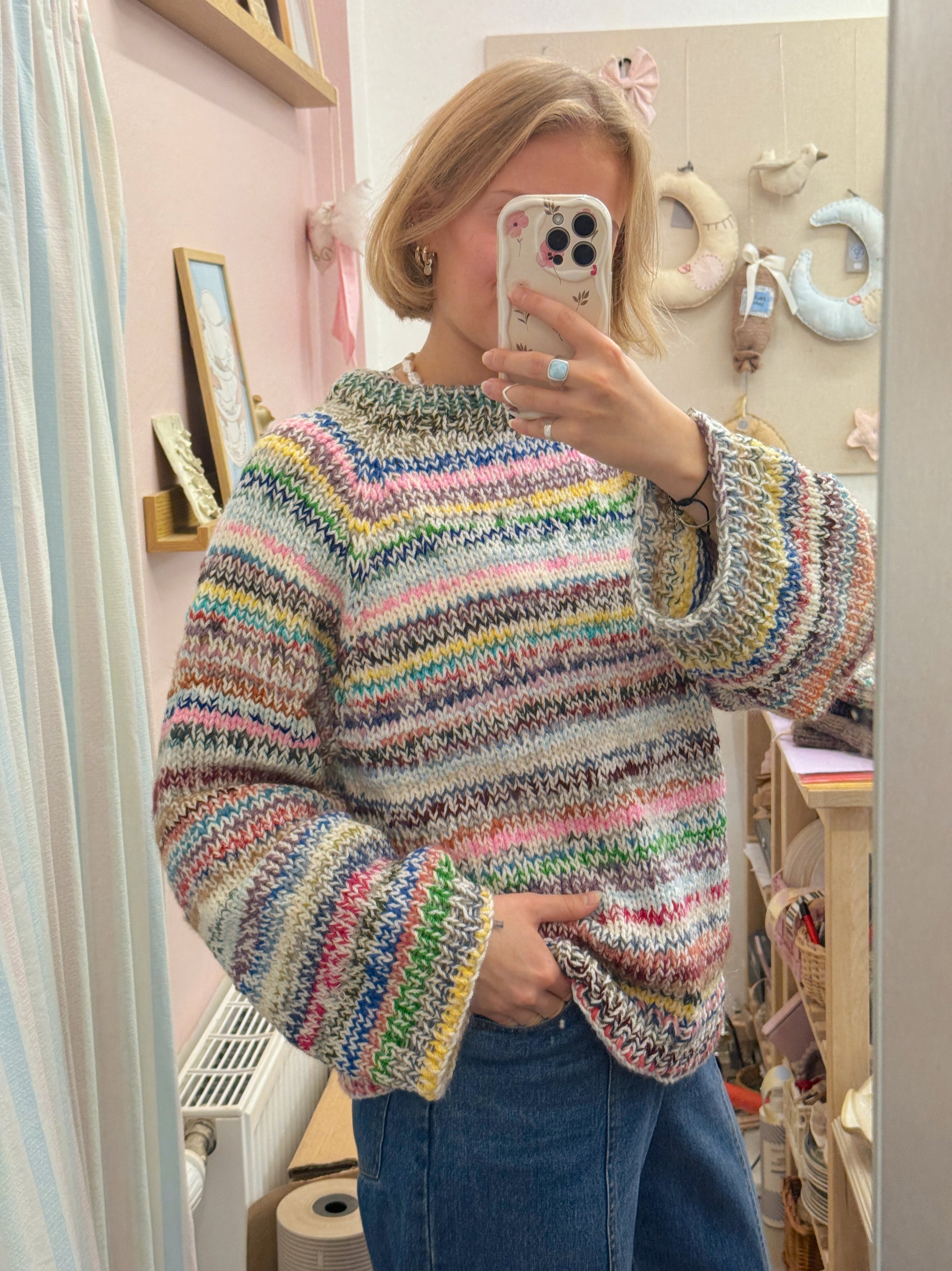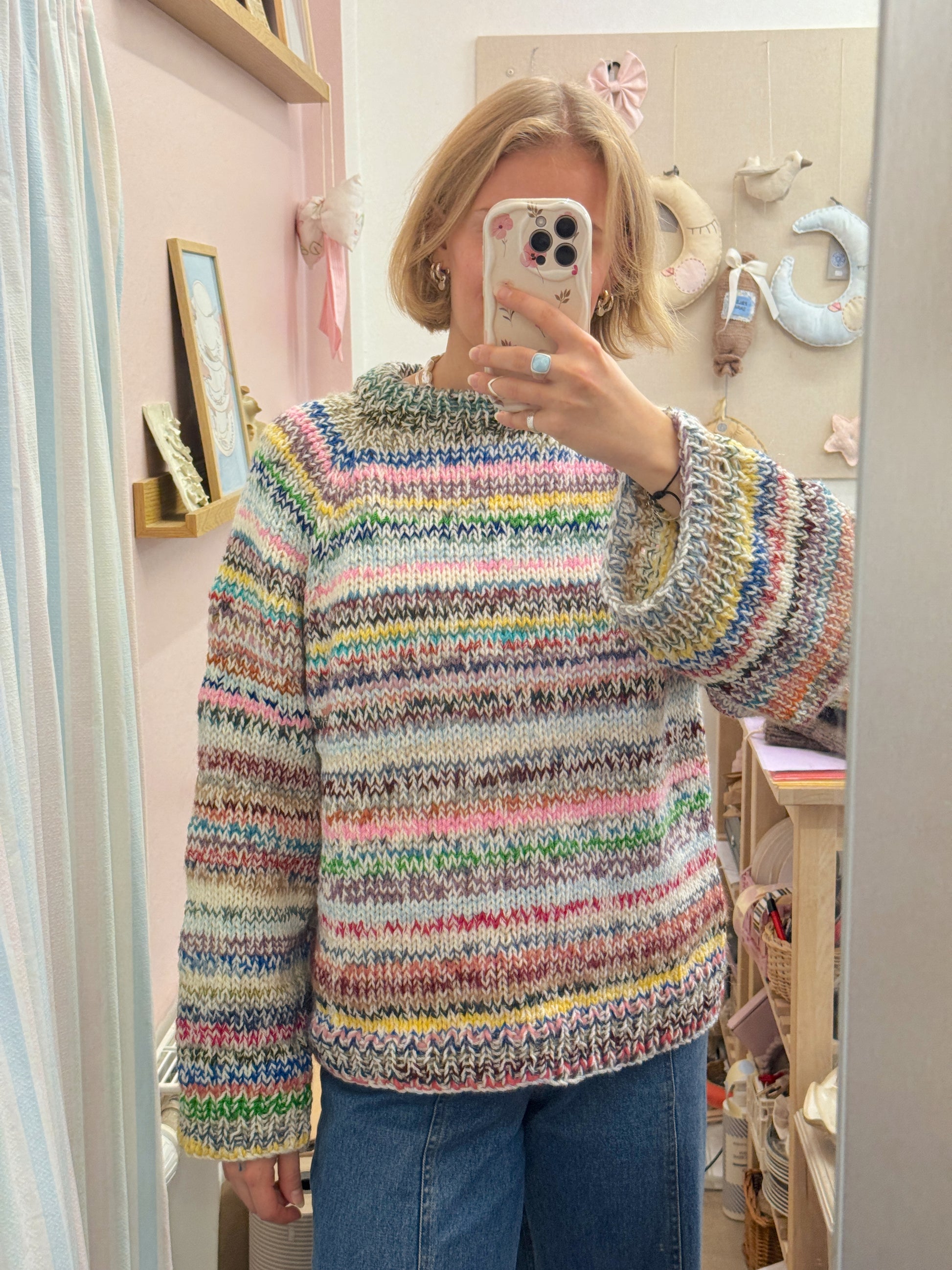 Striktrøje fra KC.Knitting, som strikker i genbrugsgarn. Den smukkeste multifarvede sag med vidde ærmer. Fås i flere størrelser og varianter.