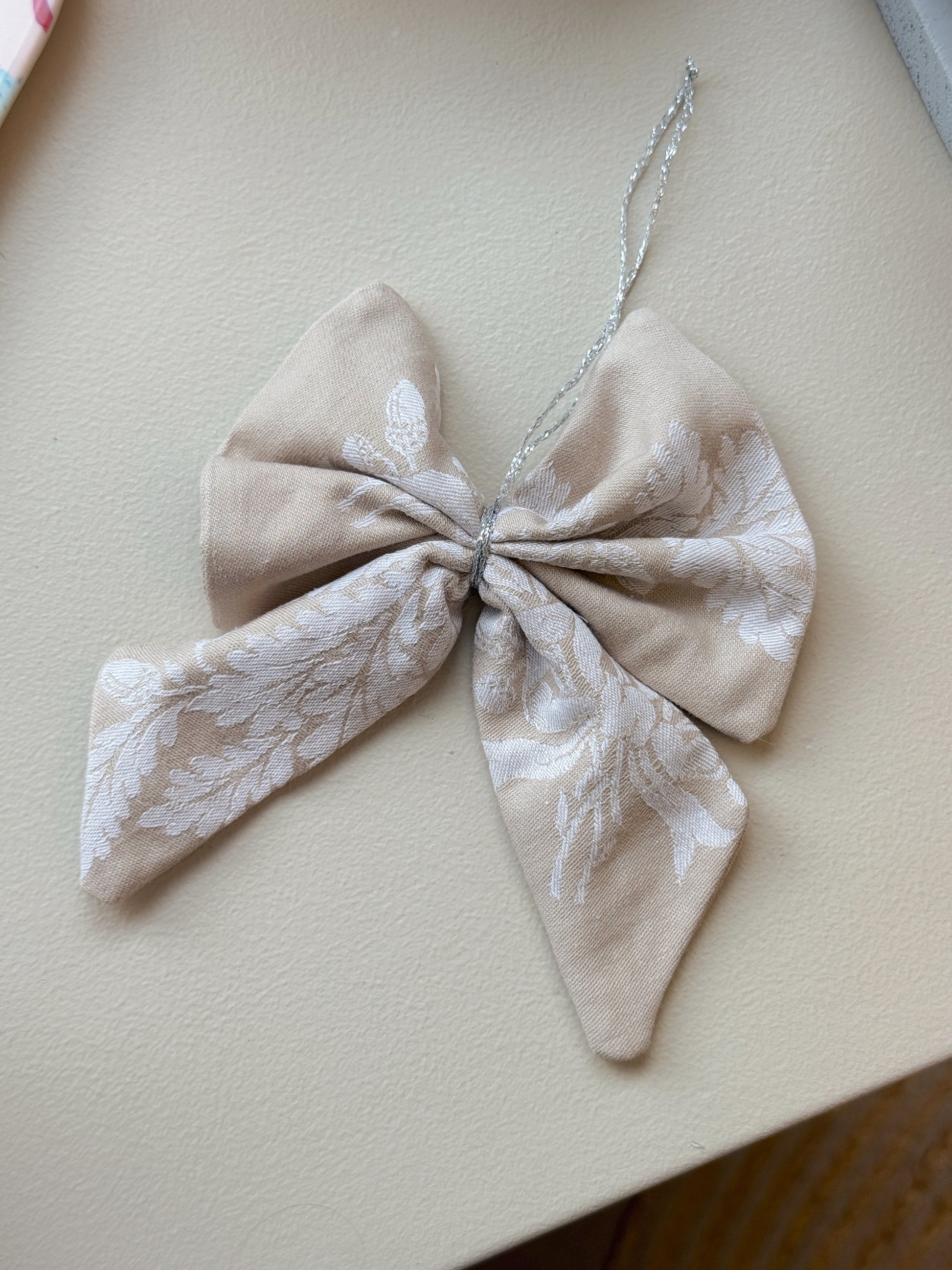 Pyntesløjfe fremstillet af vintagetekstil. Pyntesløjfen kan tilføjes til boligindretningen, på døren eller vitrineskabet, på opslagstavlen eller som julepynt i juletiden.