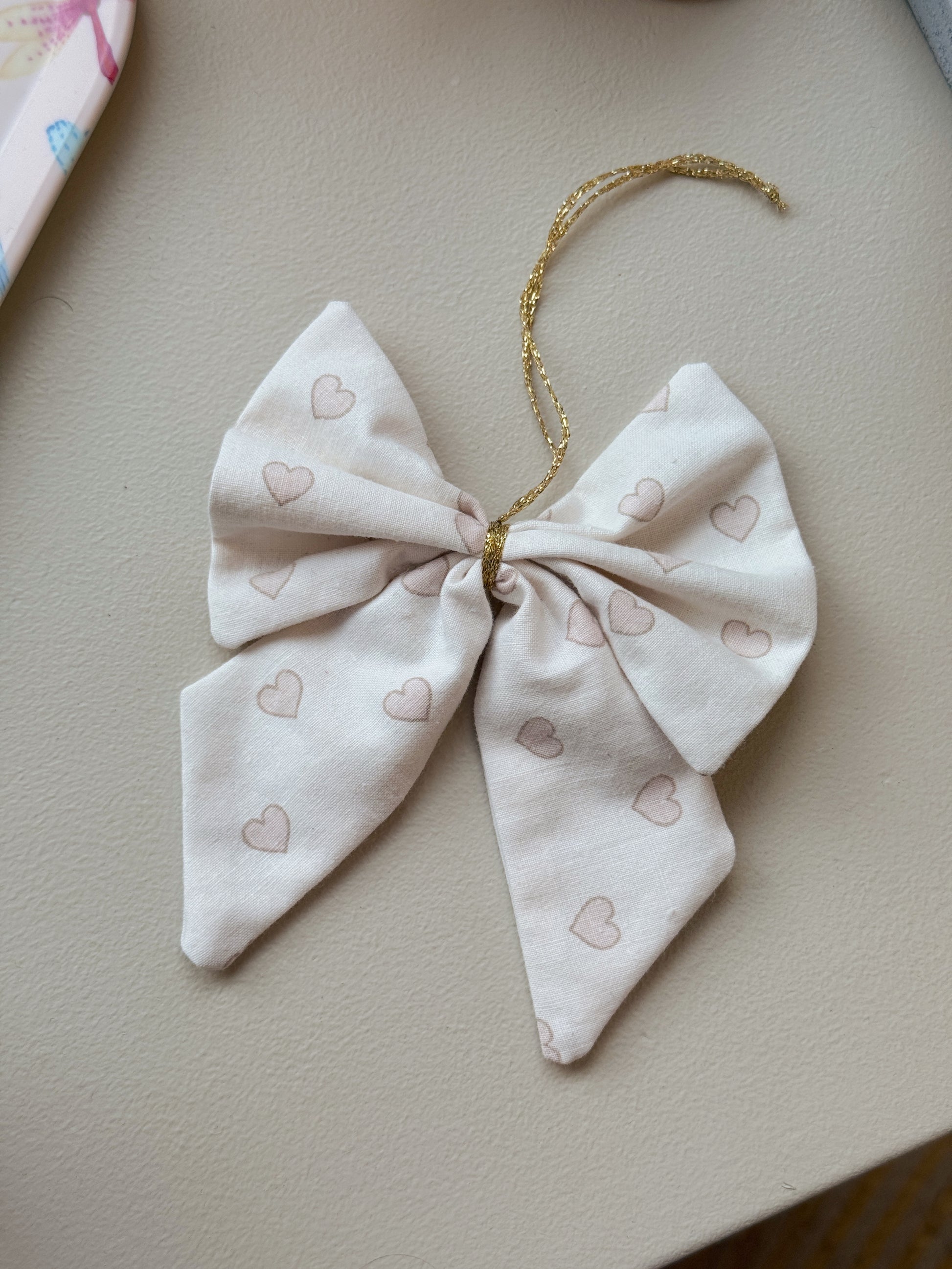 Pyntesløjfe fremstillet af vintagetekstil. Pyntesløjfen kan tilføjes til boligindretningen, på døren eller vitrineskabet, på opslagstavlen eller som julepynt i juletiden.