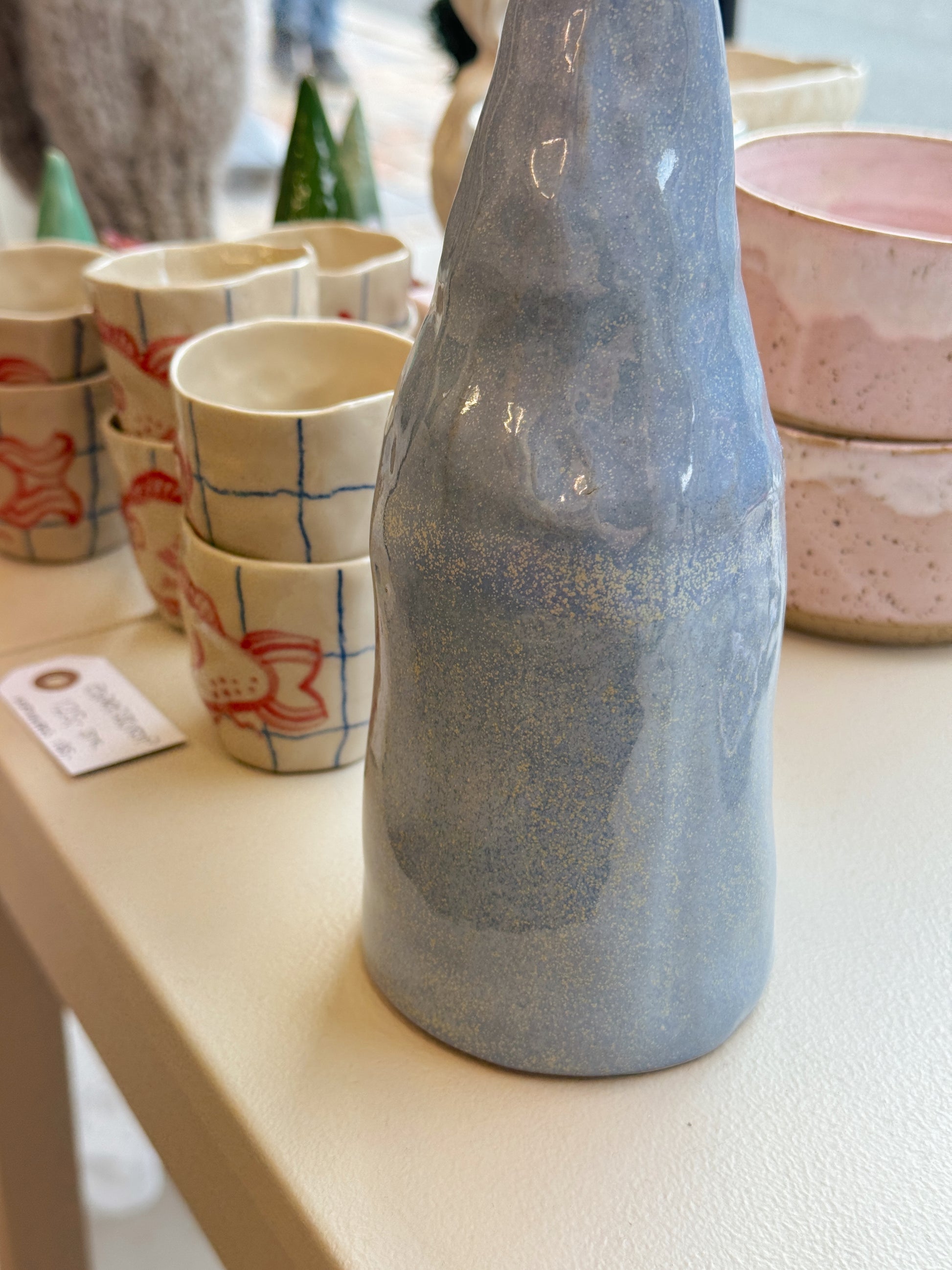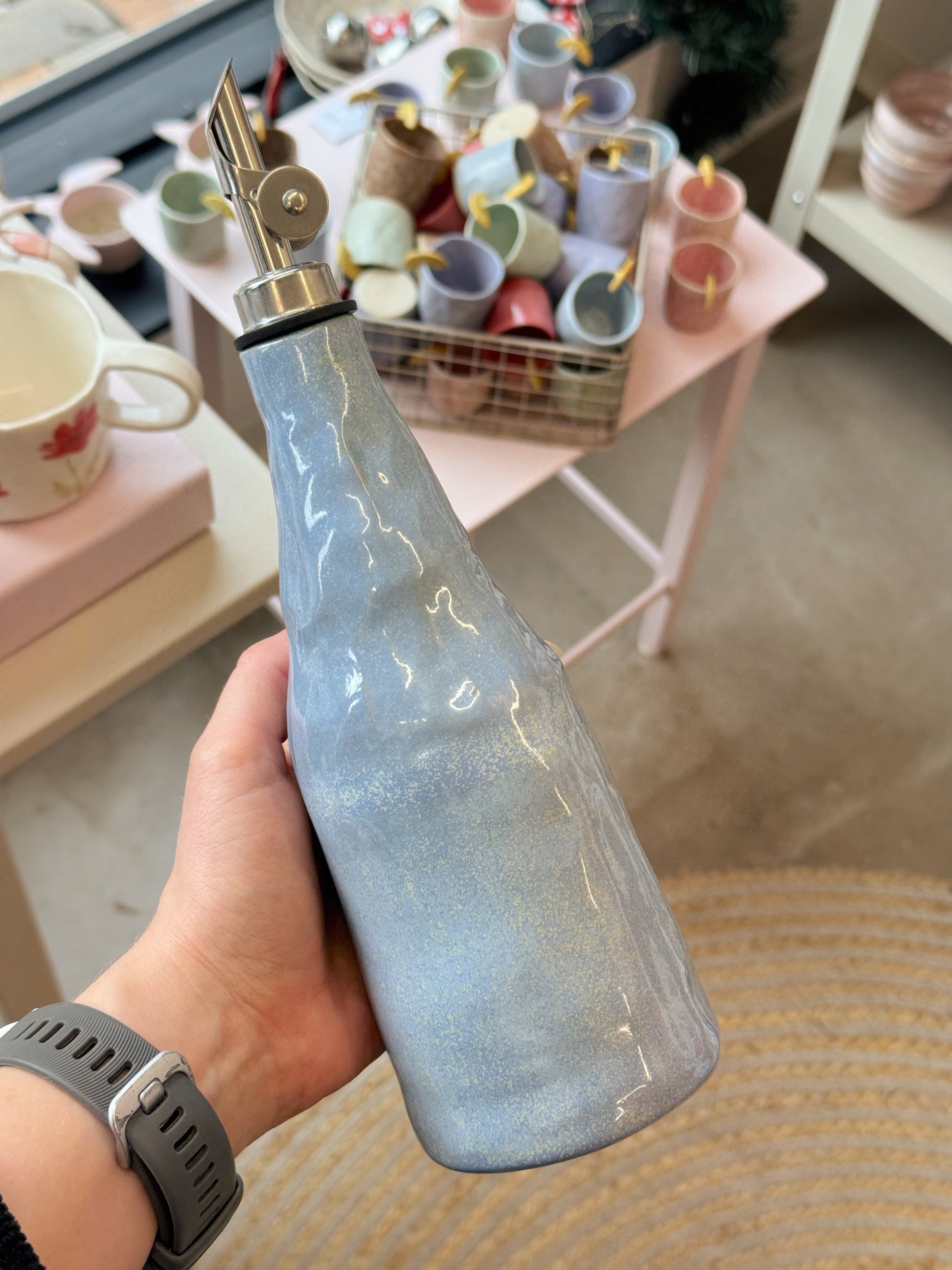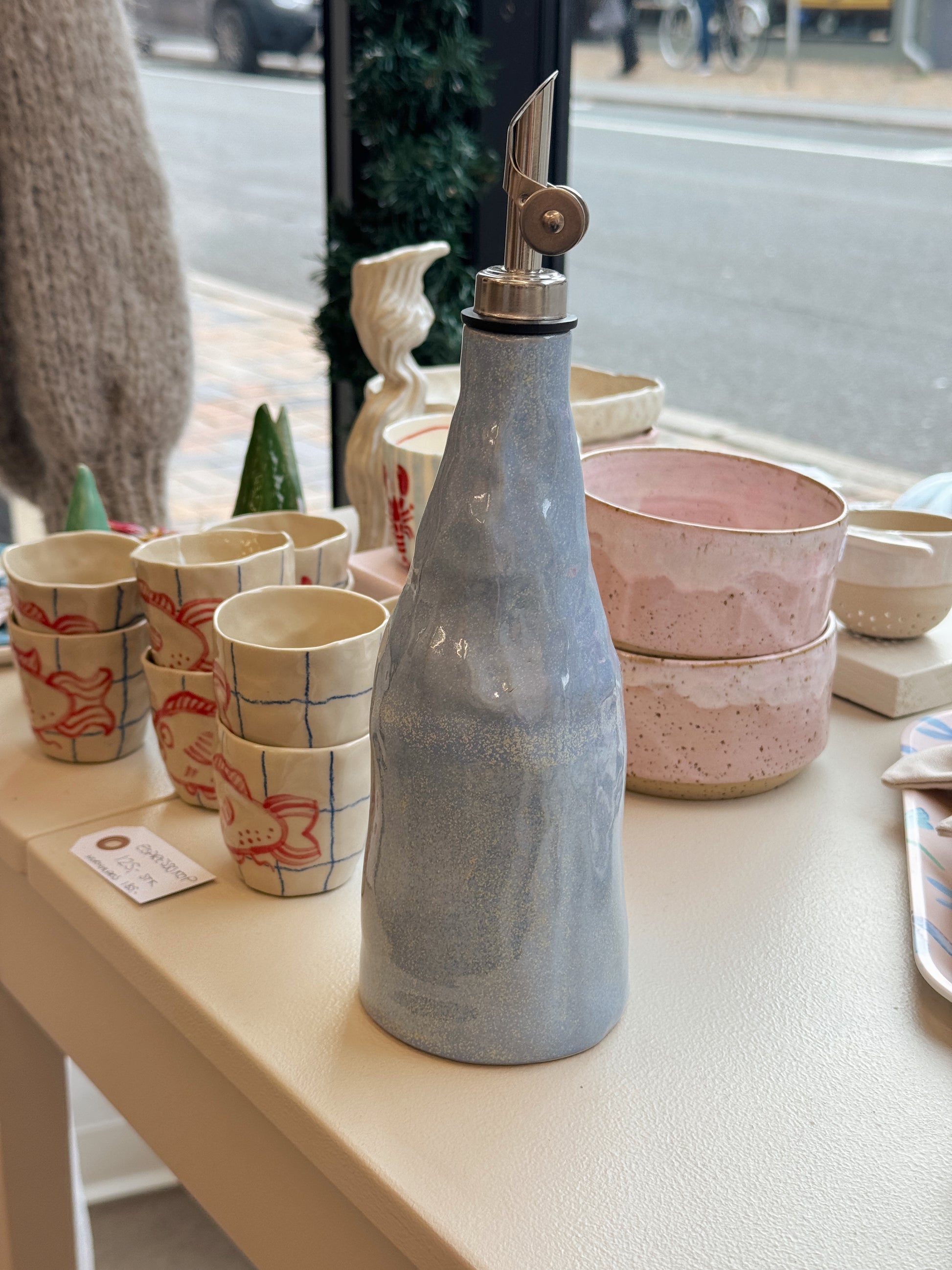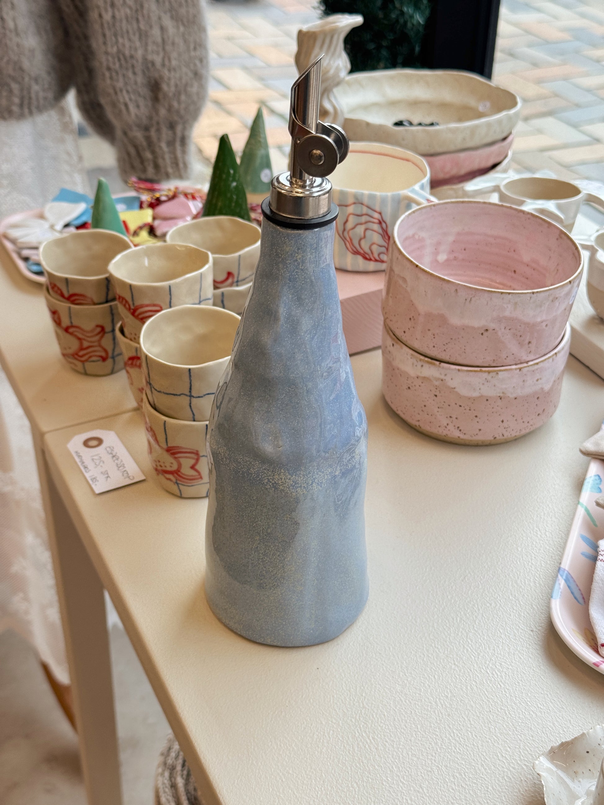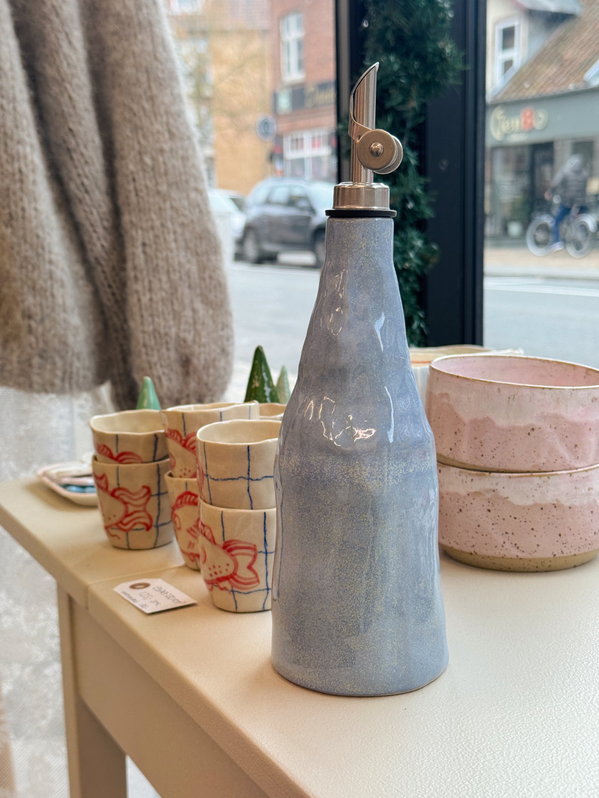 Olieflaske af Alberte Hall. Alberte Hall håndformer alle hende produkter, hvorfor hver stage, kop eller kande bliver sin egen og helt unik.