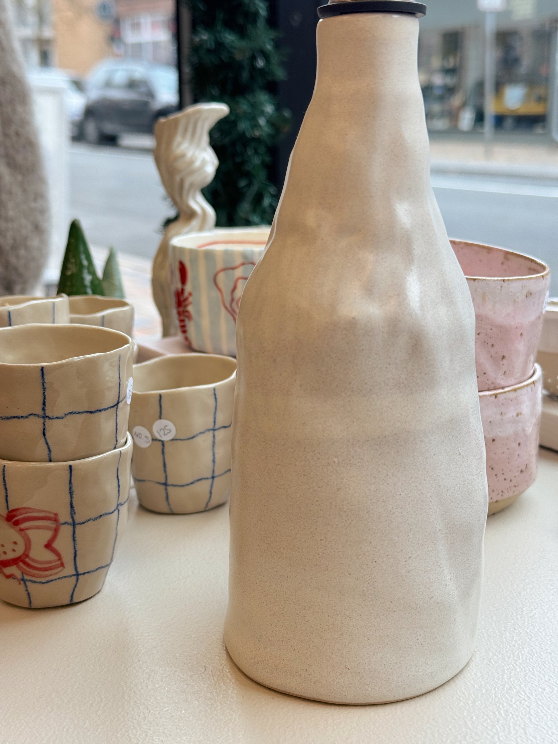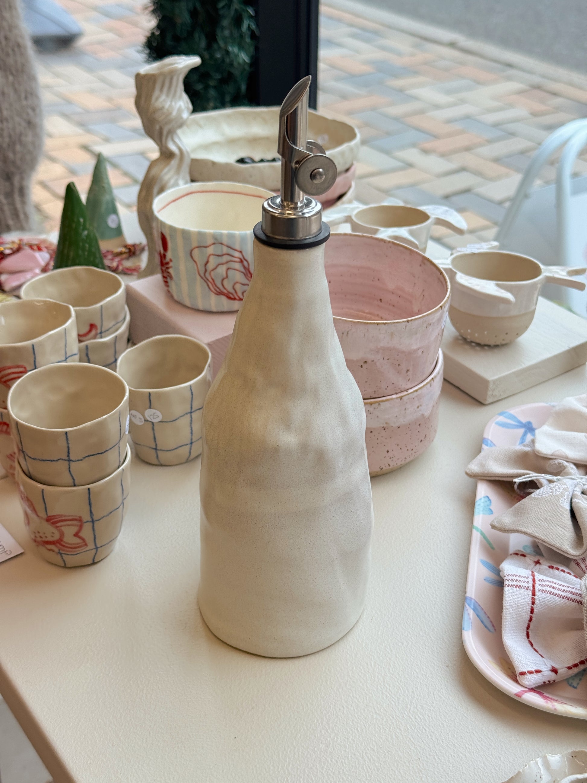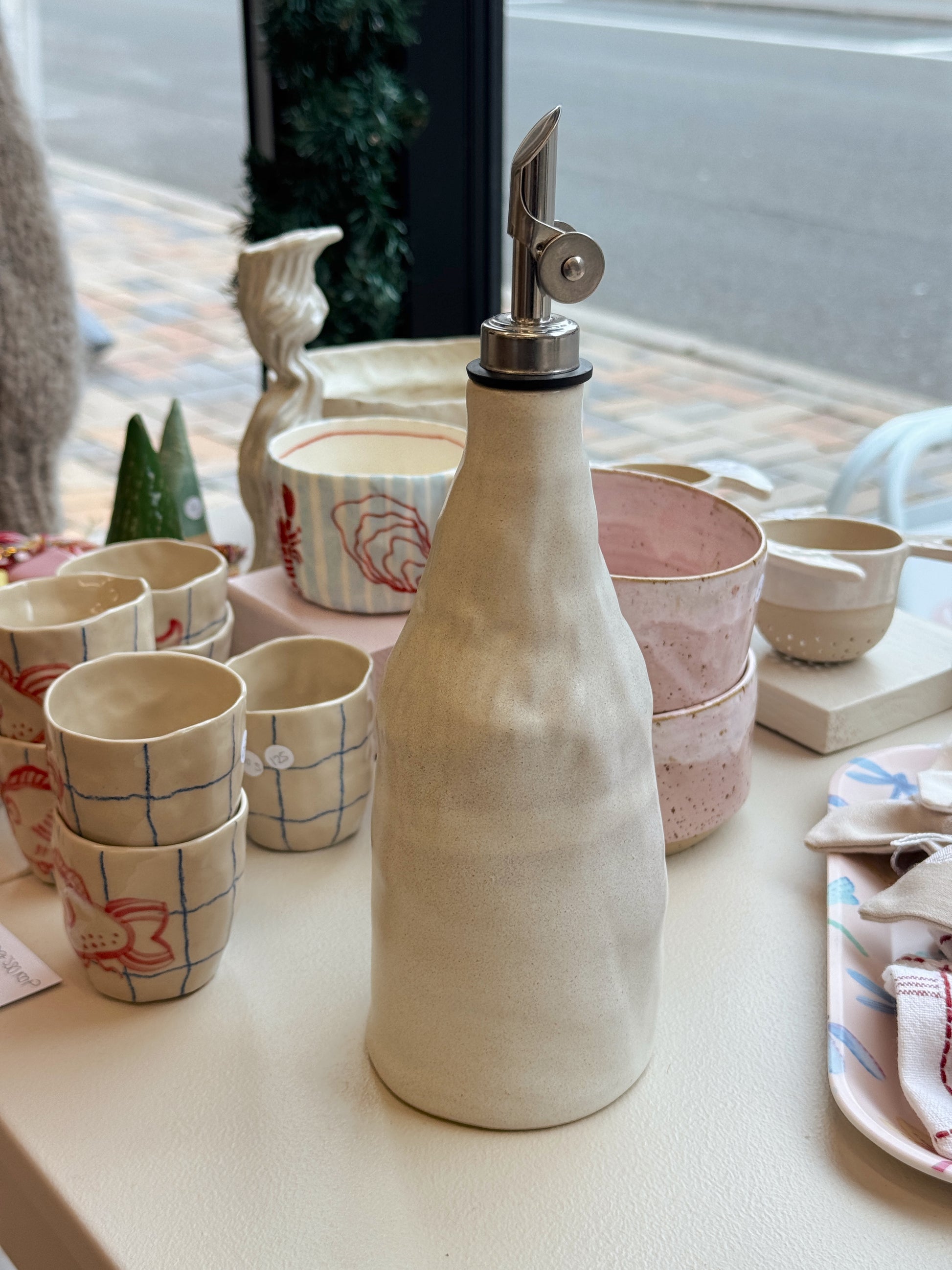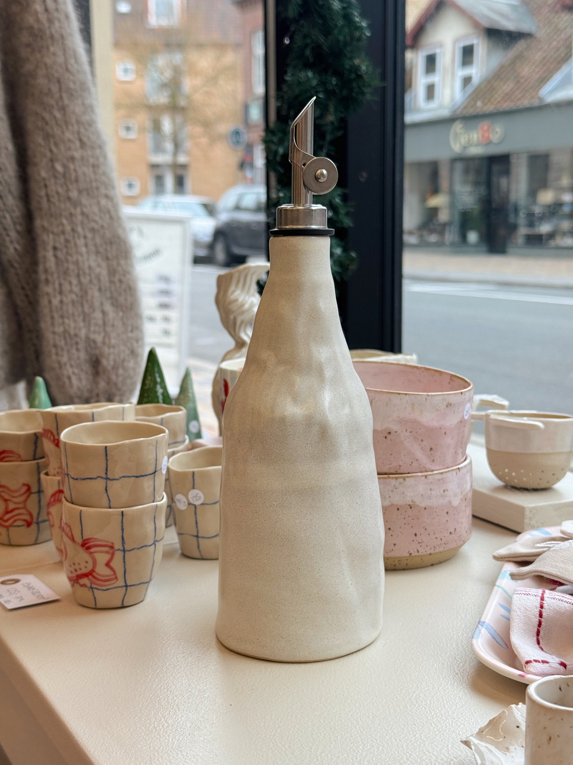 Olieflaske af Alberte Hall. Alberte Hall håndformer alle hende produkter, hvorfor hver stage, kop eller kande bliver sin egen og helt unik.