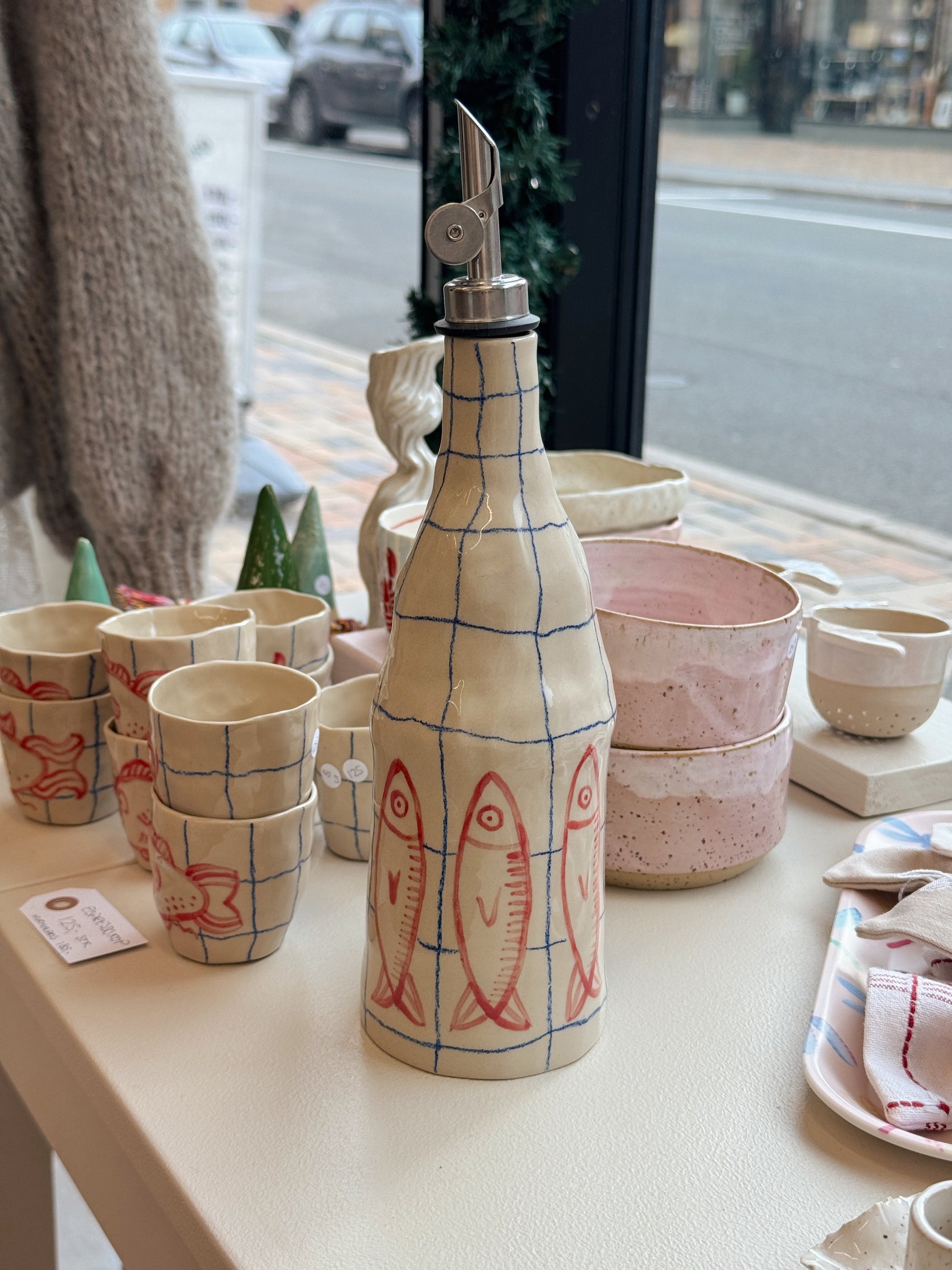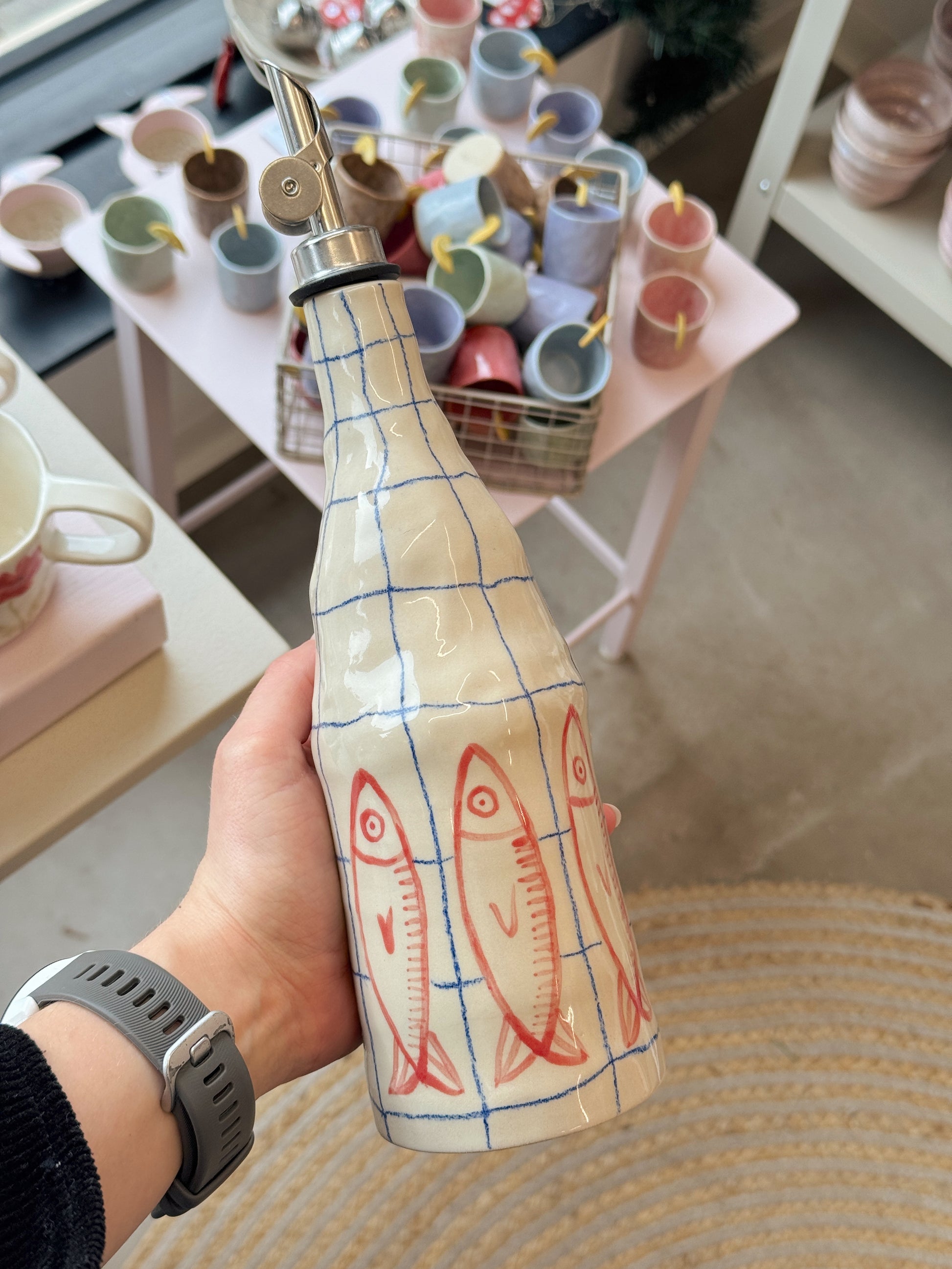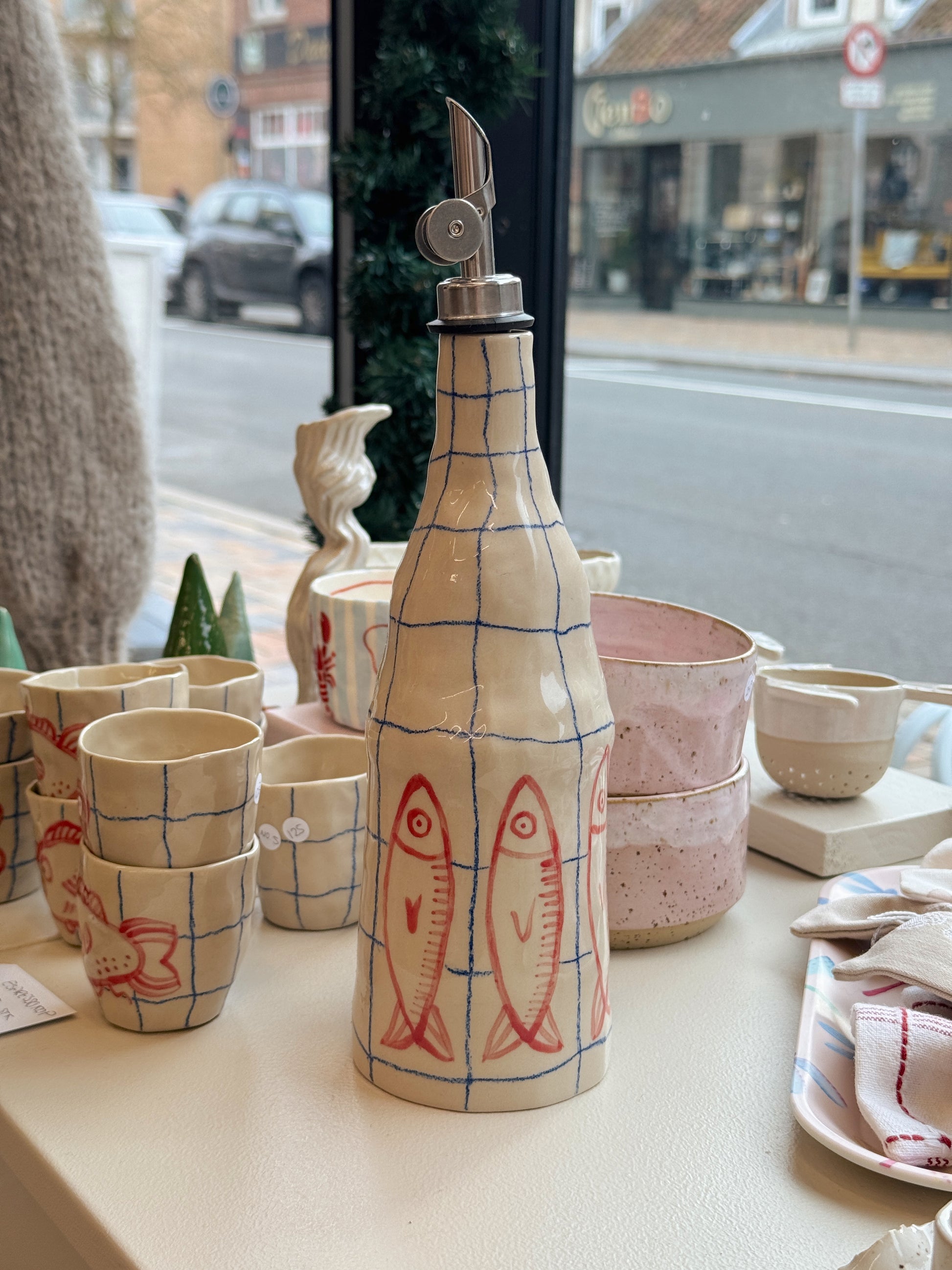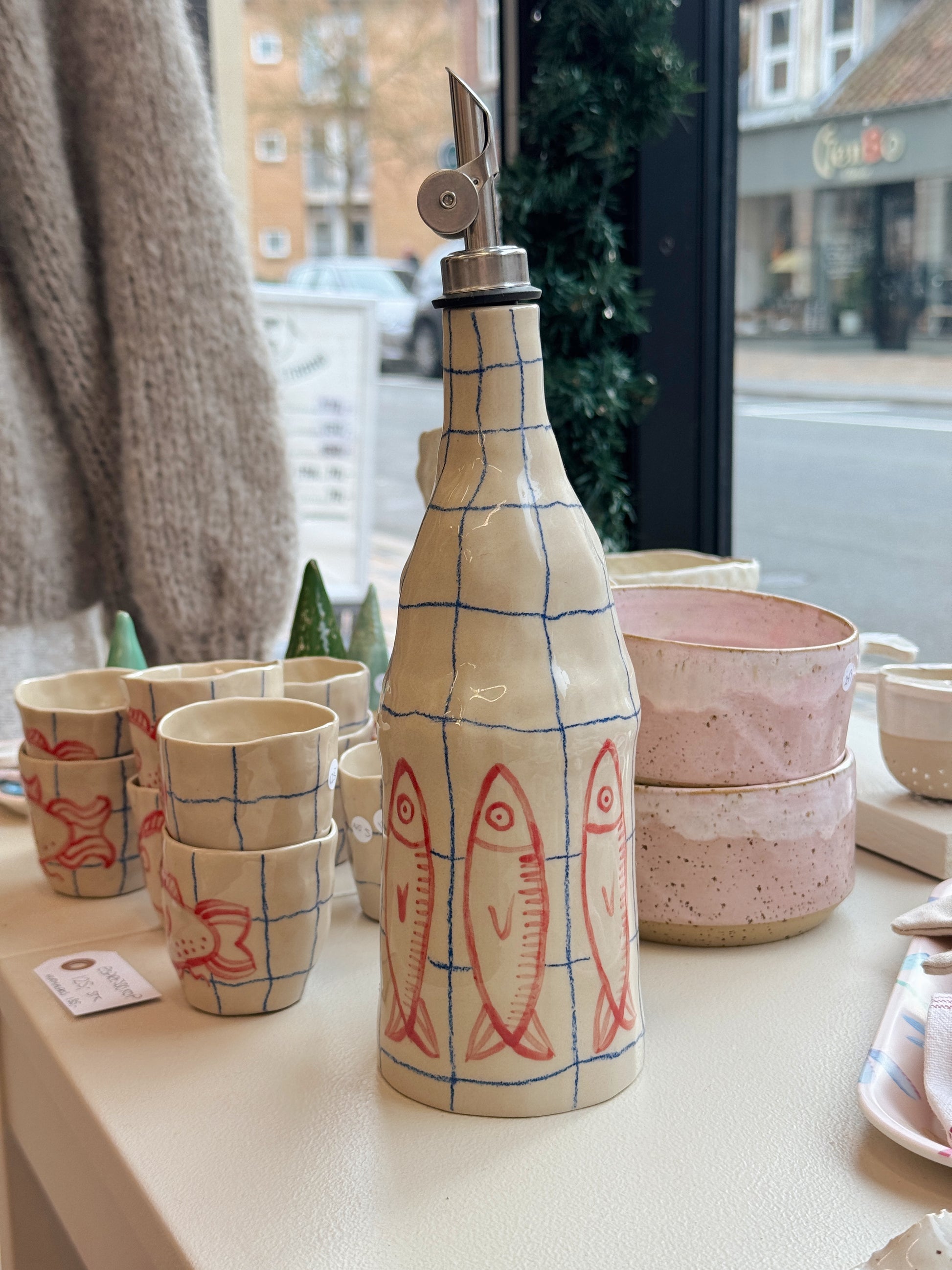 Olieflaske af Alberte Hall. Alberte Hall håndformer alle hende produkter, hvorfor hver stage, kop eller kande bliver sin egen og helt unik.