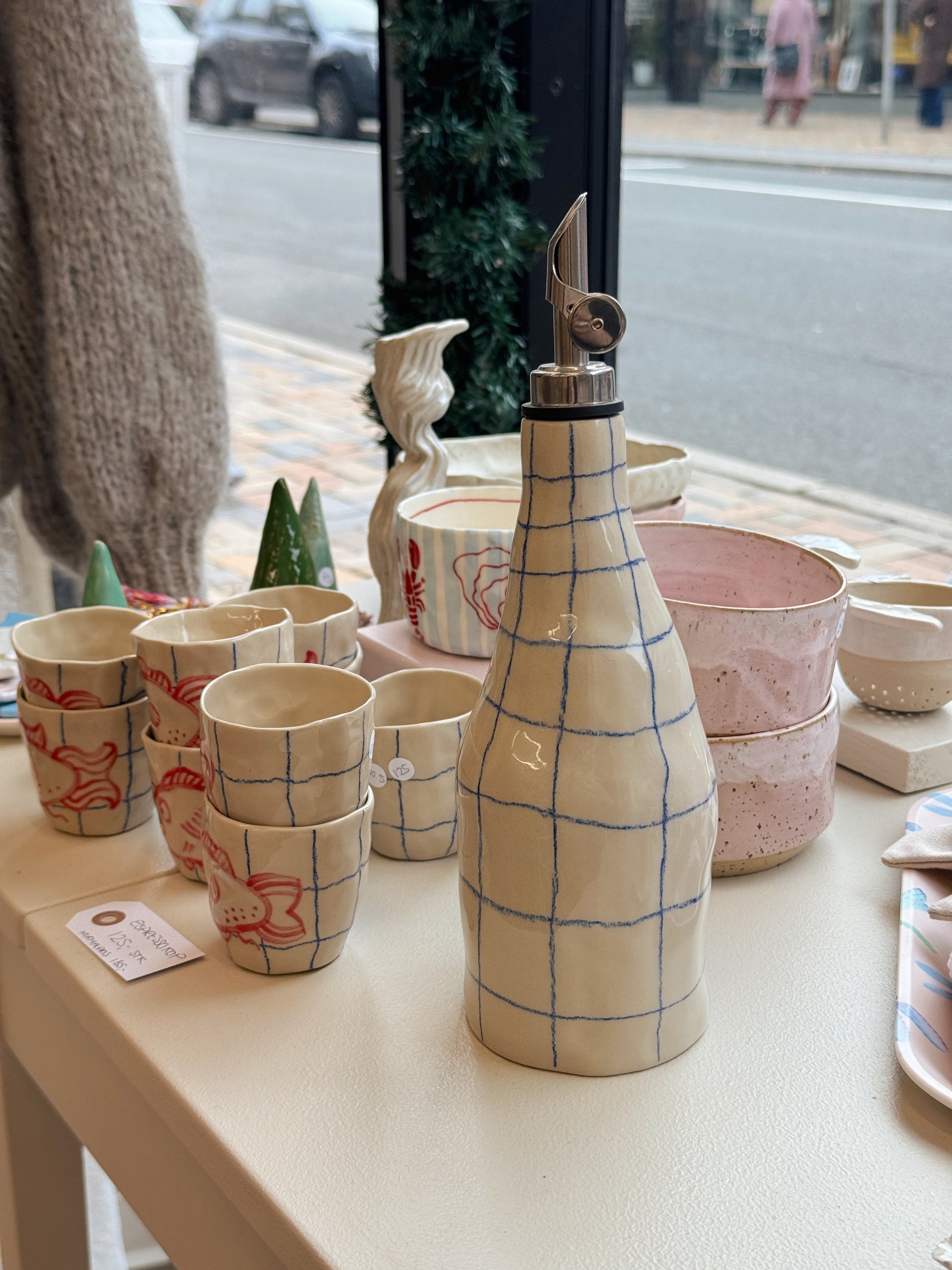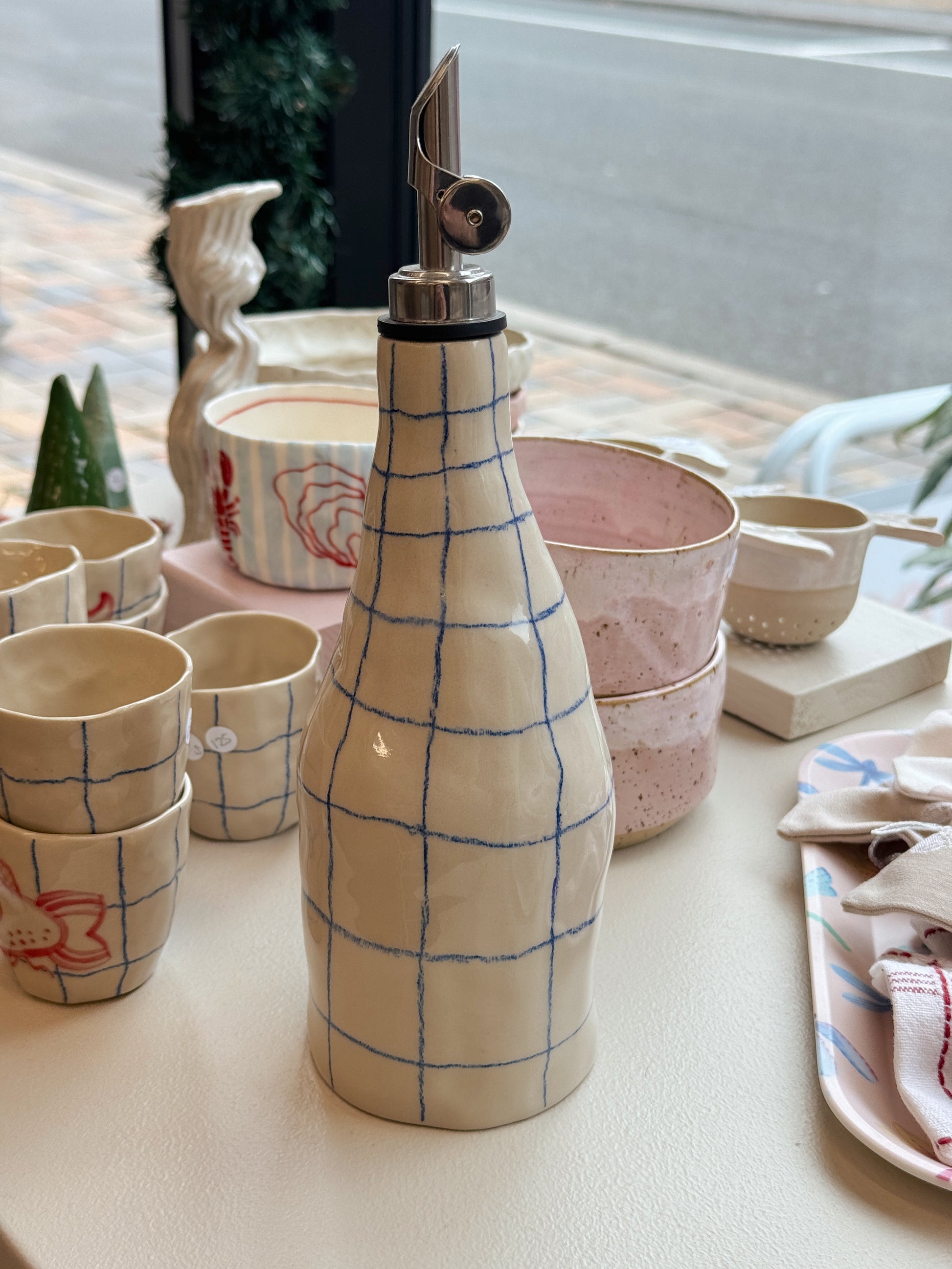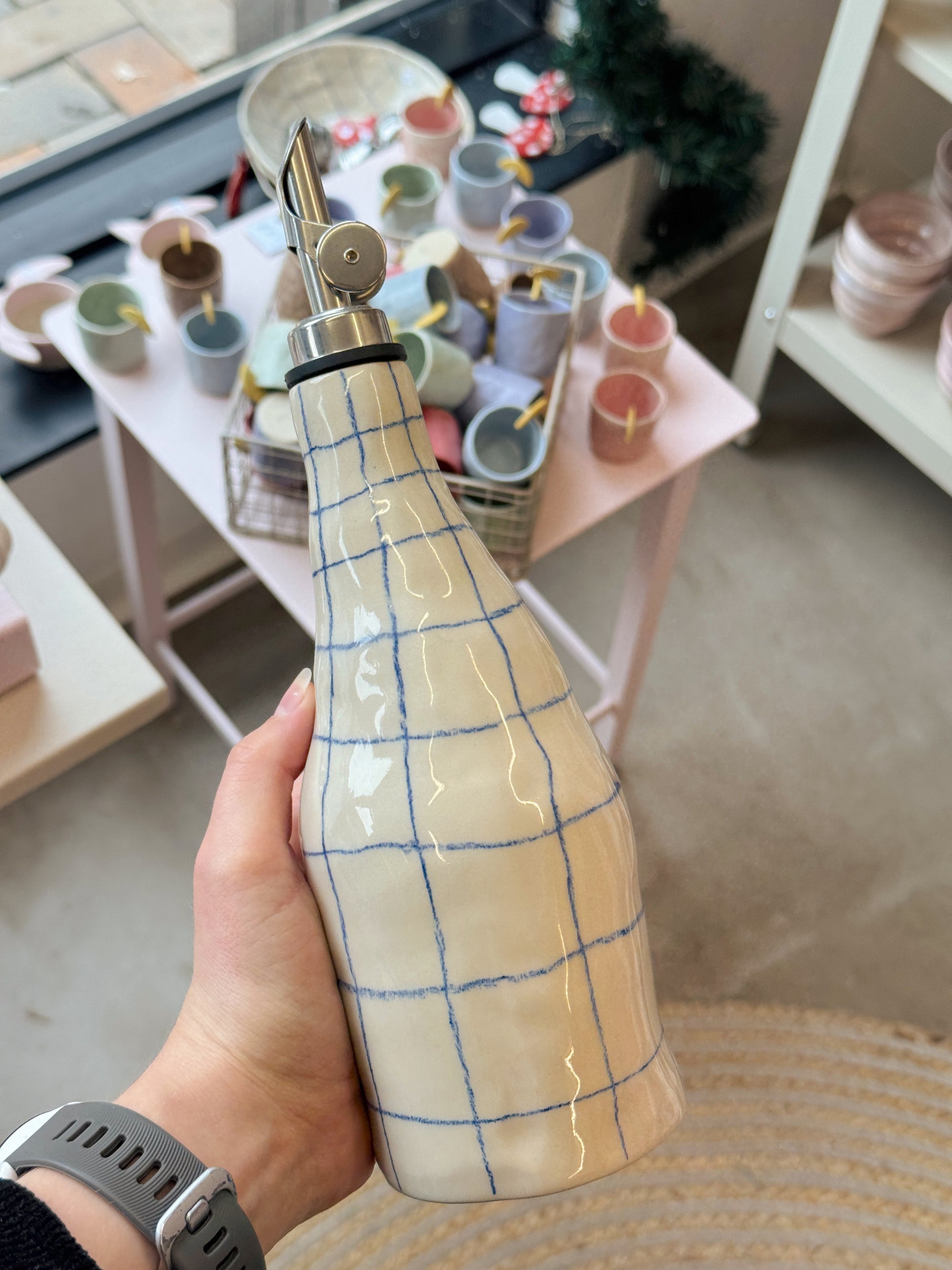 Olieflaske af Alberte Hall. Alberte Hall håndformer alle hende produkter, hvorfor hver stage, kop eller kande bliver sin egen og helt unik.