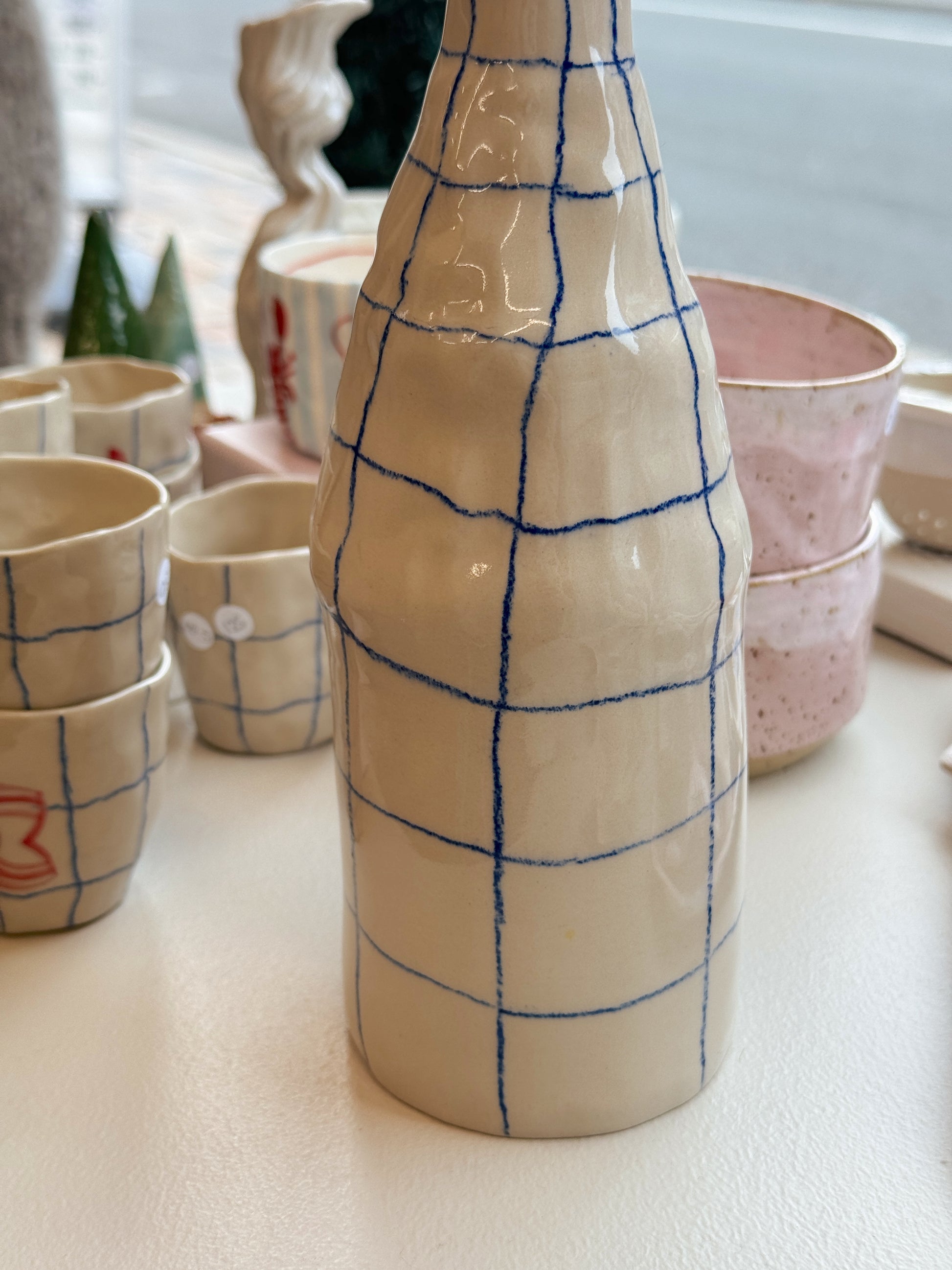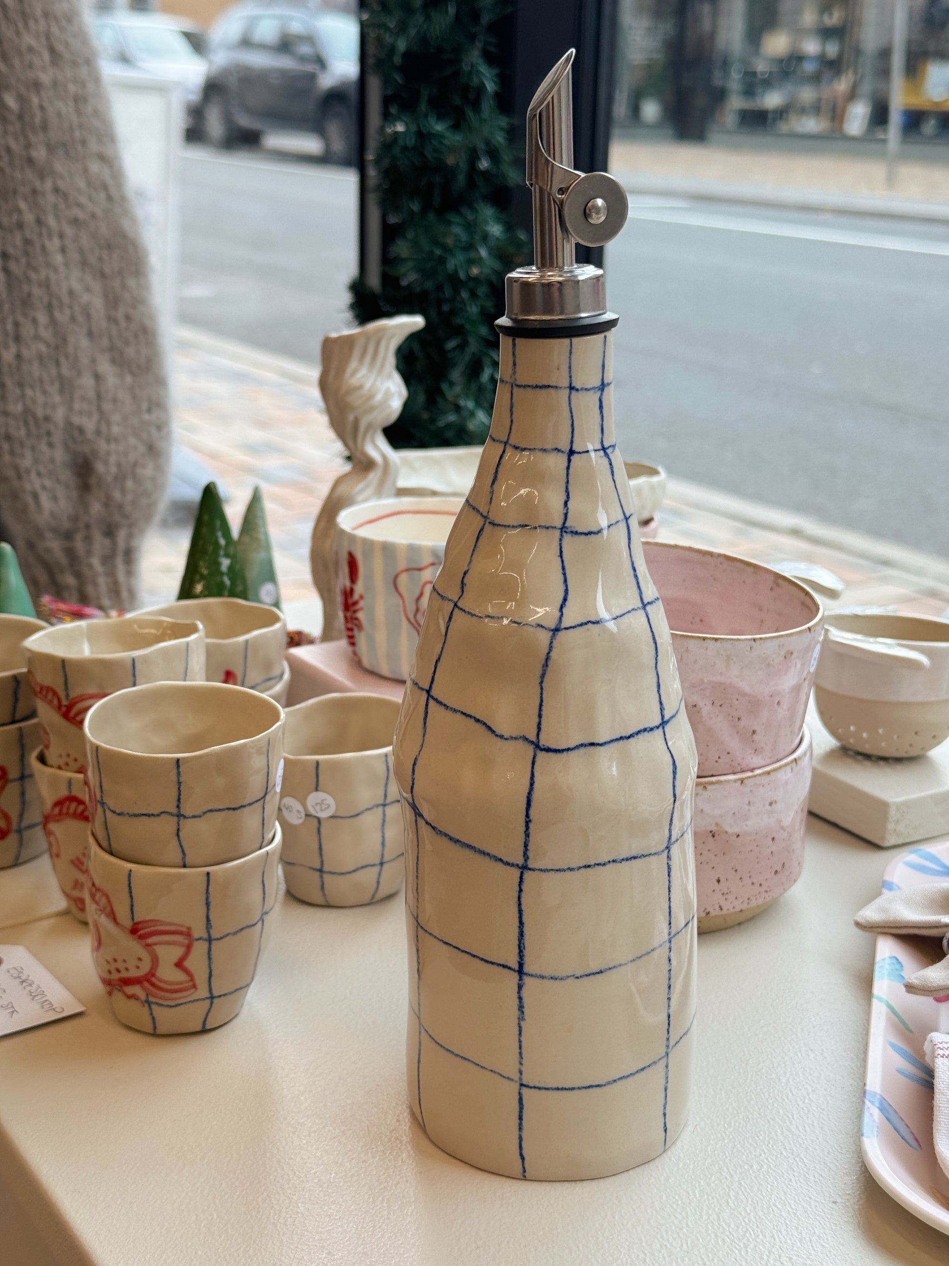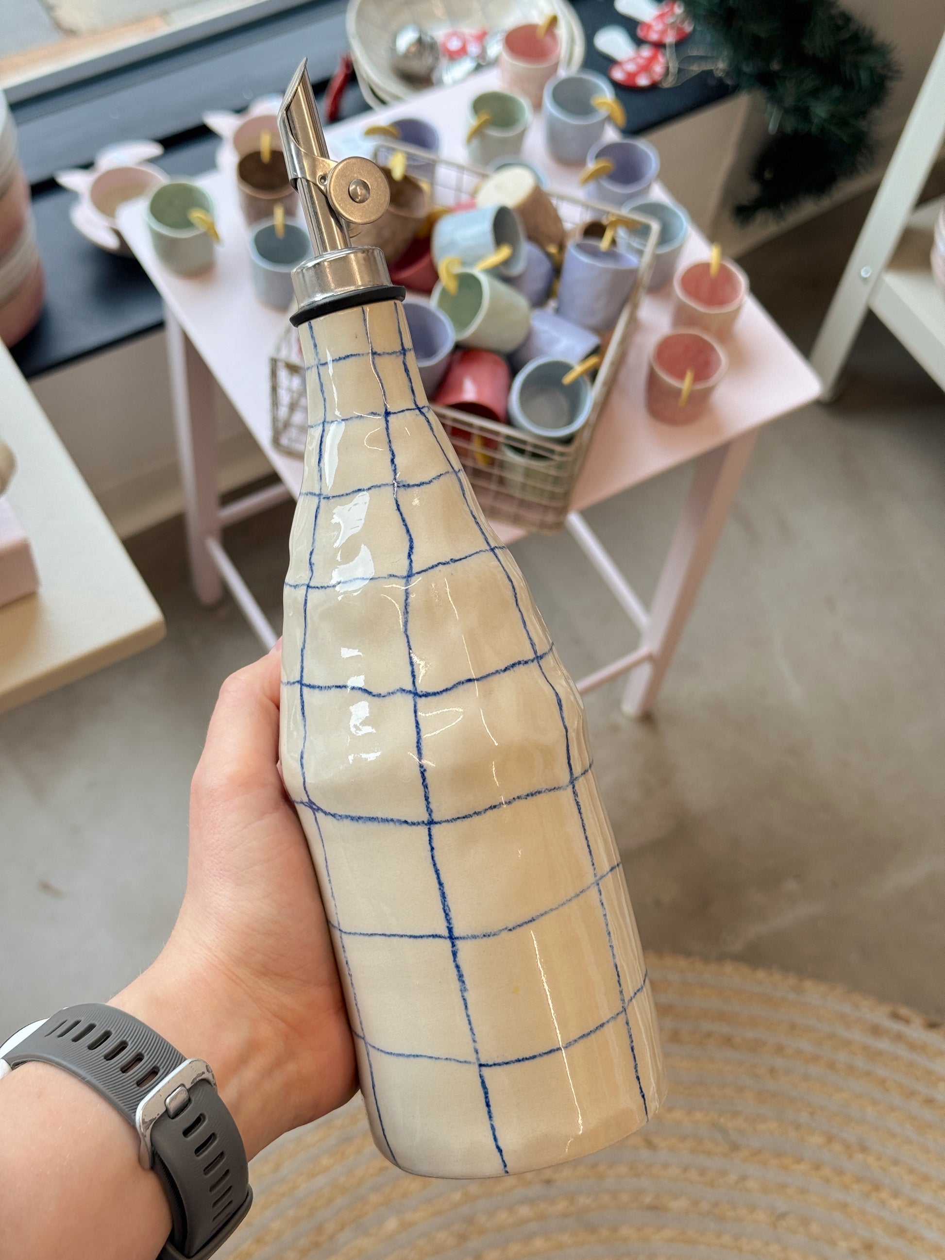 Olieflaske af Alberte Hall. Alberte Hall håndformer alle hende produkter, hvorfor hver stage, kop eller kande bliver sin egen og helt unik.