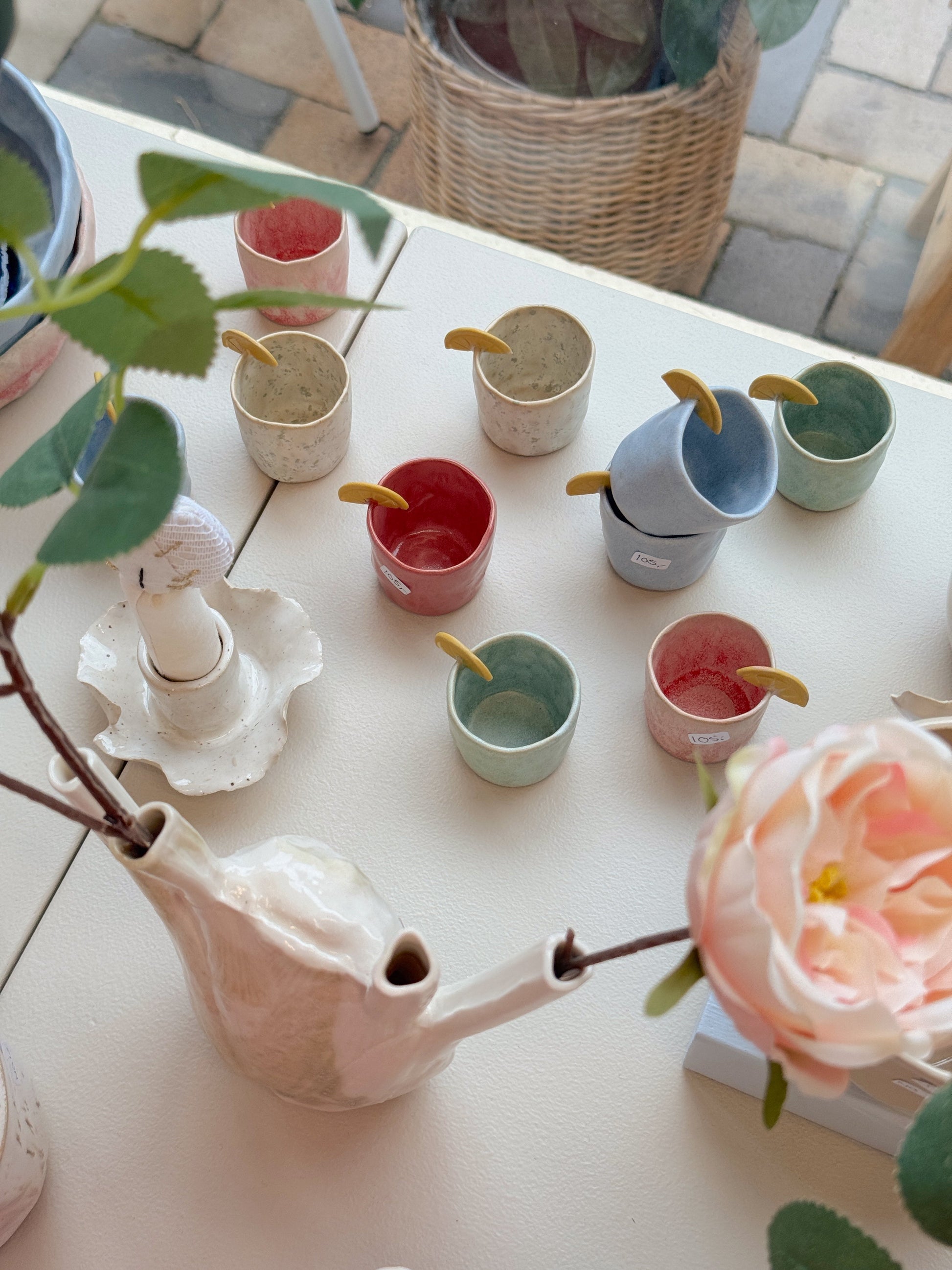 Små, charmerende shotsglas i hyggelige farver, der sætter stemningen! Håndlavet i stentøjsler, hvert glas er unikt og bidrager til hyggen – uanset om du nyder spiritus med vennerne, et ingefærshot om morgenen eller bare vil gøre noget ekstra ud af hverdagen.