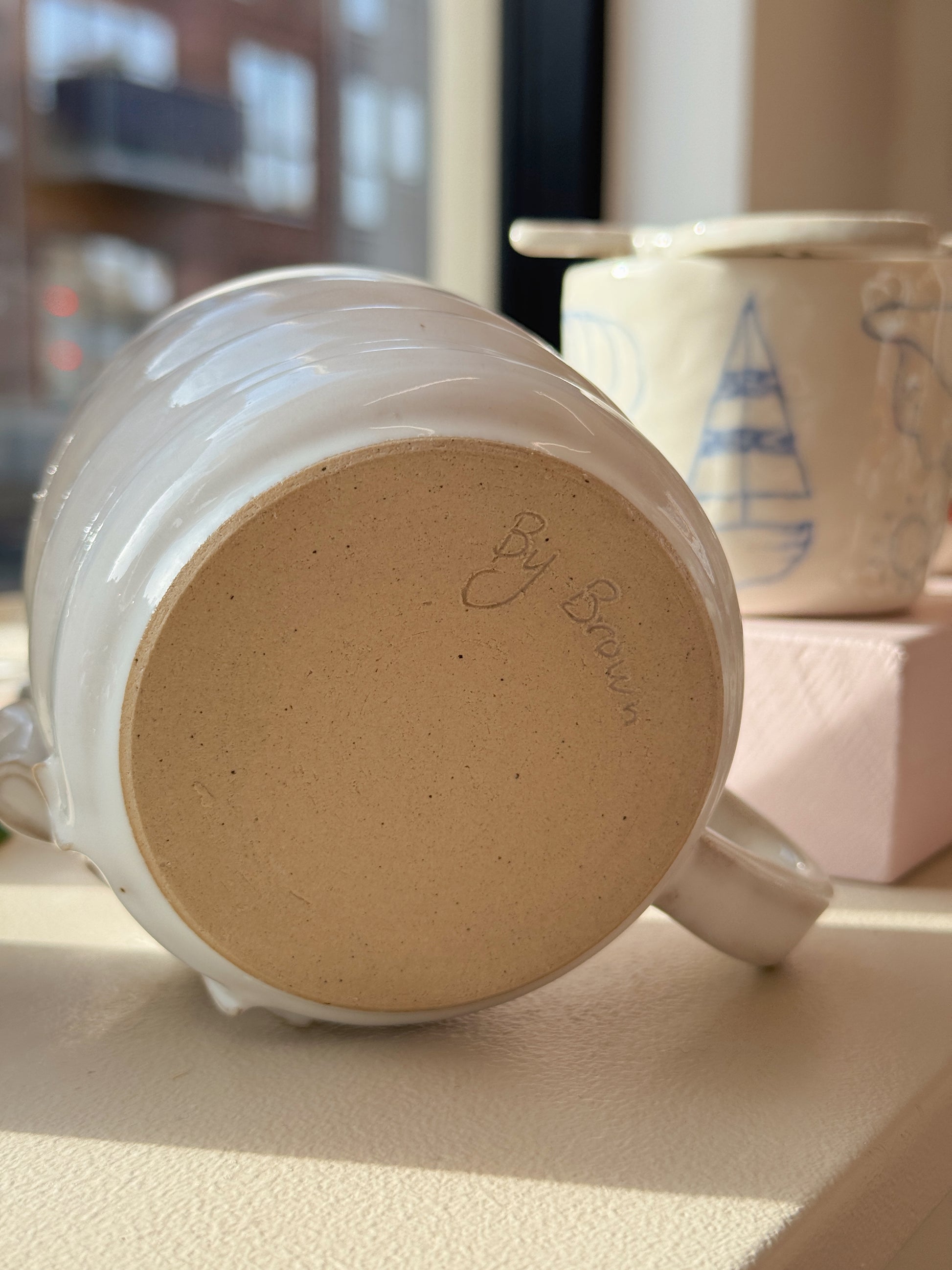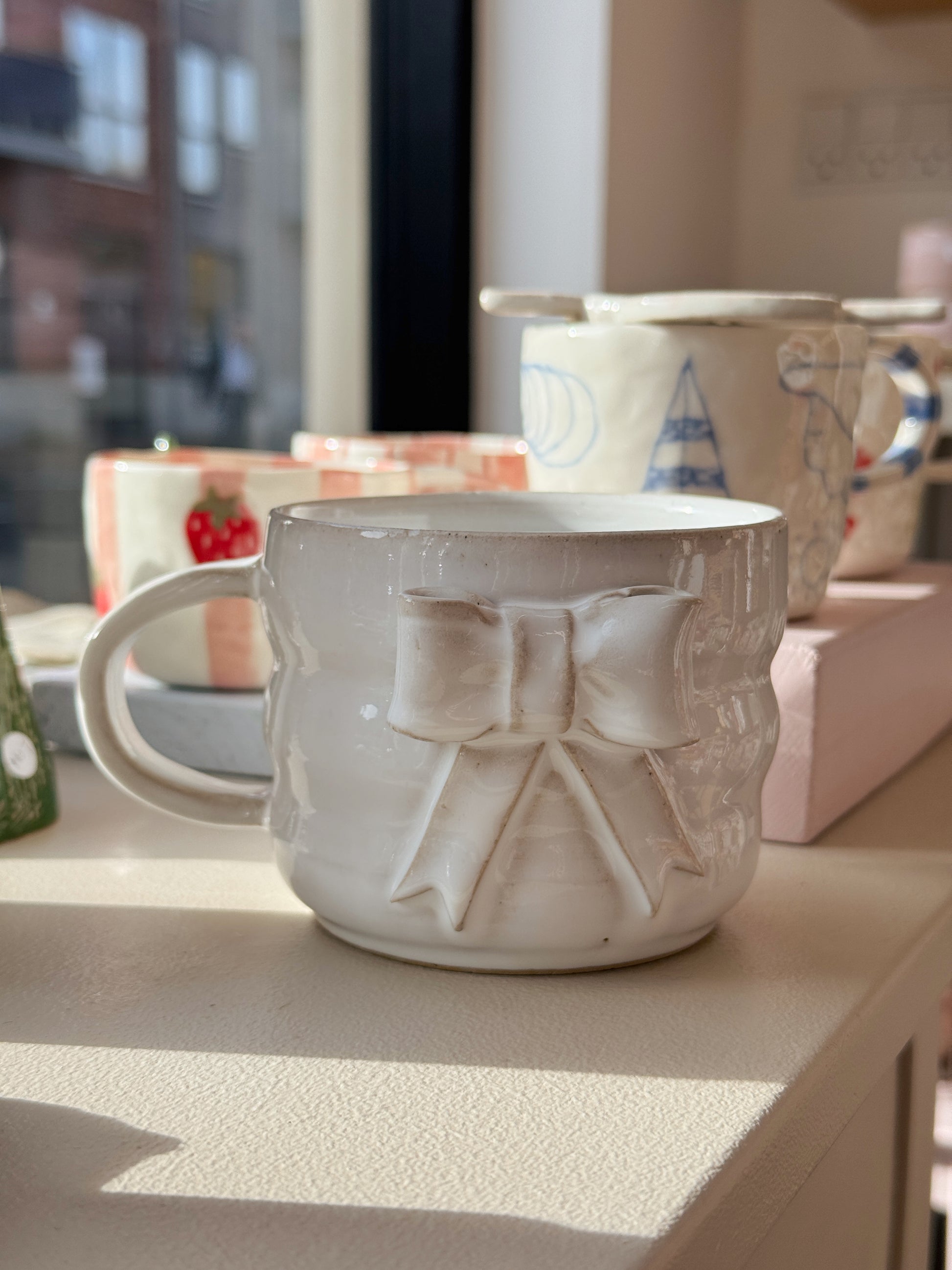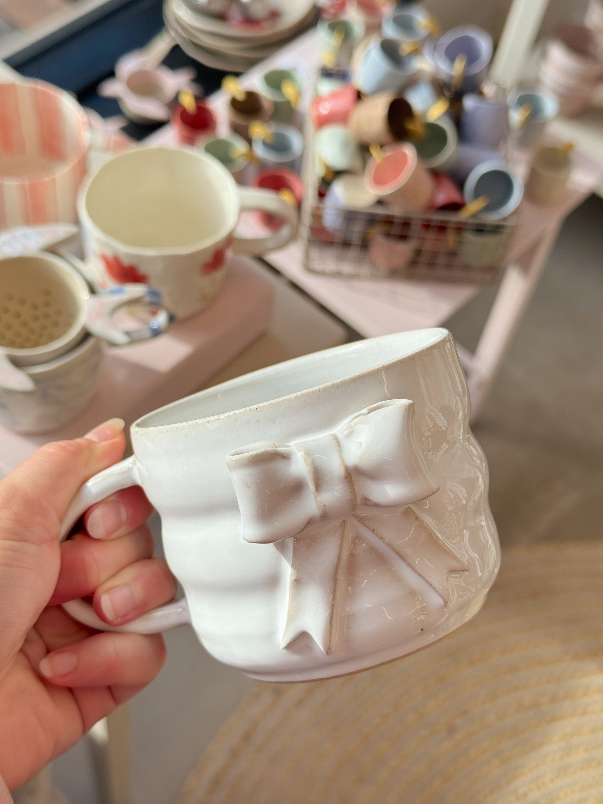 Sløjfekop fra Emma Brown, som står bag By Brown, hånddrejer eller former og håndmaler alle sine keramikværker. Hver en kop, skål eller vase bliver derfor helt sin egen og unik.