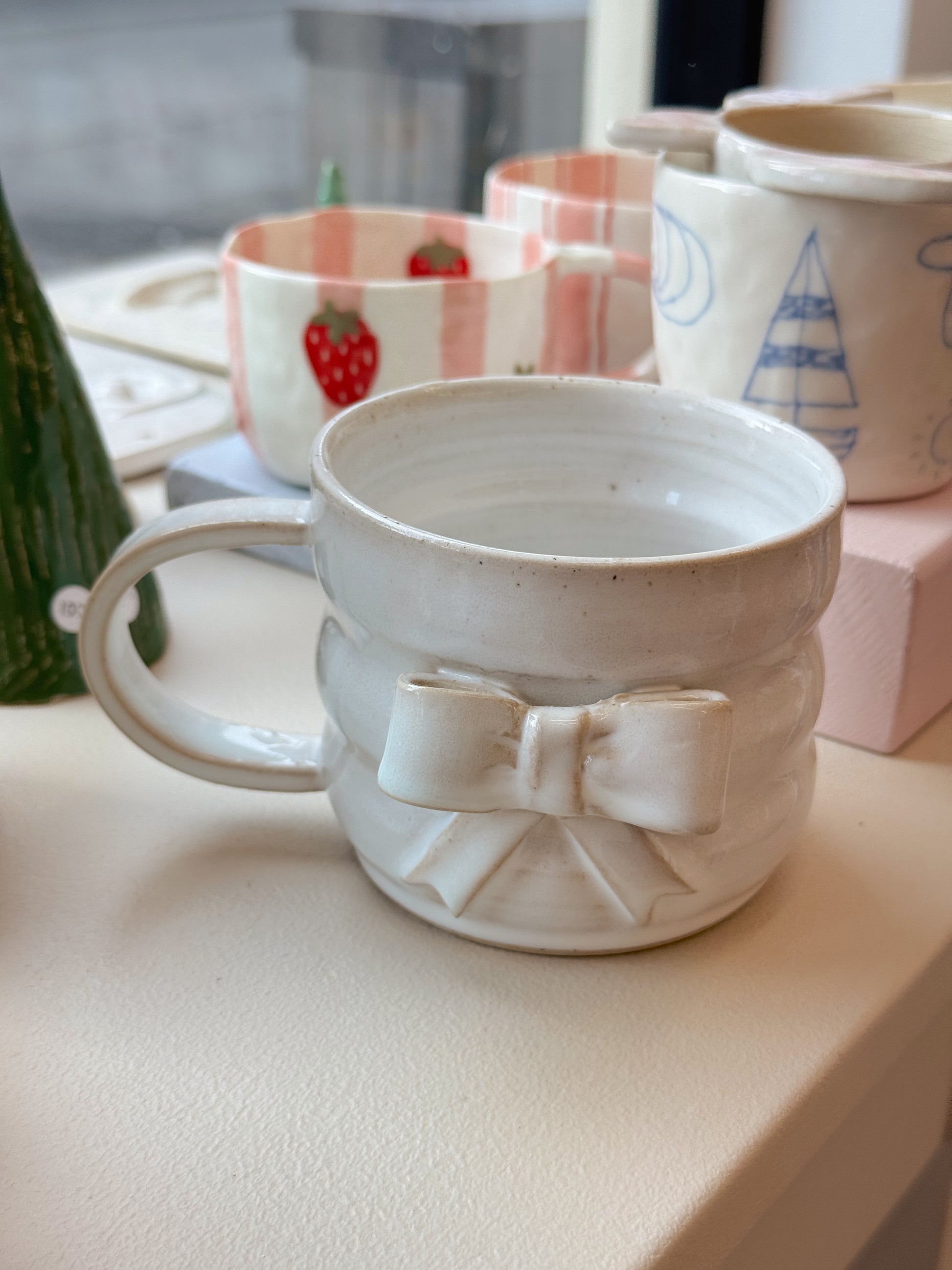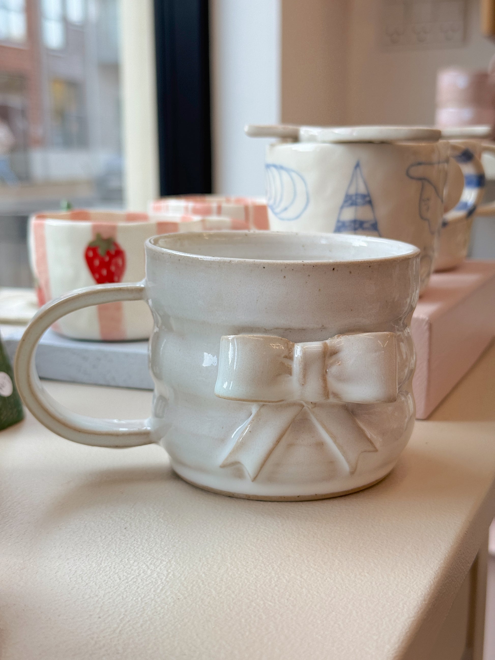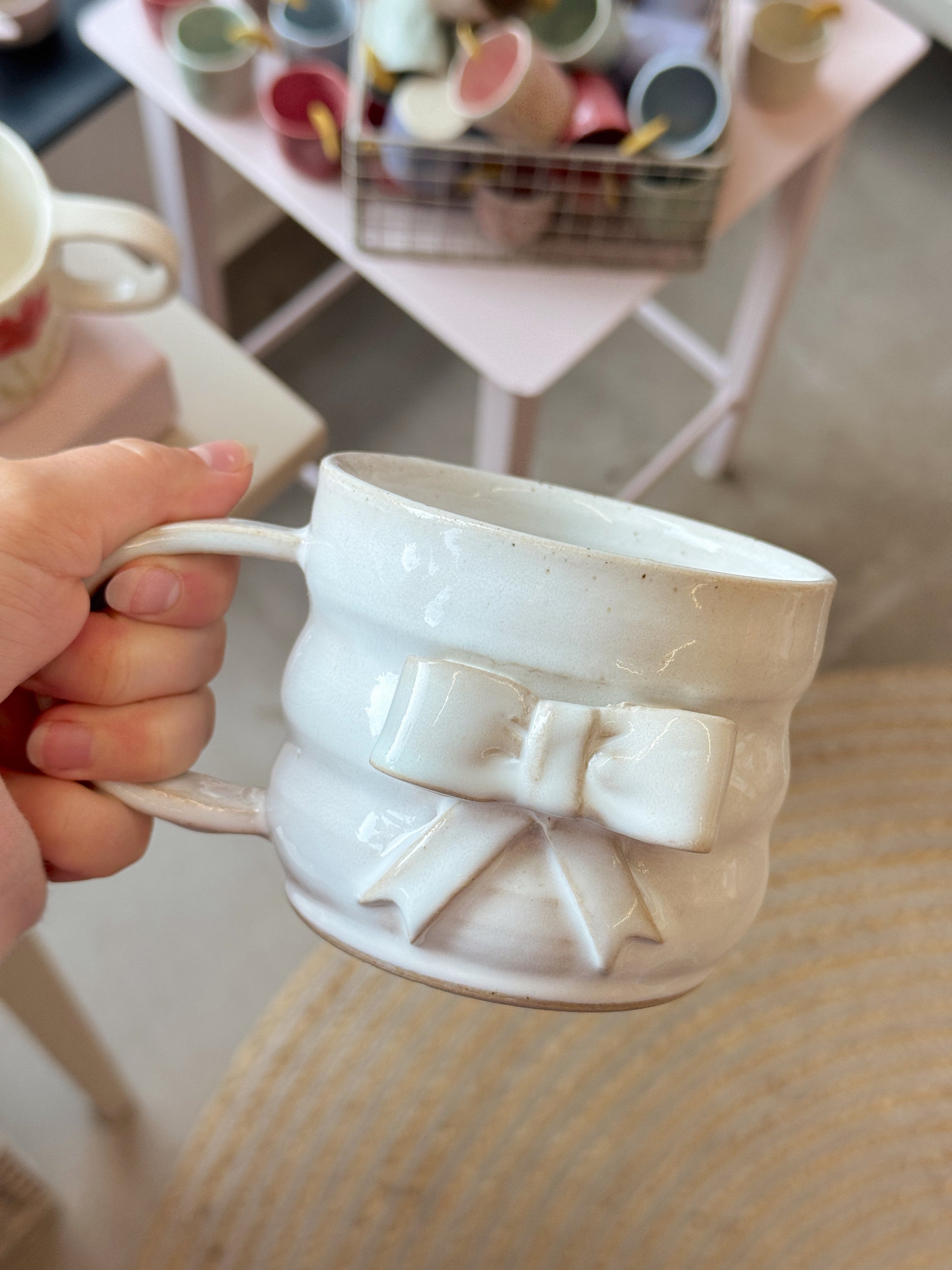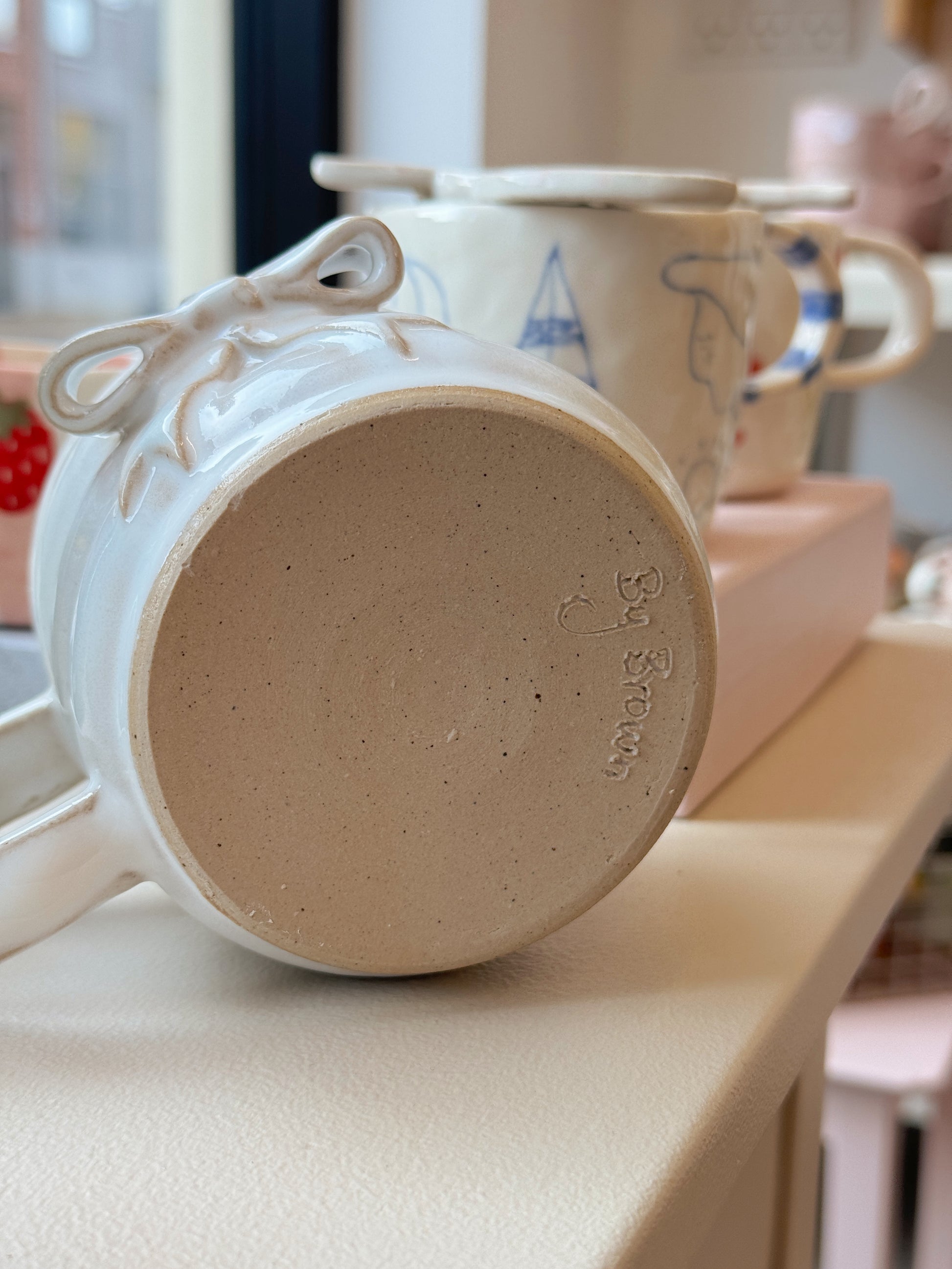 Sløjfekop fra Emma Brown, som står bag By Brown, hånddrejer eller former og håndmaler alle sine keramikværker. Hver en kop, skål eller vase bliver derfor helt sin egen og unik.