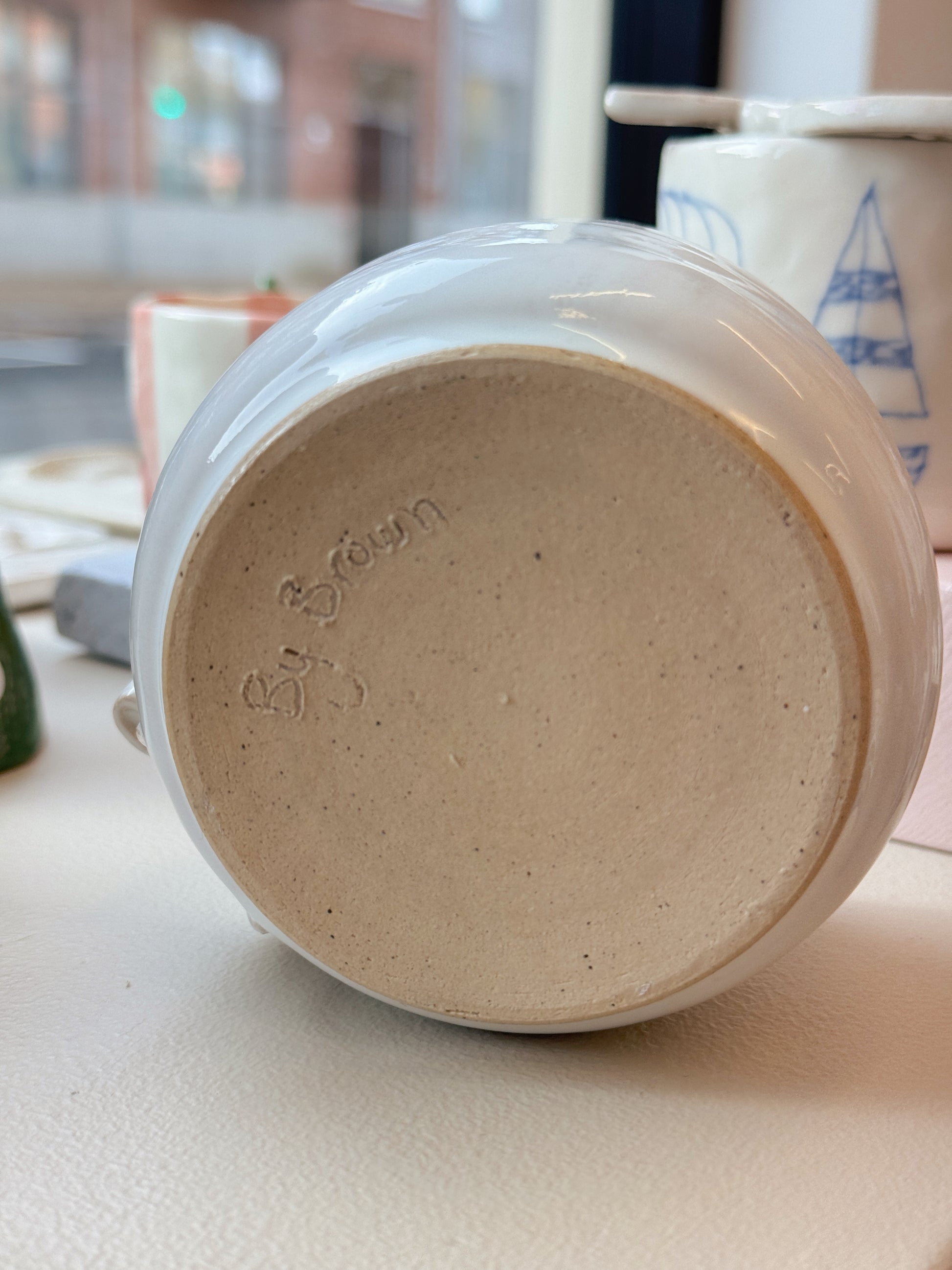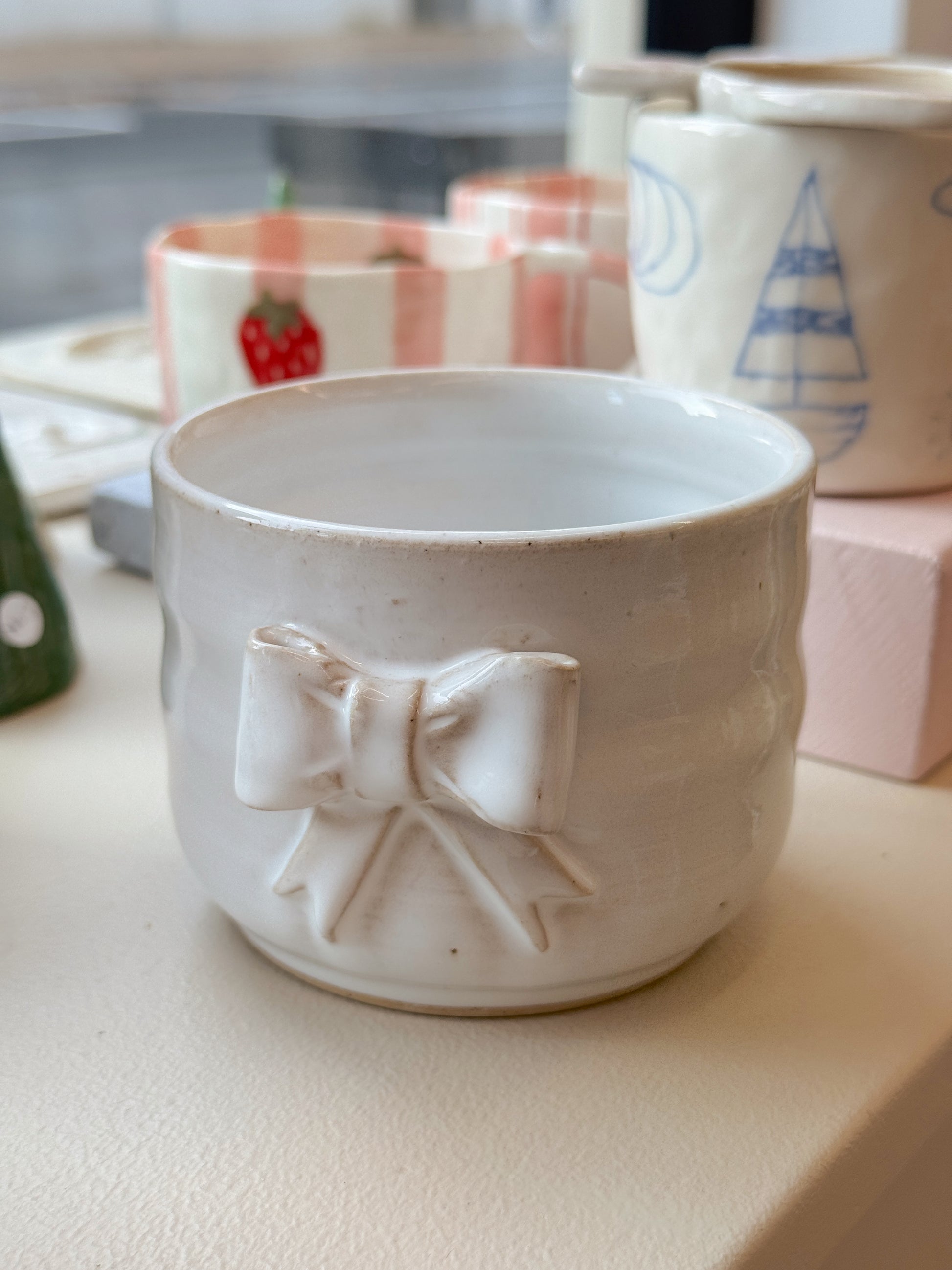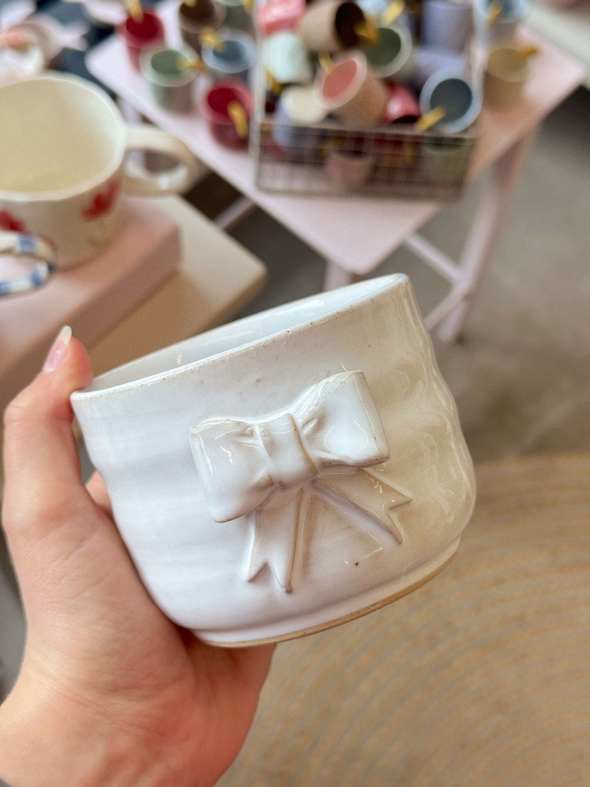Sløjfekop fra Emma Brown, som står bag By Brown, hånddrejer eller former og håndmaler alle sine keramikværker. Hver en kop, skål eller vase bliver derfor helt sin egen og unik.