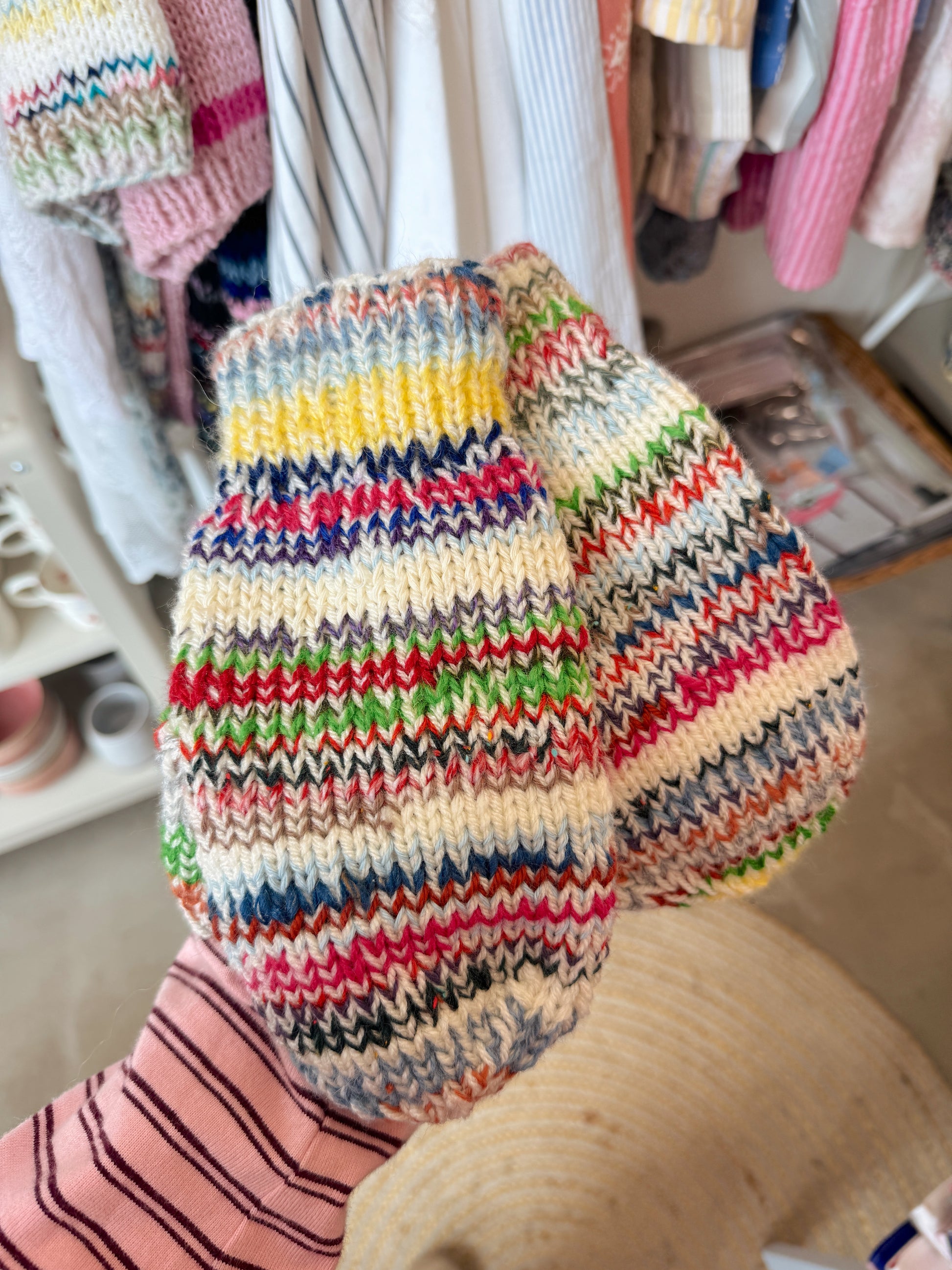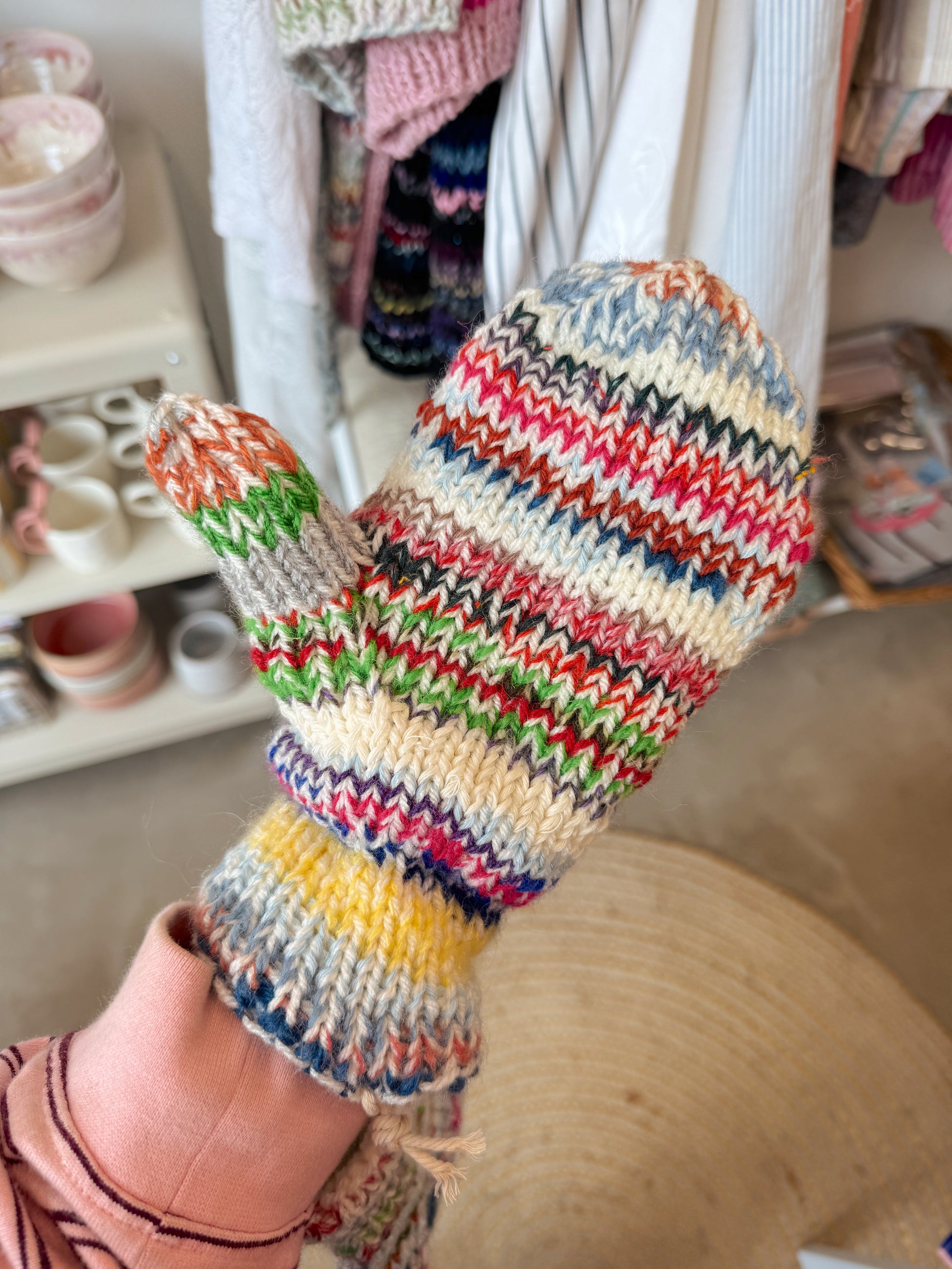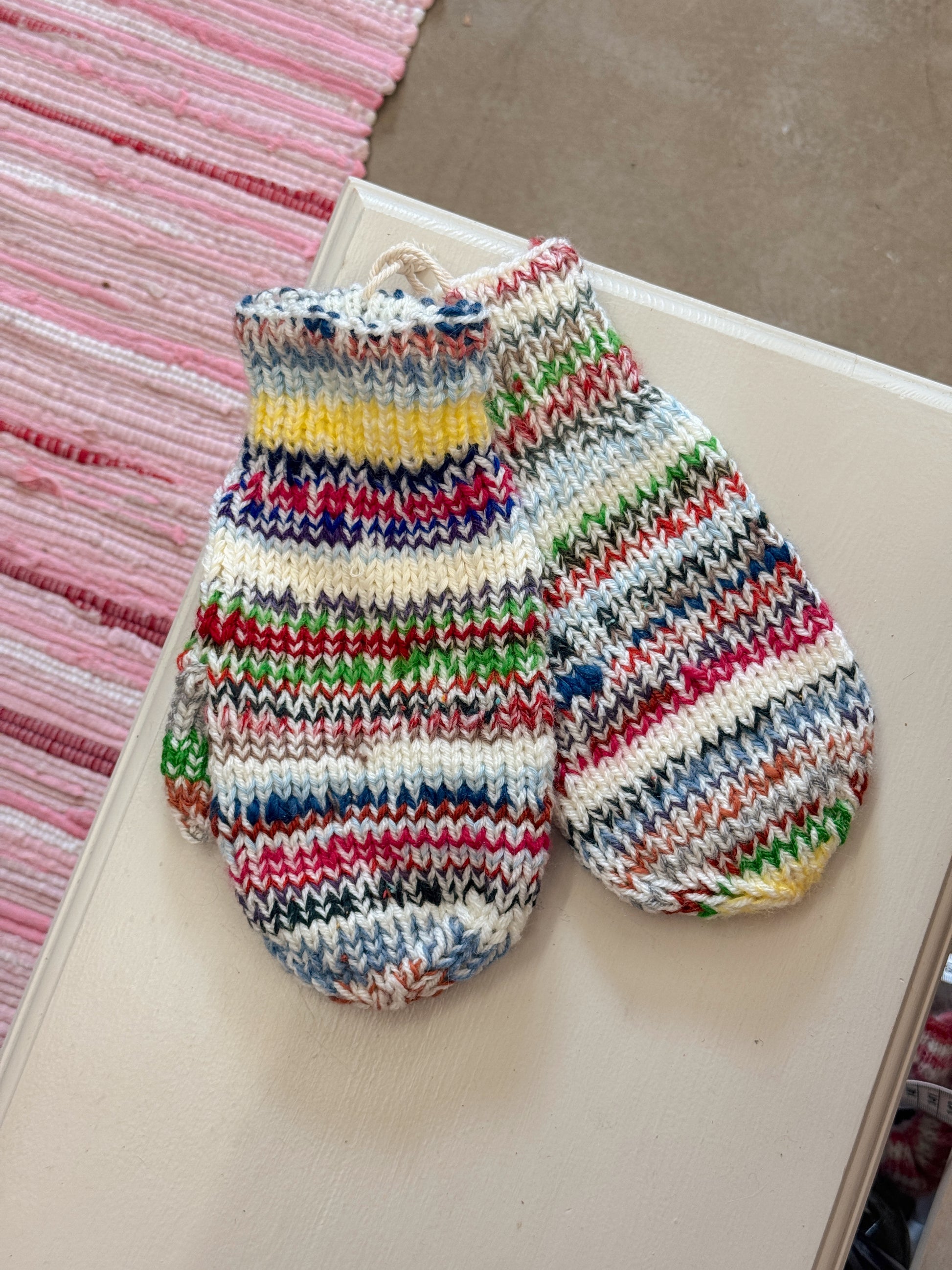 Strikkede luffer fra KC.Knitting, som strikker i genbrugsgarn. Den smukkeste multifarvede af sin slags.