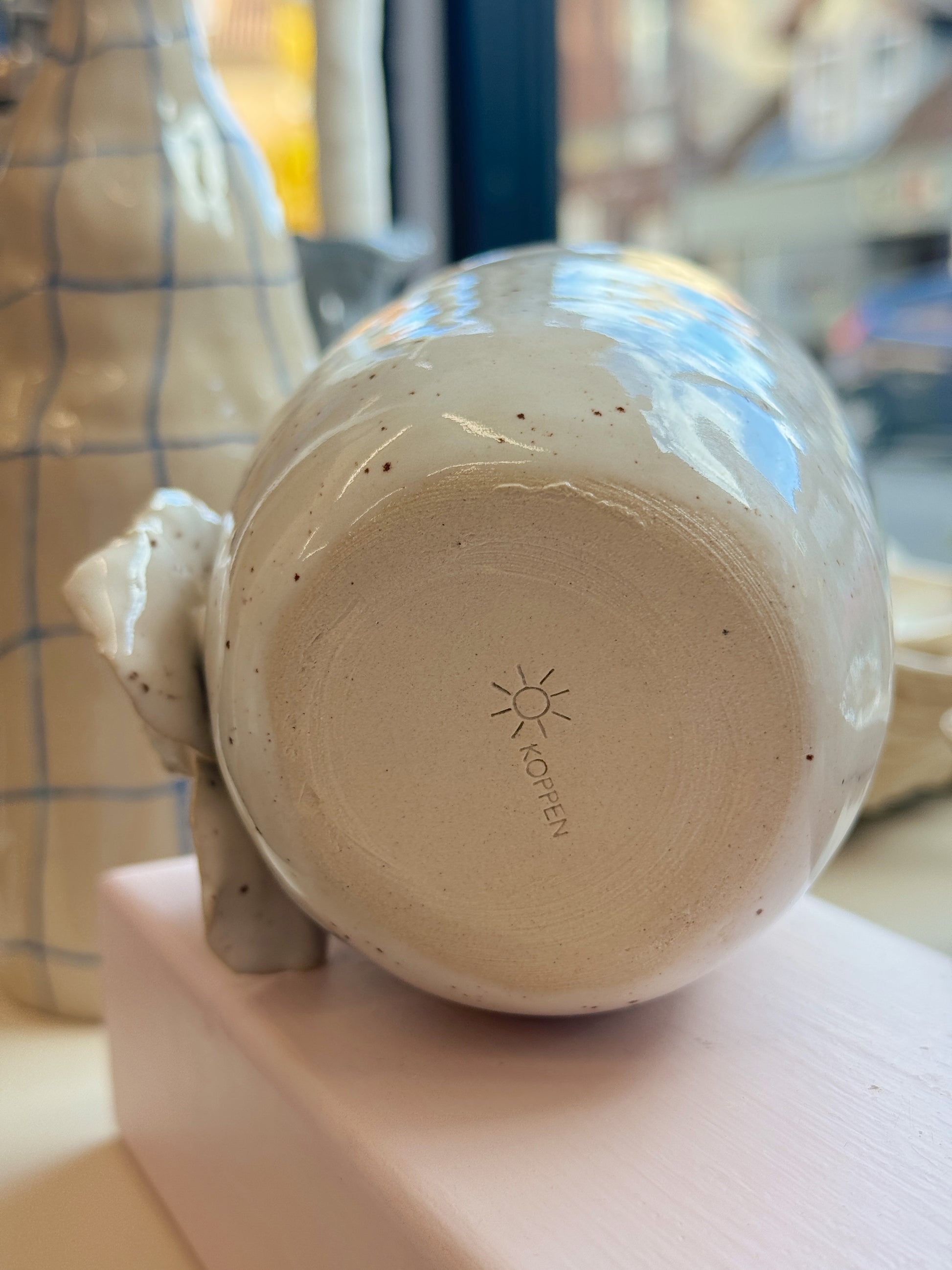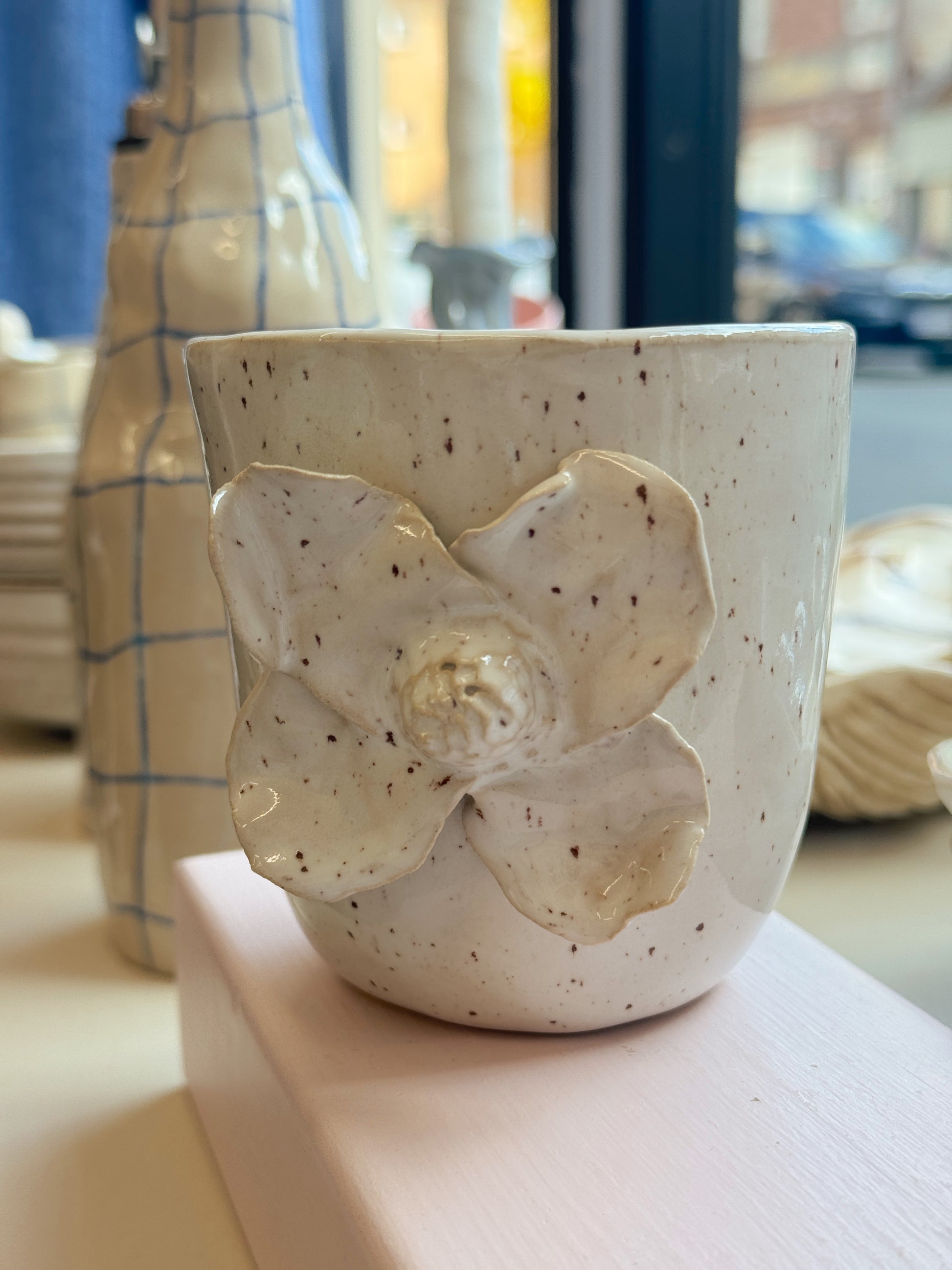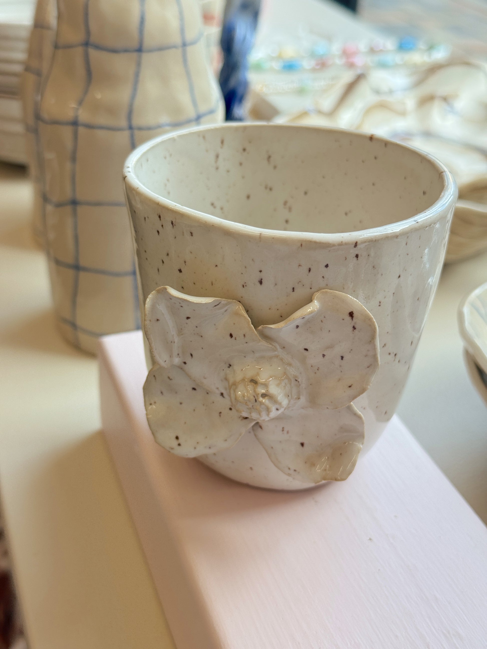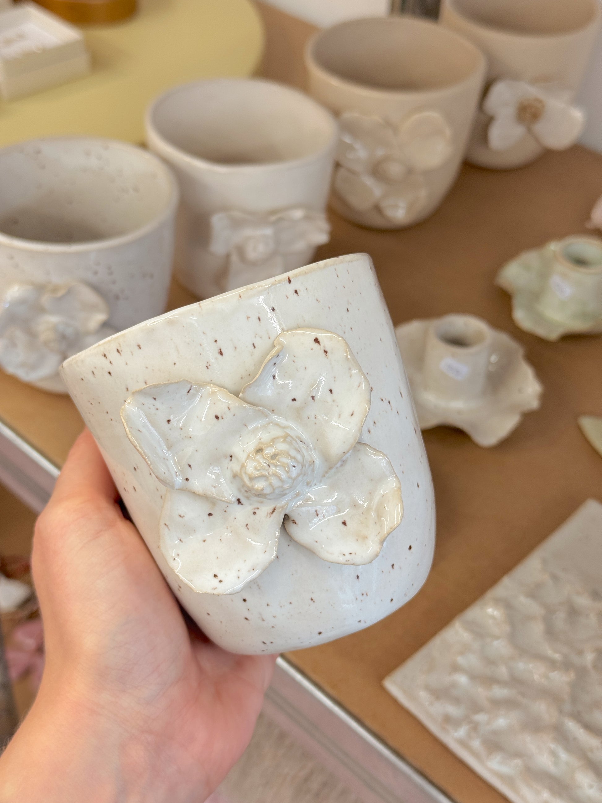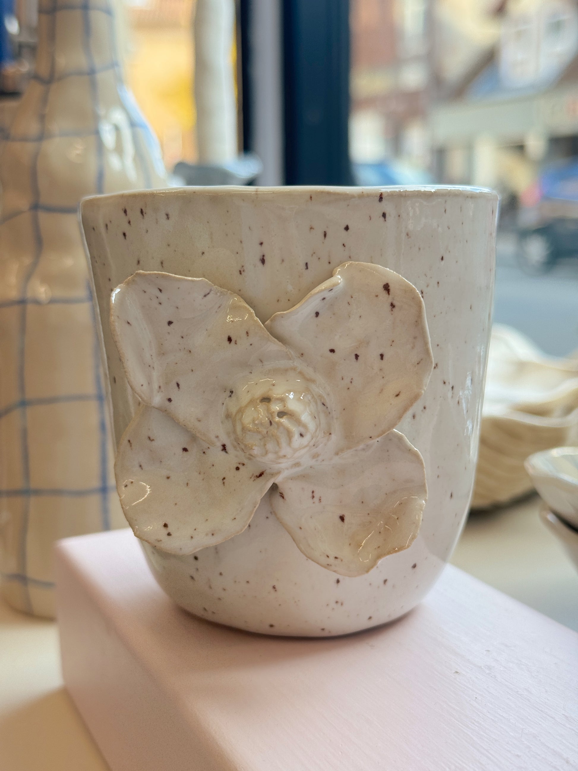 Blomsterkop fra Solkoppen med blomst på siden, et naturligt og unikt udtryk. Solkoppen former og håndmaler alle sine keramikværker. Hver en kop, skål eller stage bliver derfor helt sin egen og unik.