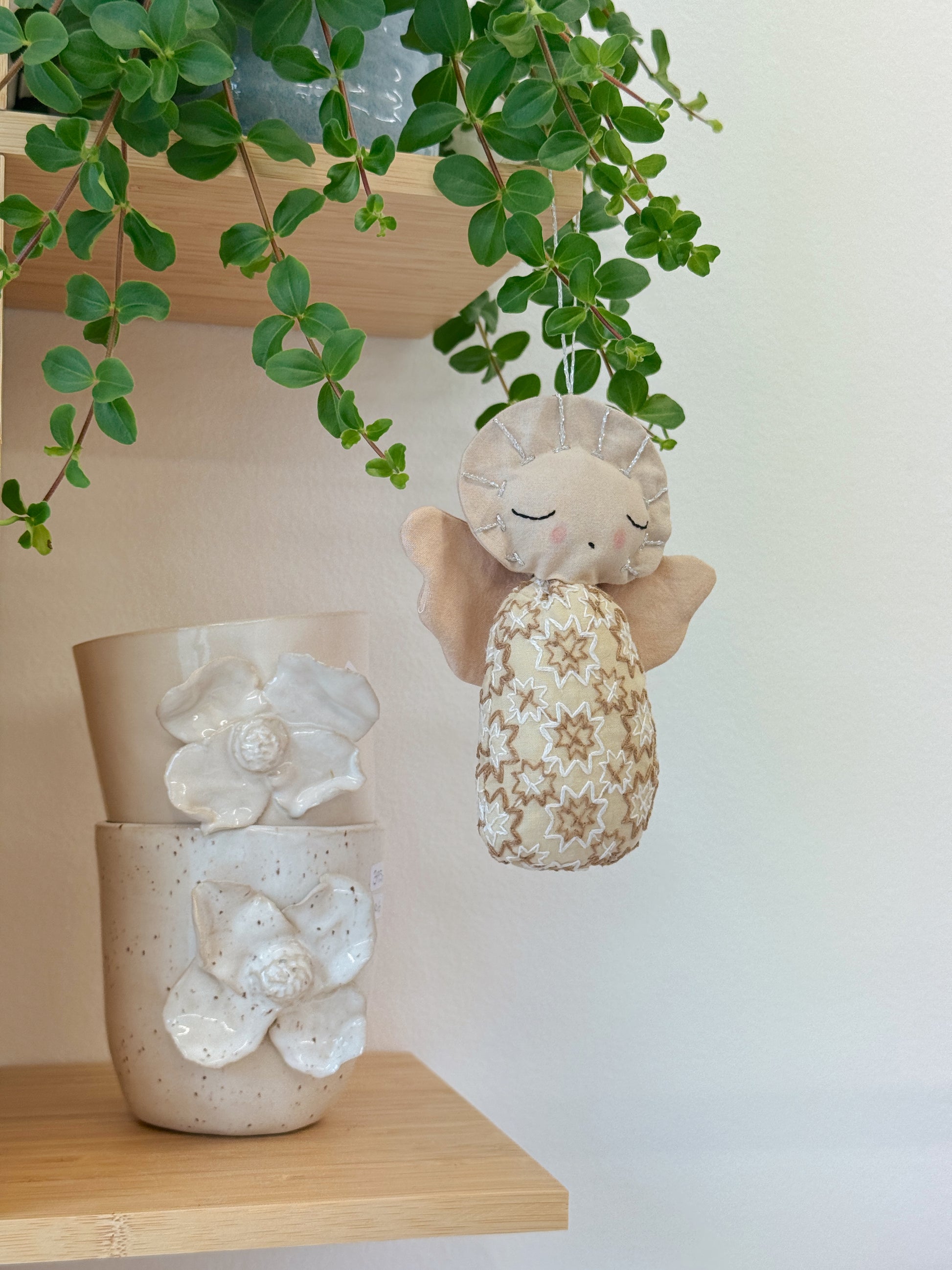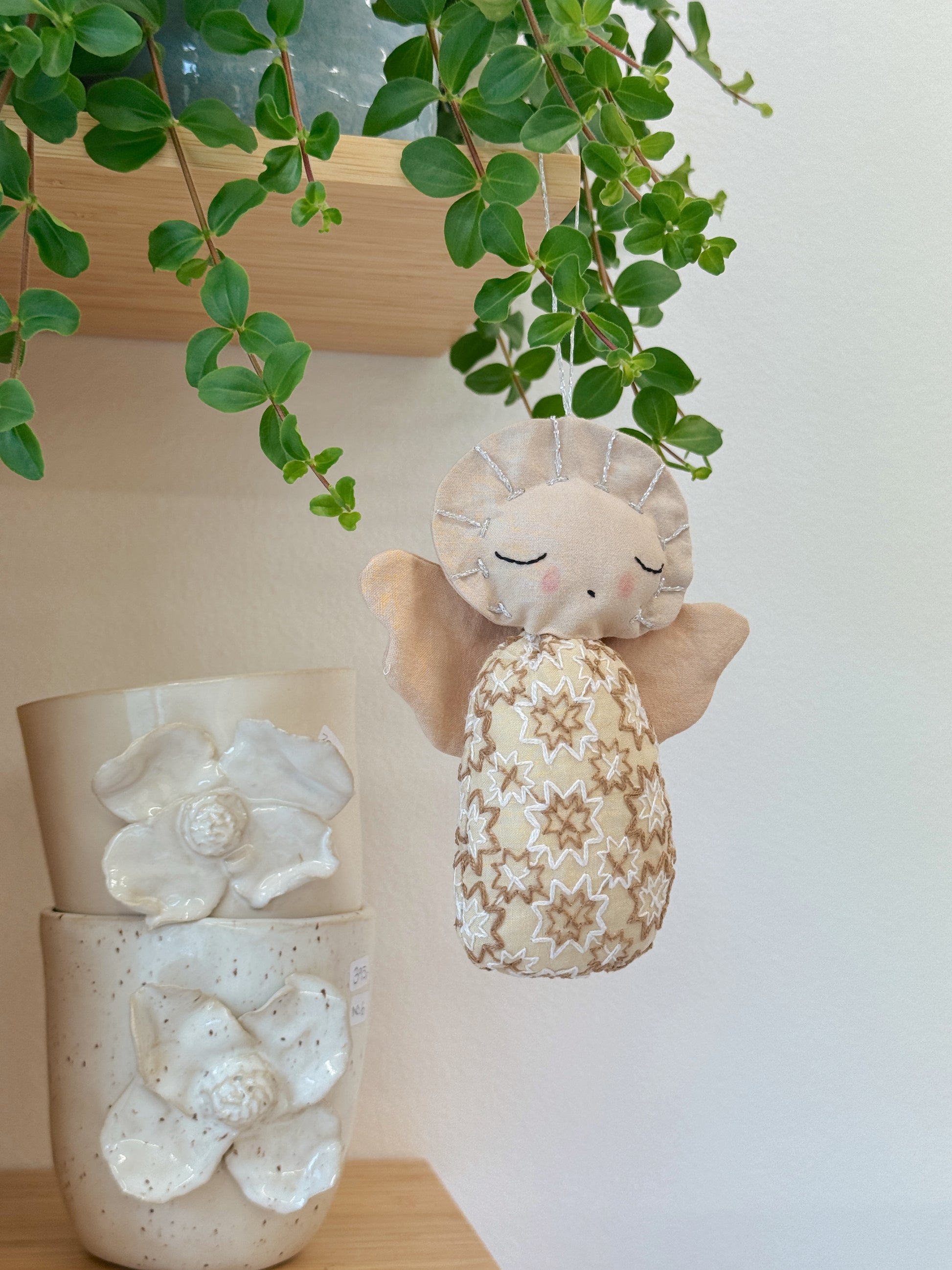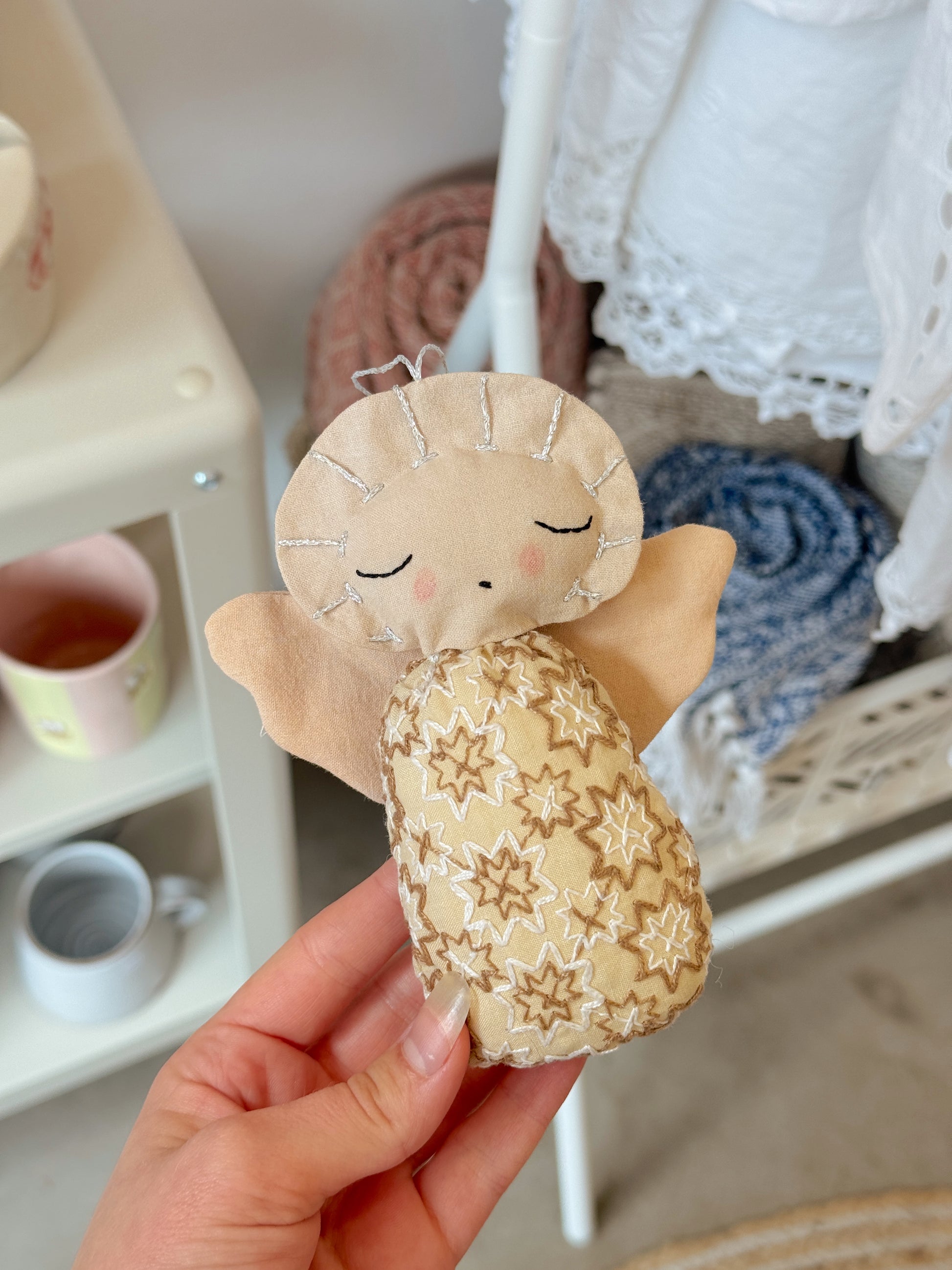 Fineste juleengel, der giver et finurligt og sødt udtryk. Kan også sagtens pynte i boligen resten af året. Fåes i flere udgaver som alle er skabt i et mix af vintage- og plantefarvede tekstiler.