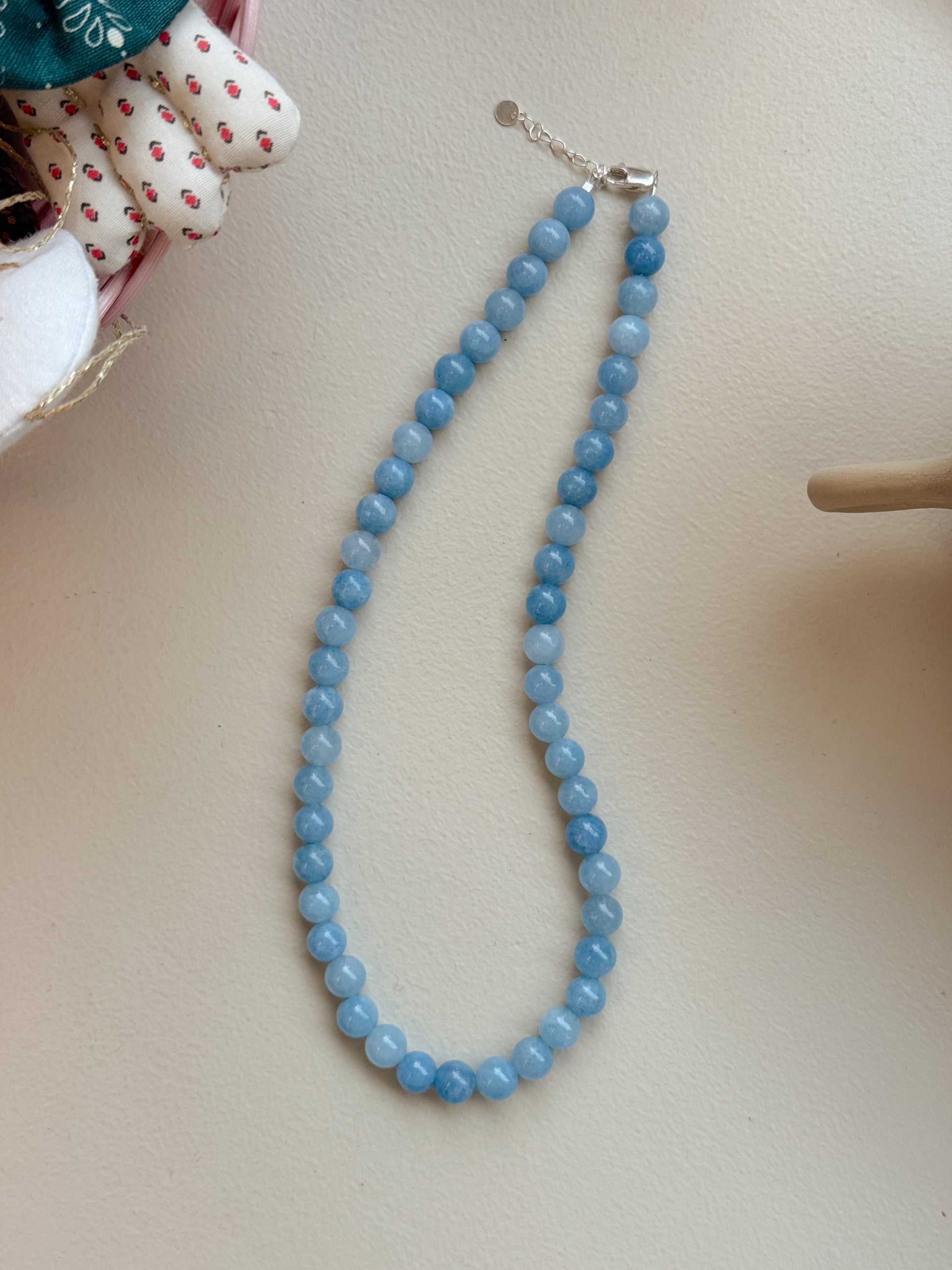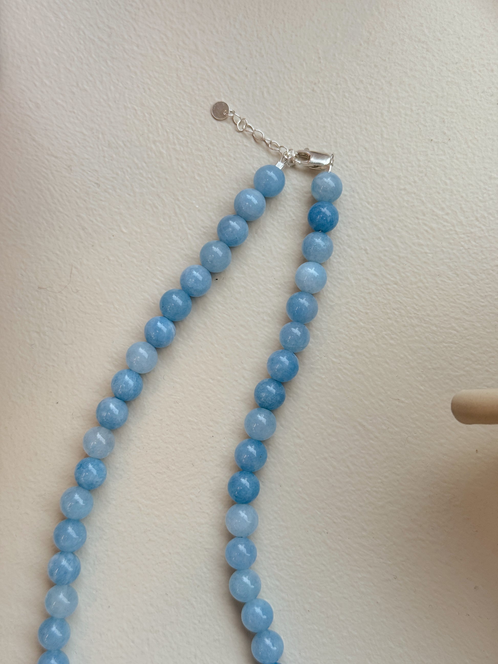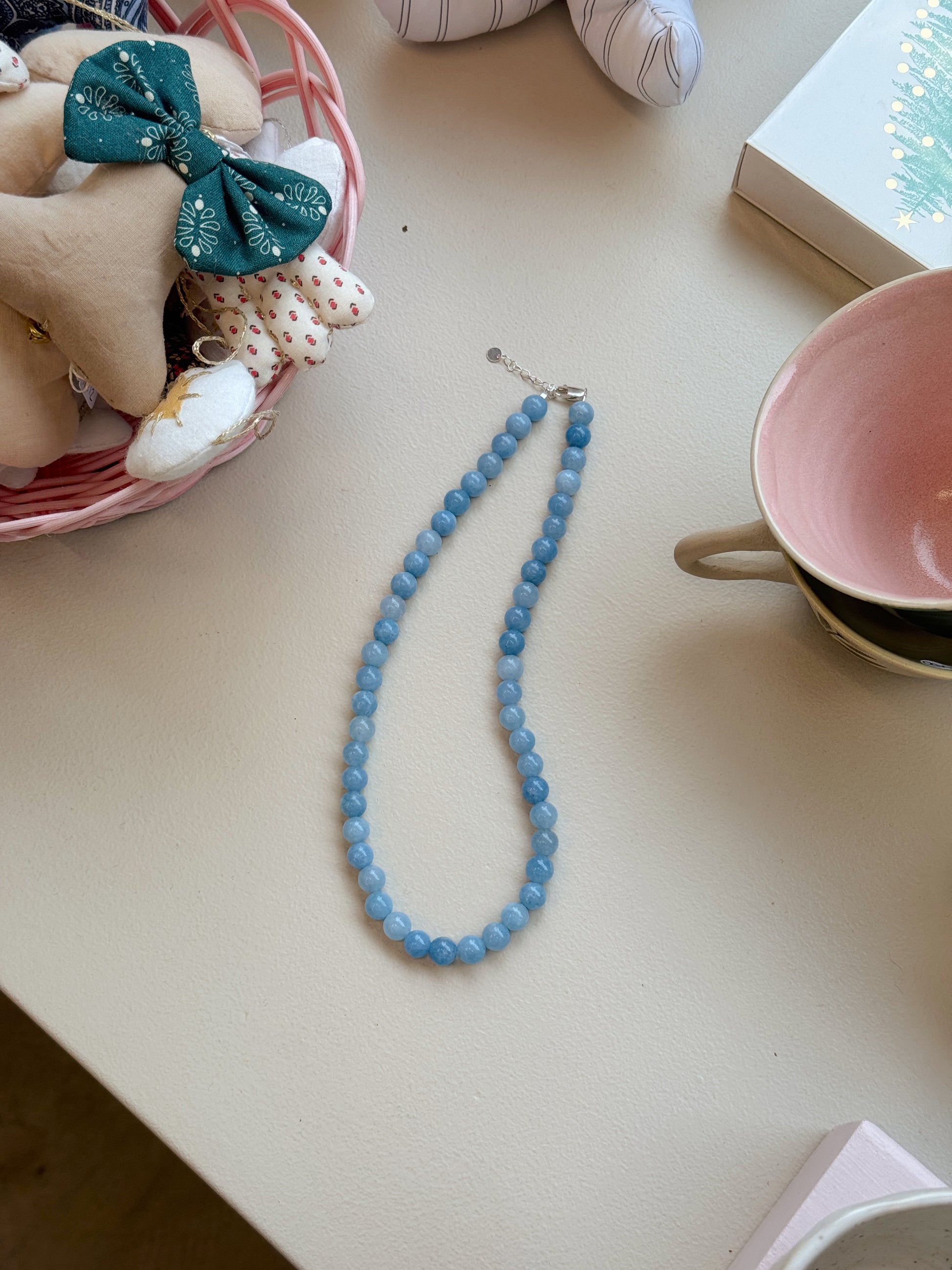Kæden består af 8mm naturstensperler - den fås i flere forskellige farver. Perlerne er trukket på en wire, som gør kæden holdbar.