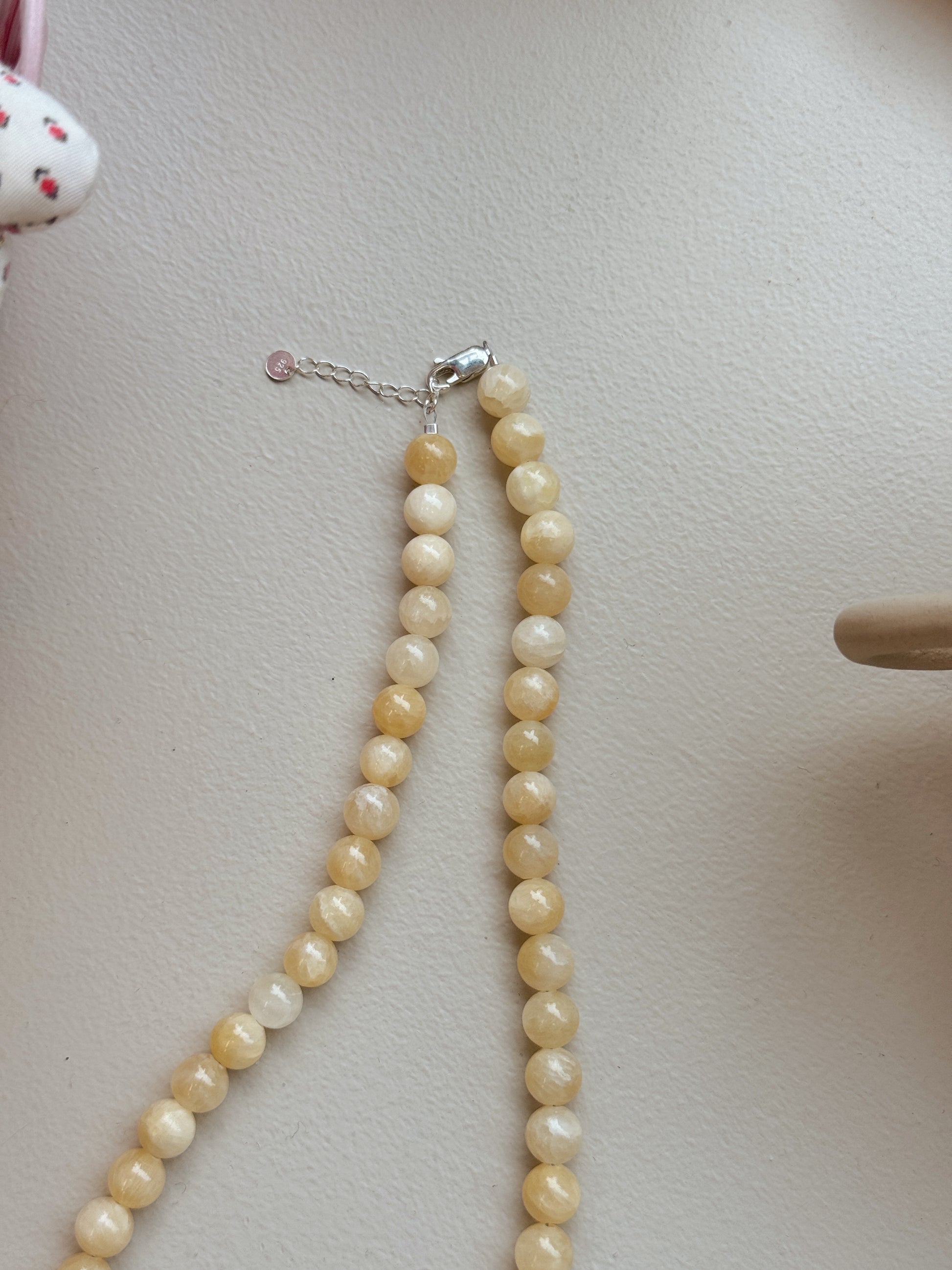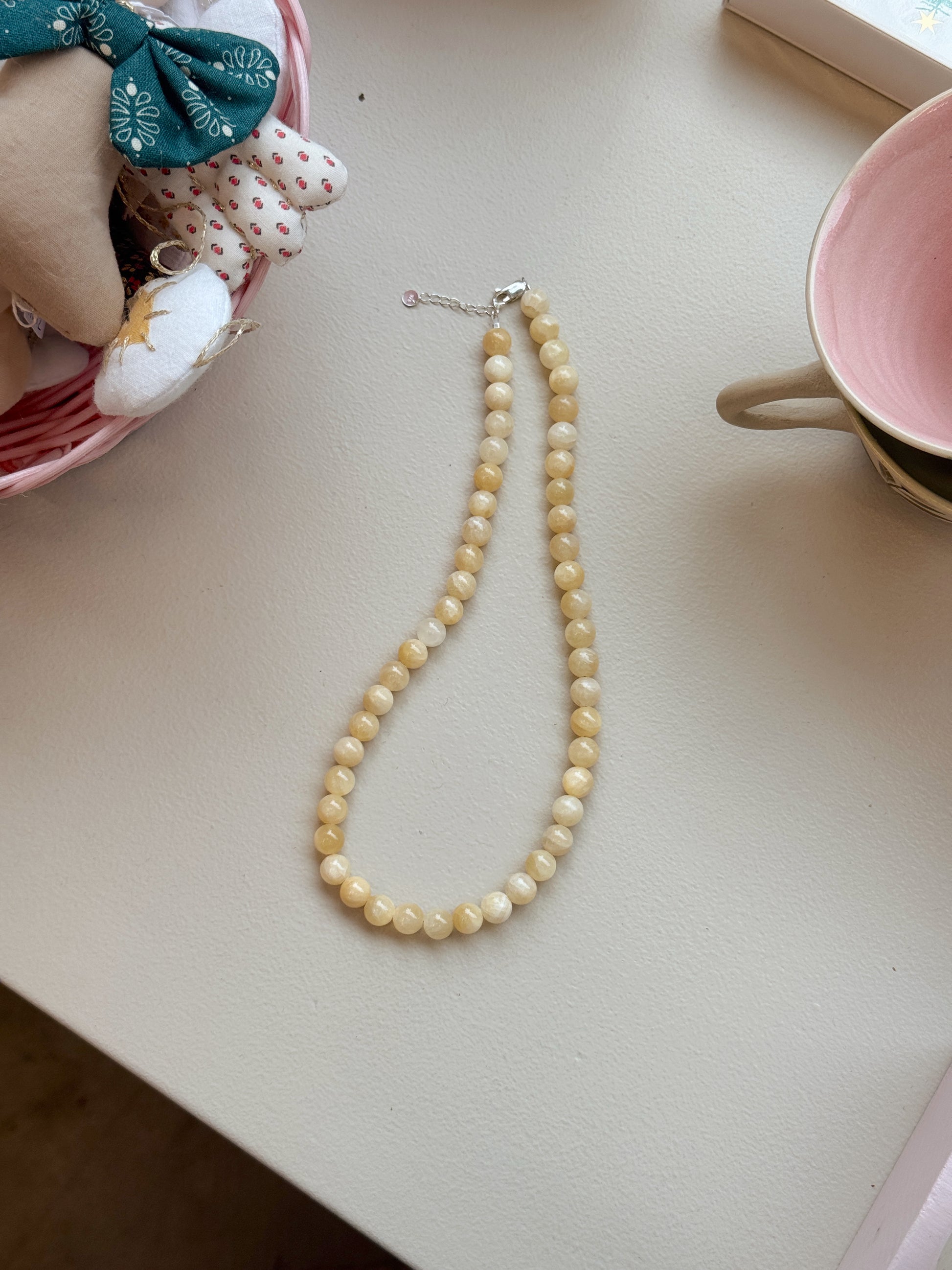Kæden består af 8mm naturstensperler - den fås i flere forskellige farver. Perlerne er trukket på en wire, som gør kæden holdbar.