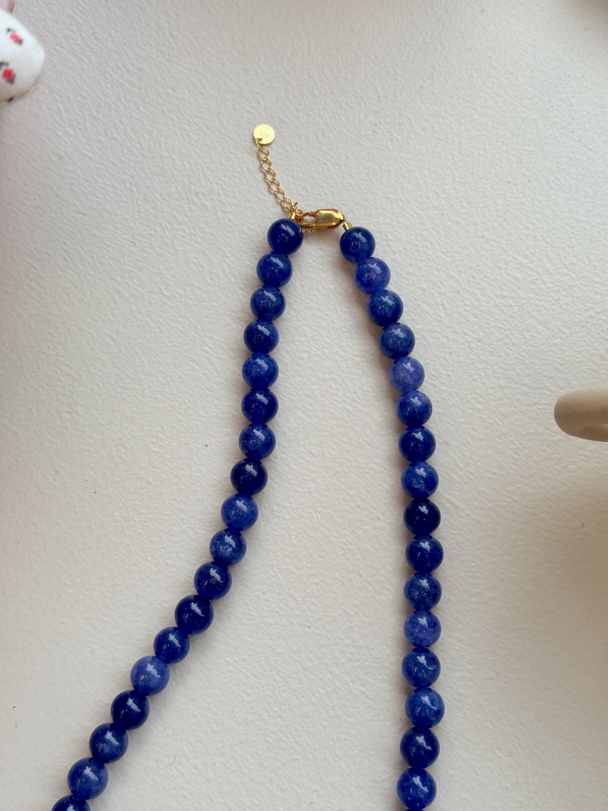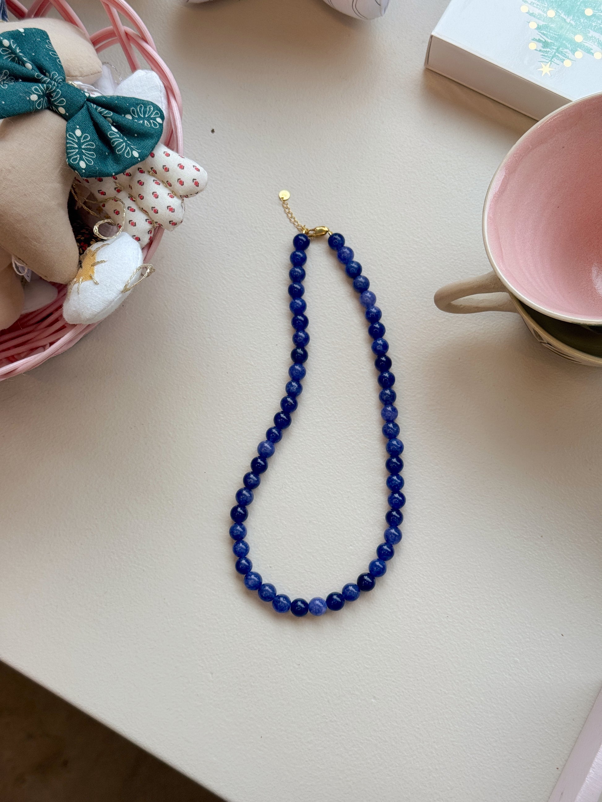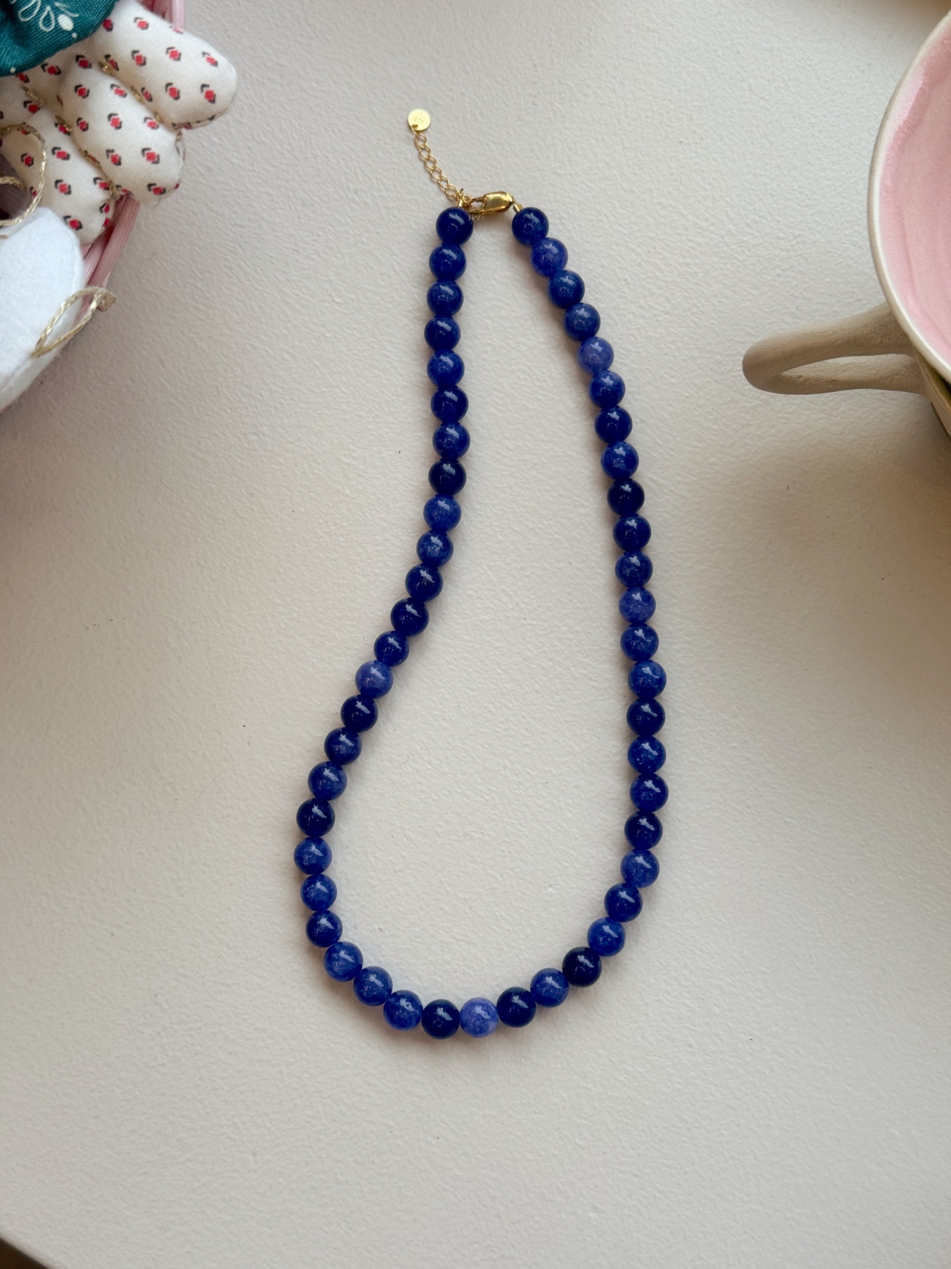 Kæden består af 8mm naturstensperler - den fås i flere forskellige farver. Perlerne er trukket på en wire, som gør kæden holdbar.