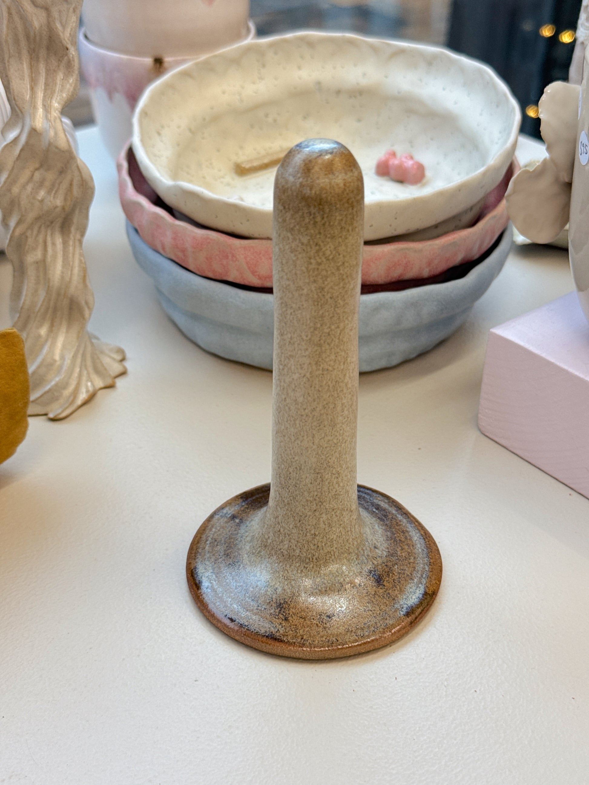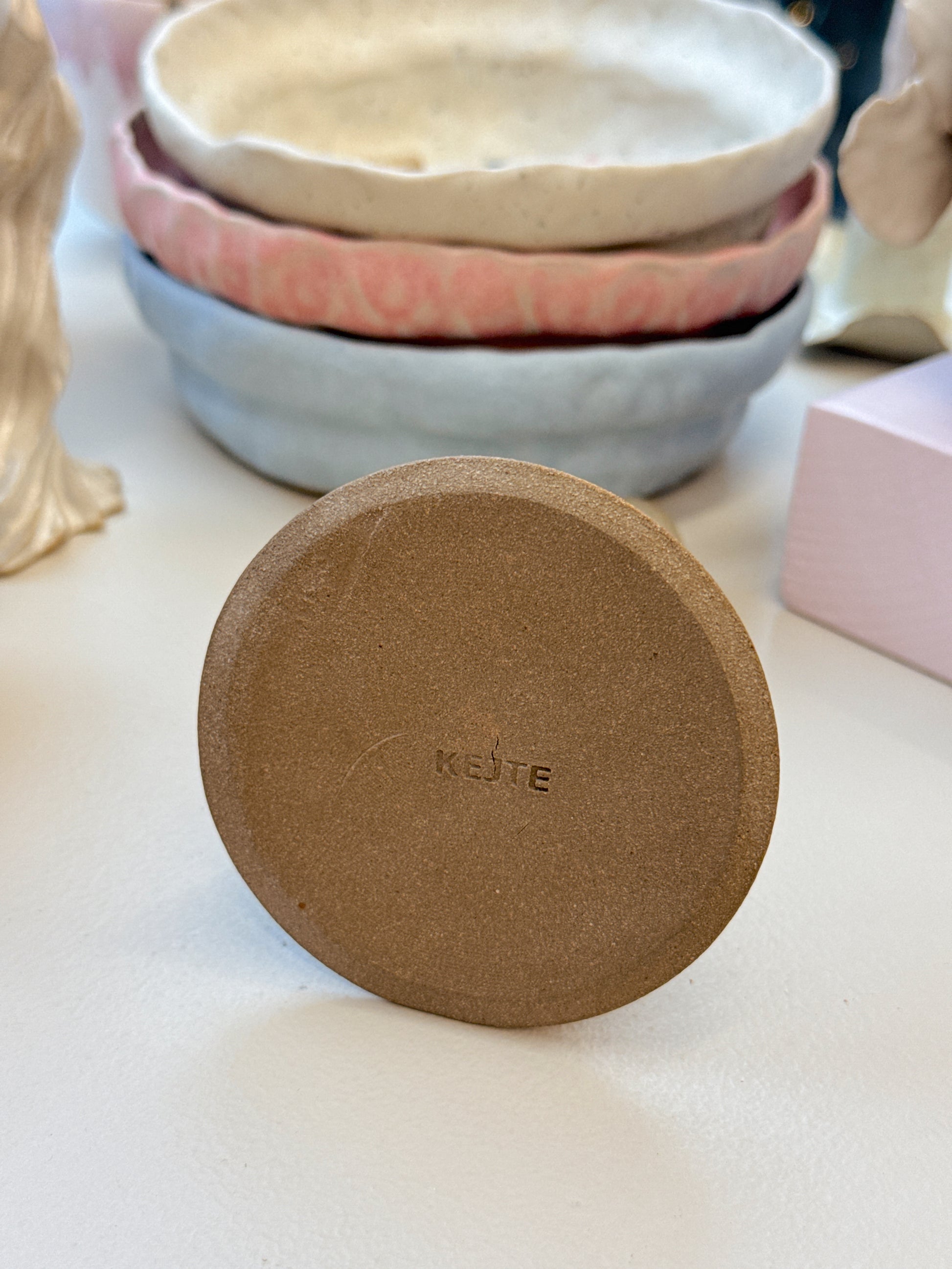 Holder til fire æggedonuts fra Kejte Keramik i brun og blå glasur.