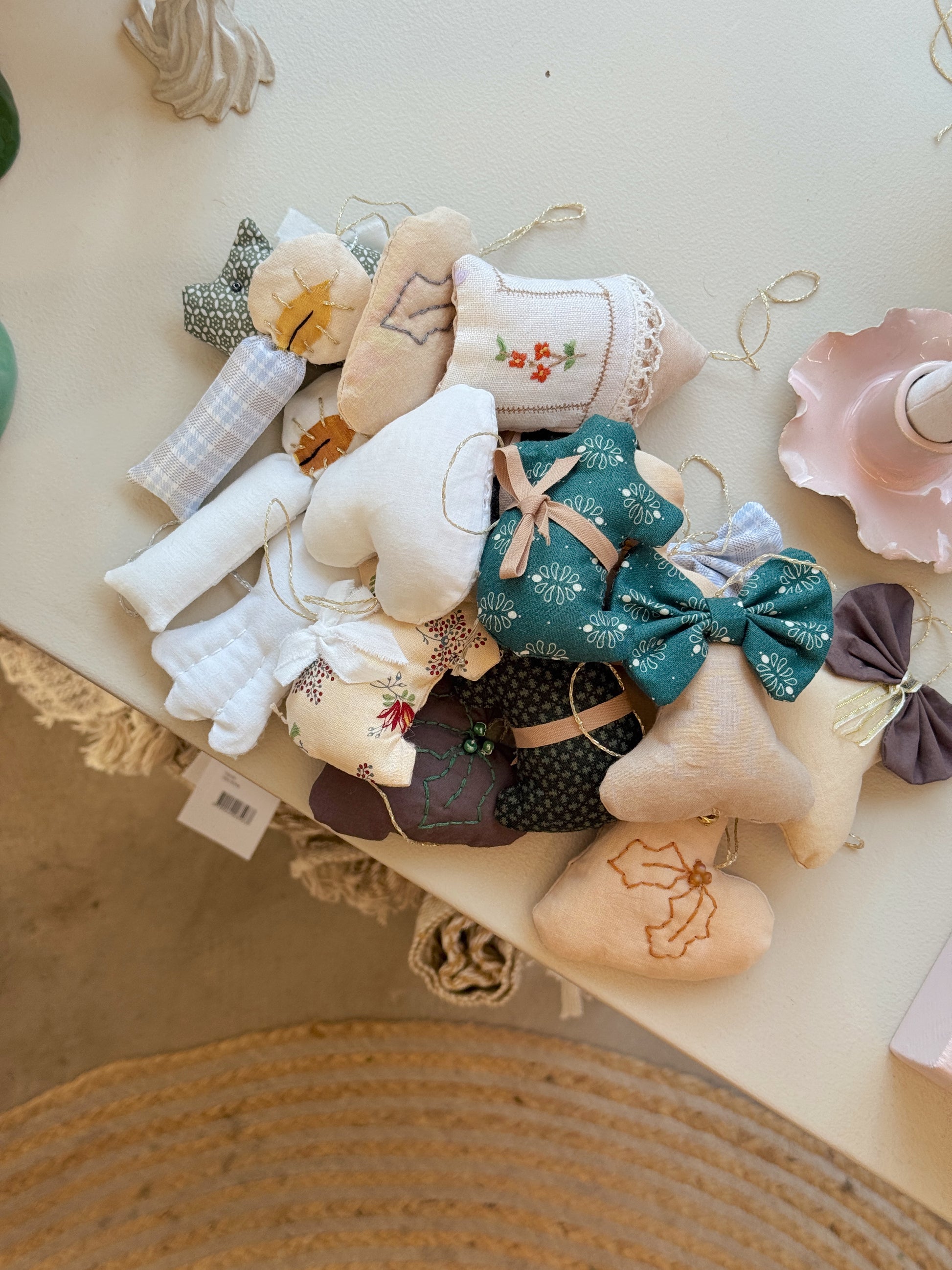 Forskellige udgaver af julepynt. Fåes i flere udgaver som alle er skabt i et mix af vintage- og plantefarvede tekstiler.