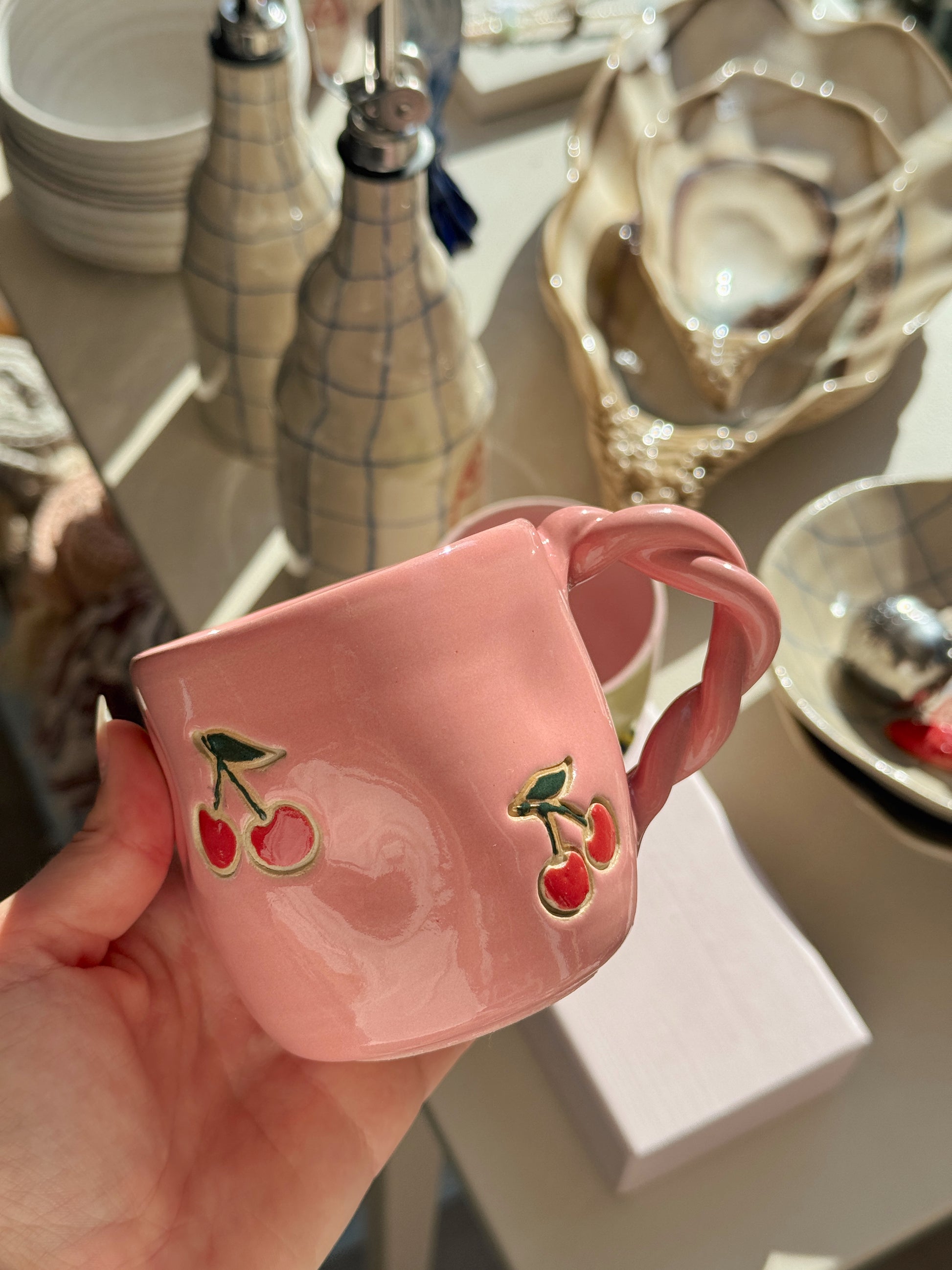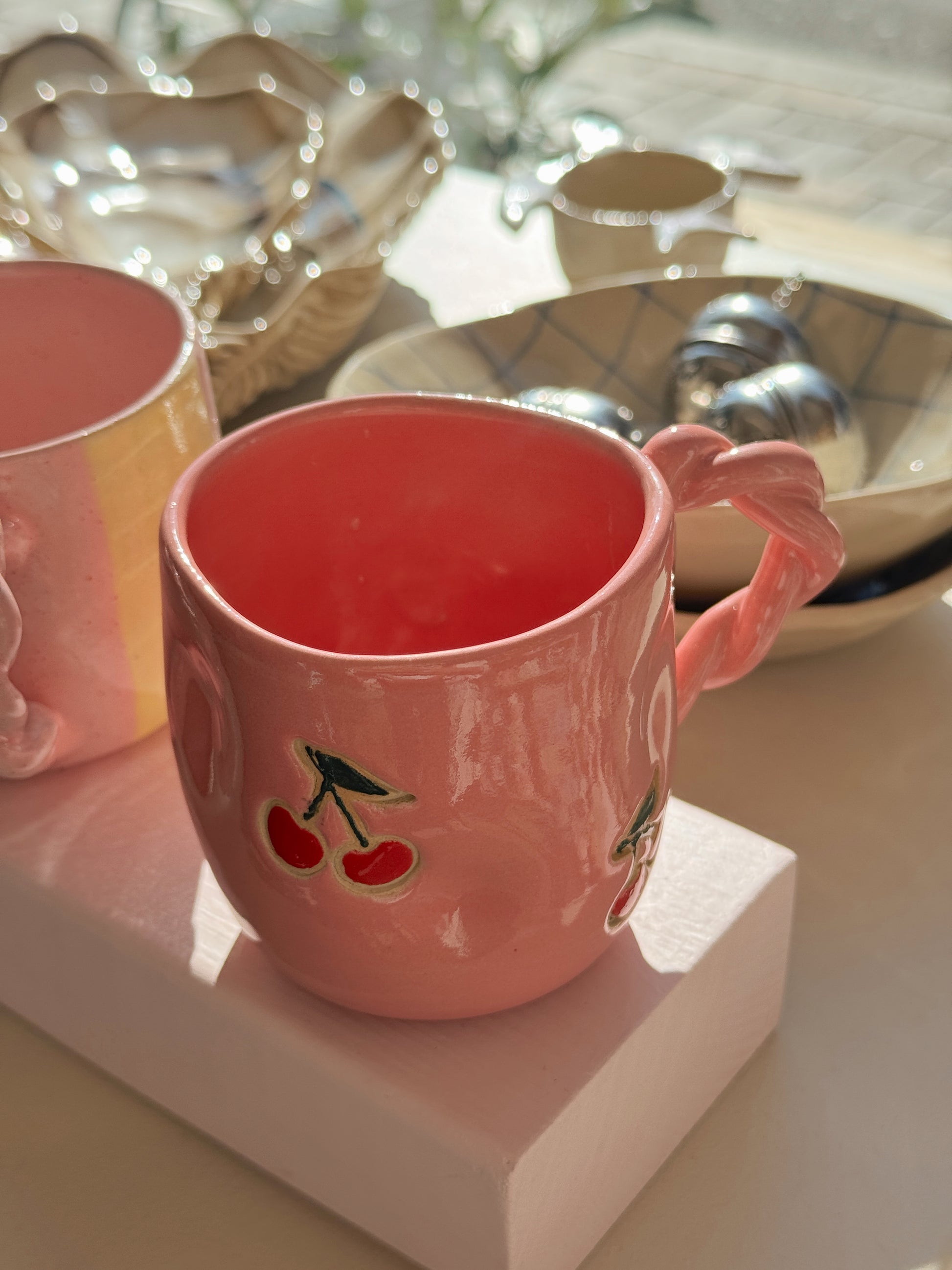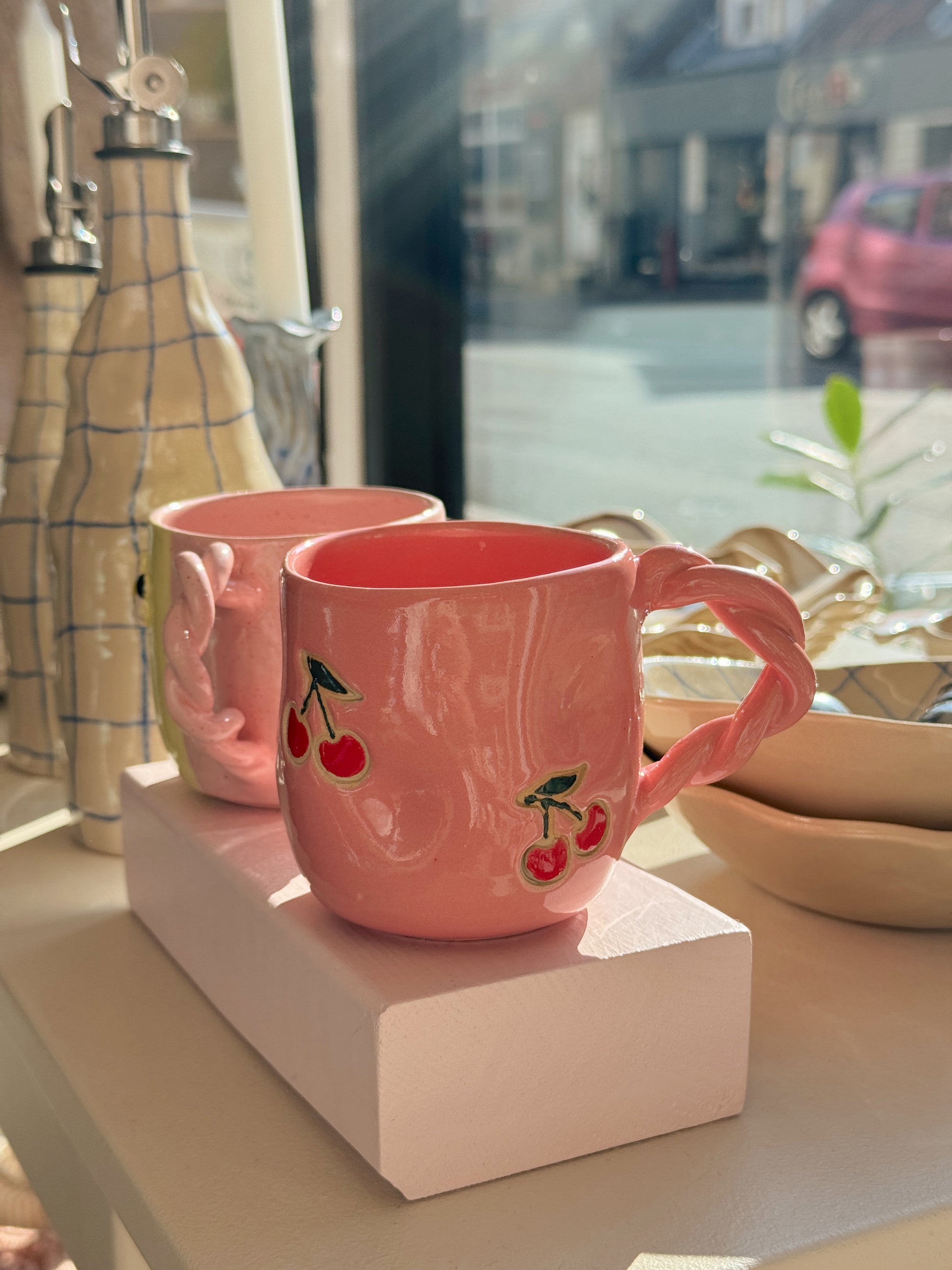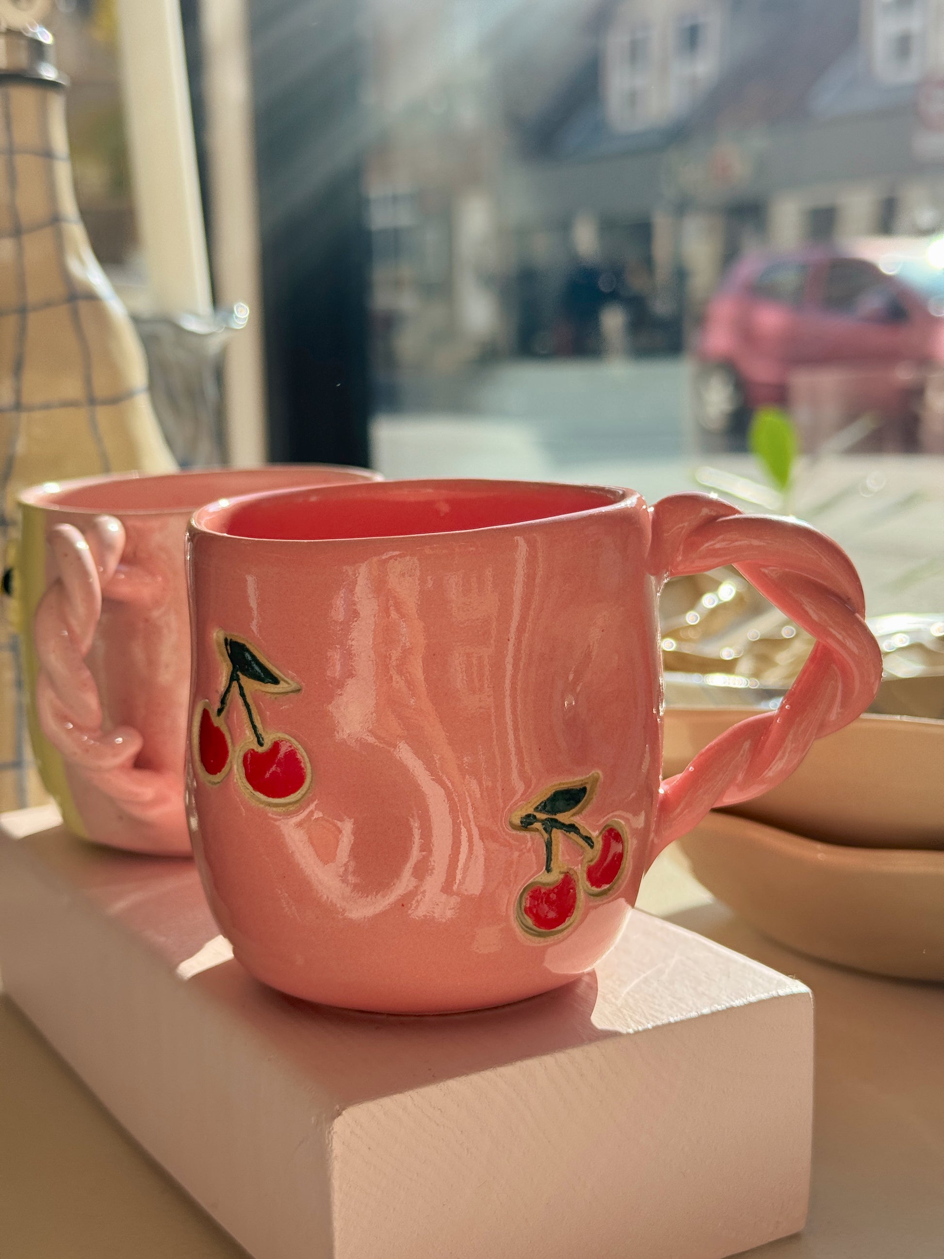 Kirsebærkop fra Victoria Juul, som står bag Handmade By Victoria Juul, hånddrejer eller former og håndmaler alle sine keramikværker. Hver en kop, skål eller vase bliver derfor helt sin egen og unik.