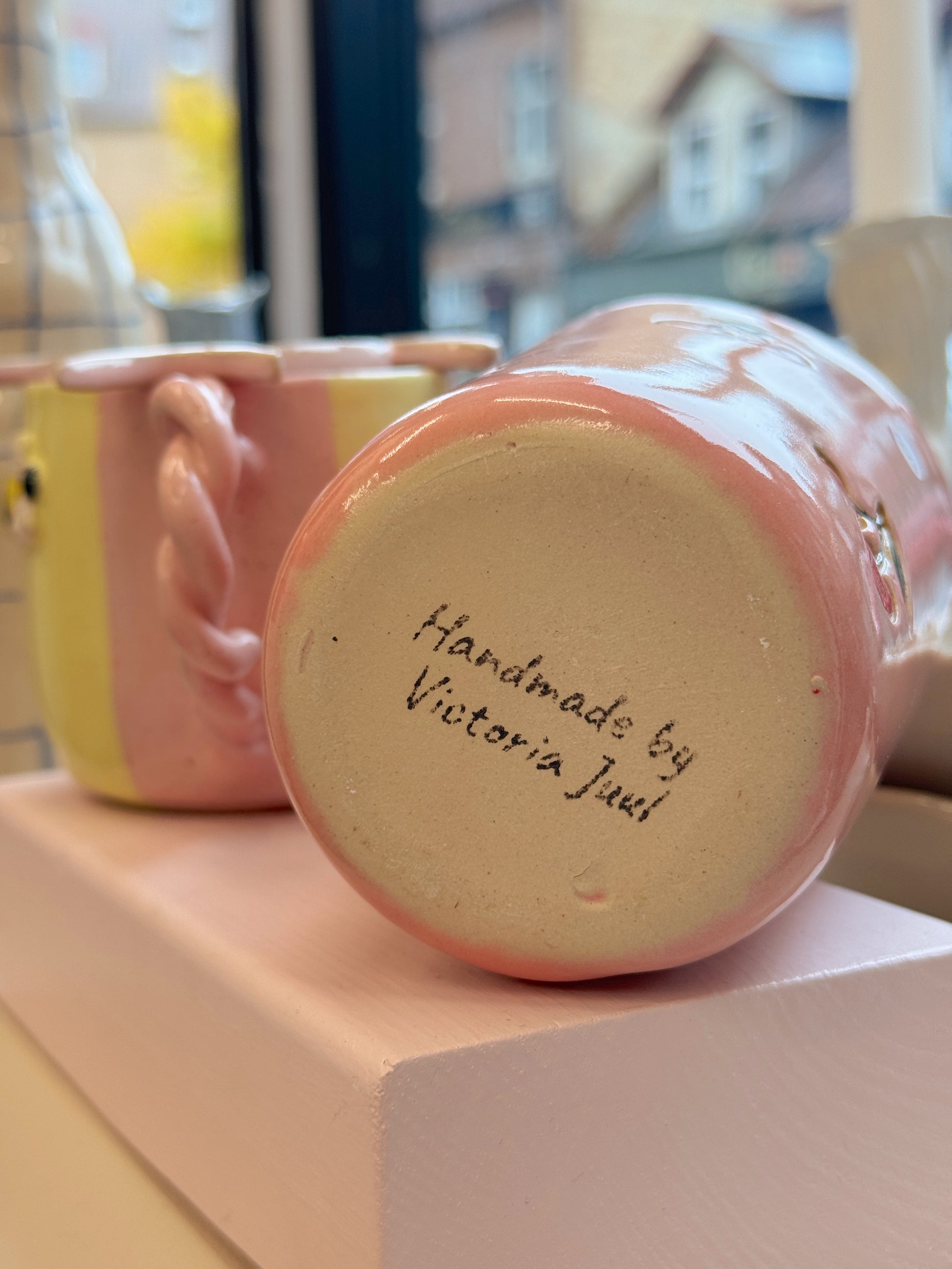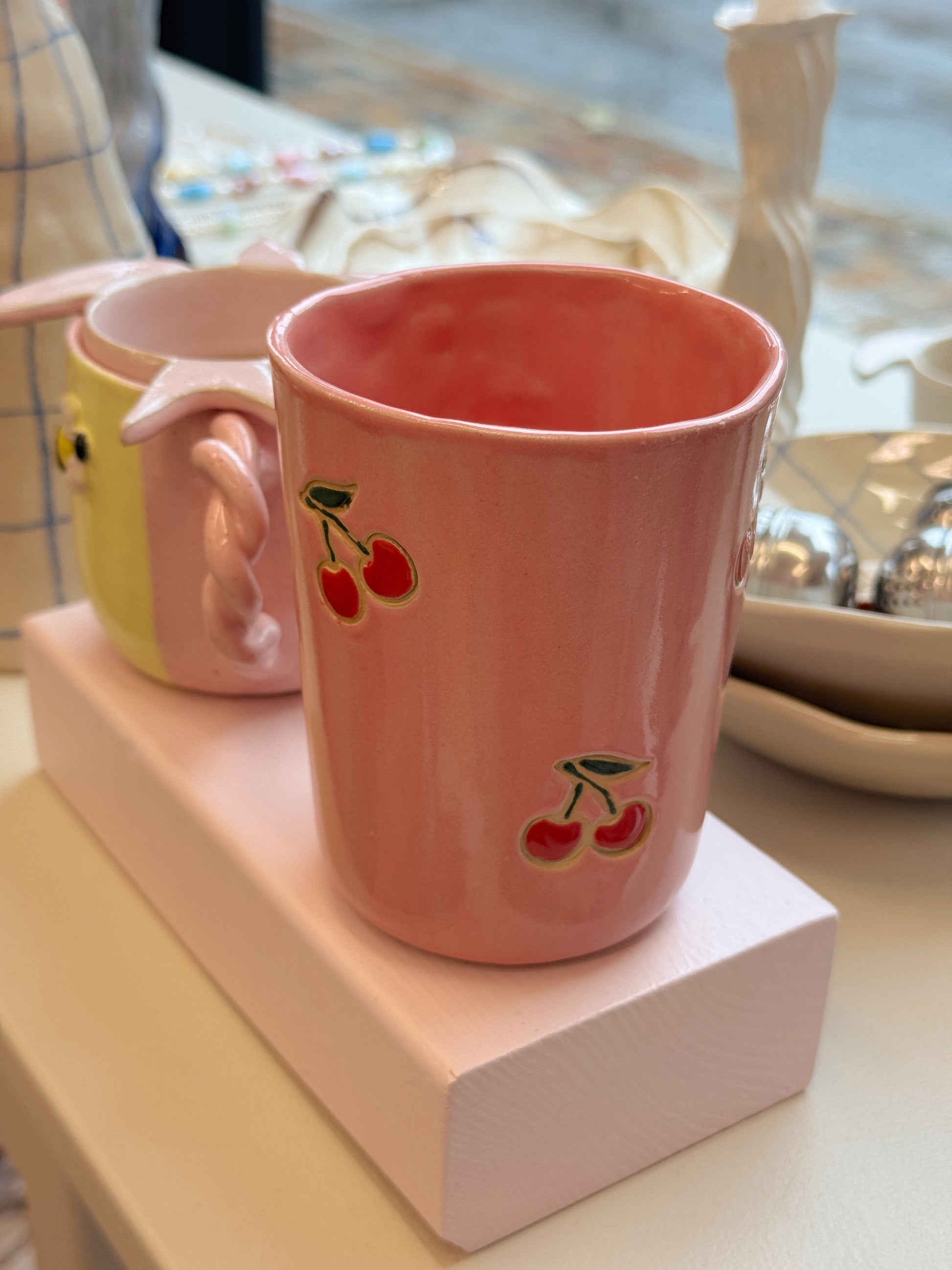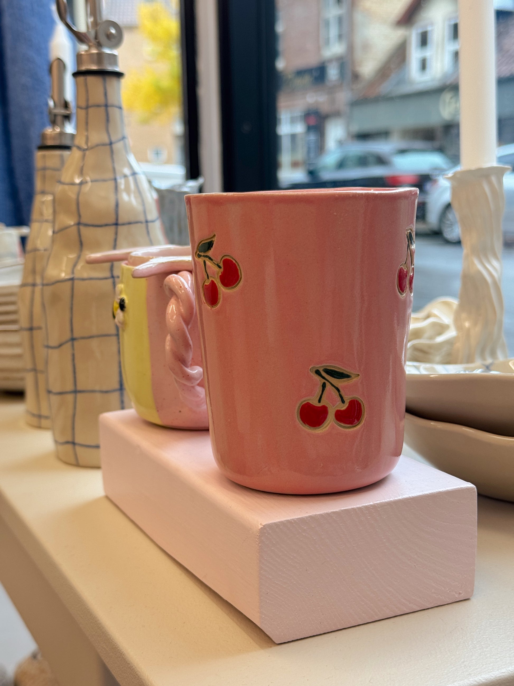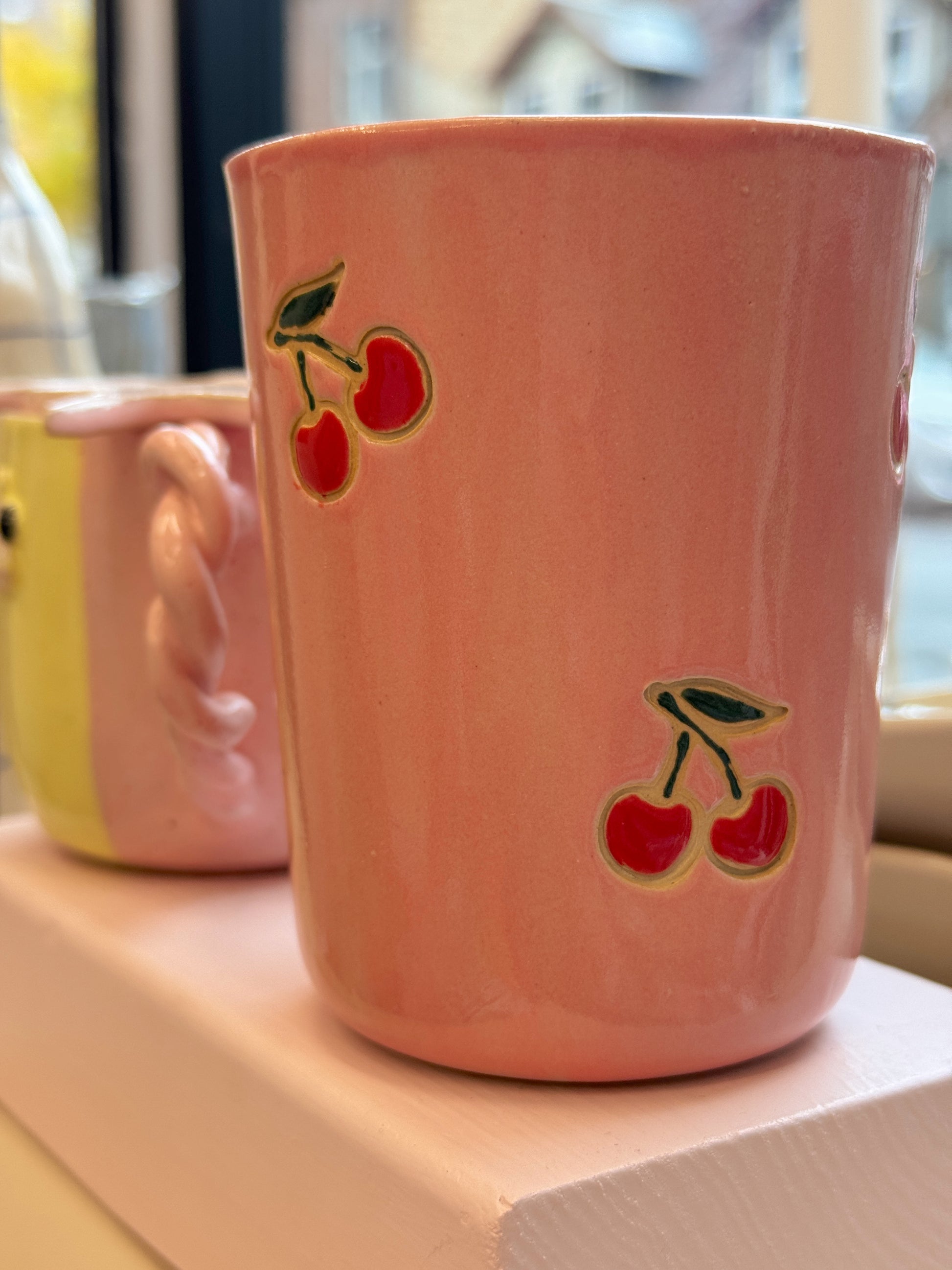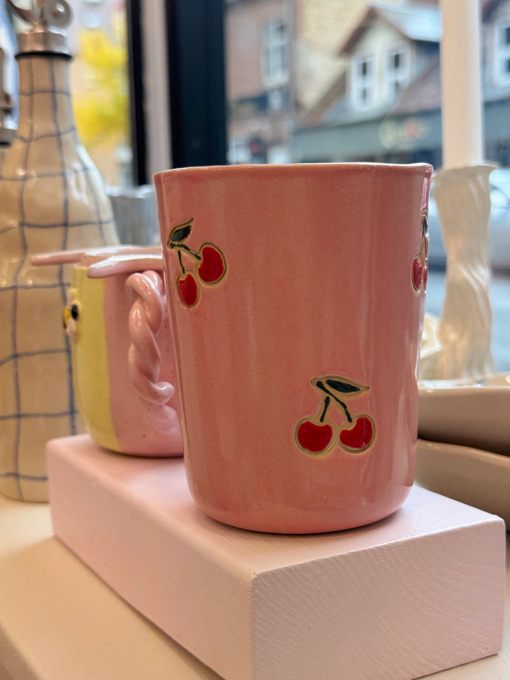 Kirsebærkop fra Victoria Juul, som står bag Handmade By Victoria Juul, hånddrejer eller former og håndmaler alle sine keramikværker. Hver en kop, skål eller vase bliver derfor helt sin egen og unik.