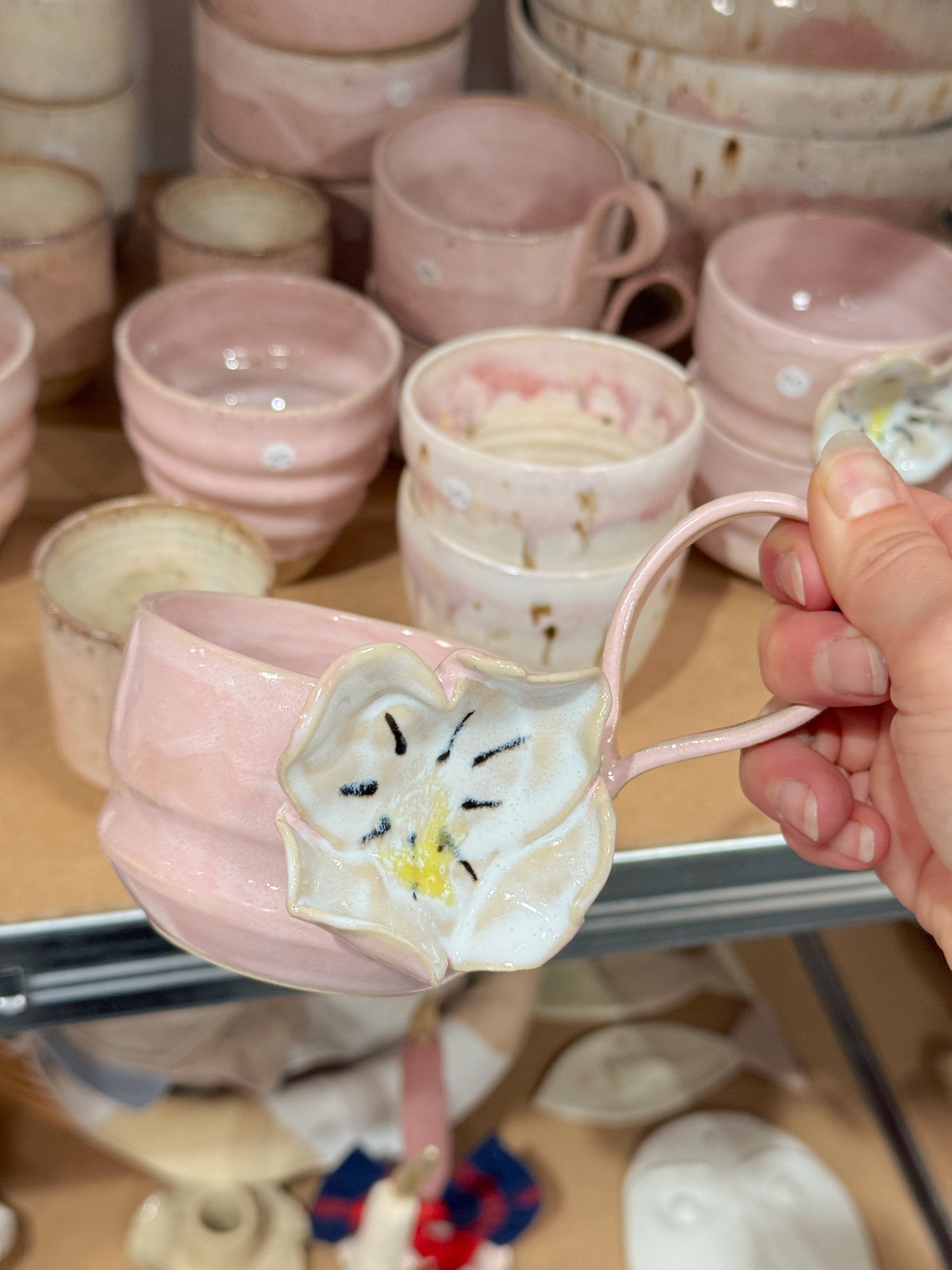 Håndlavede lyserød kop med yndig blomst.