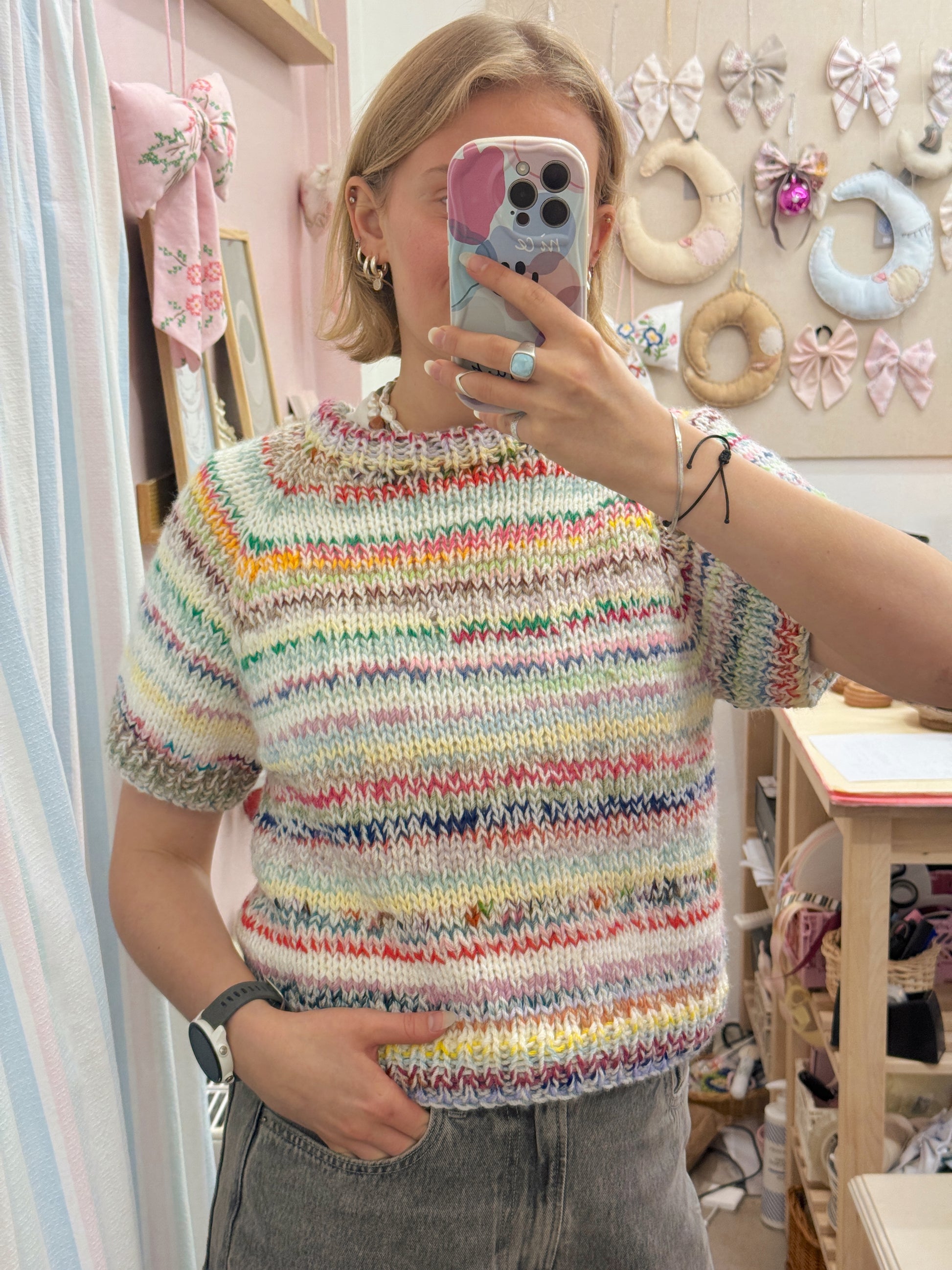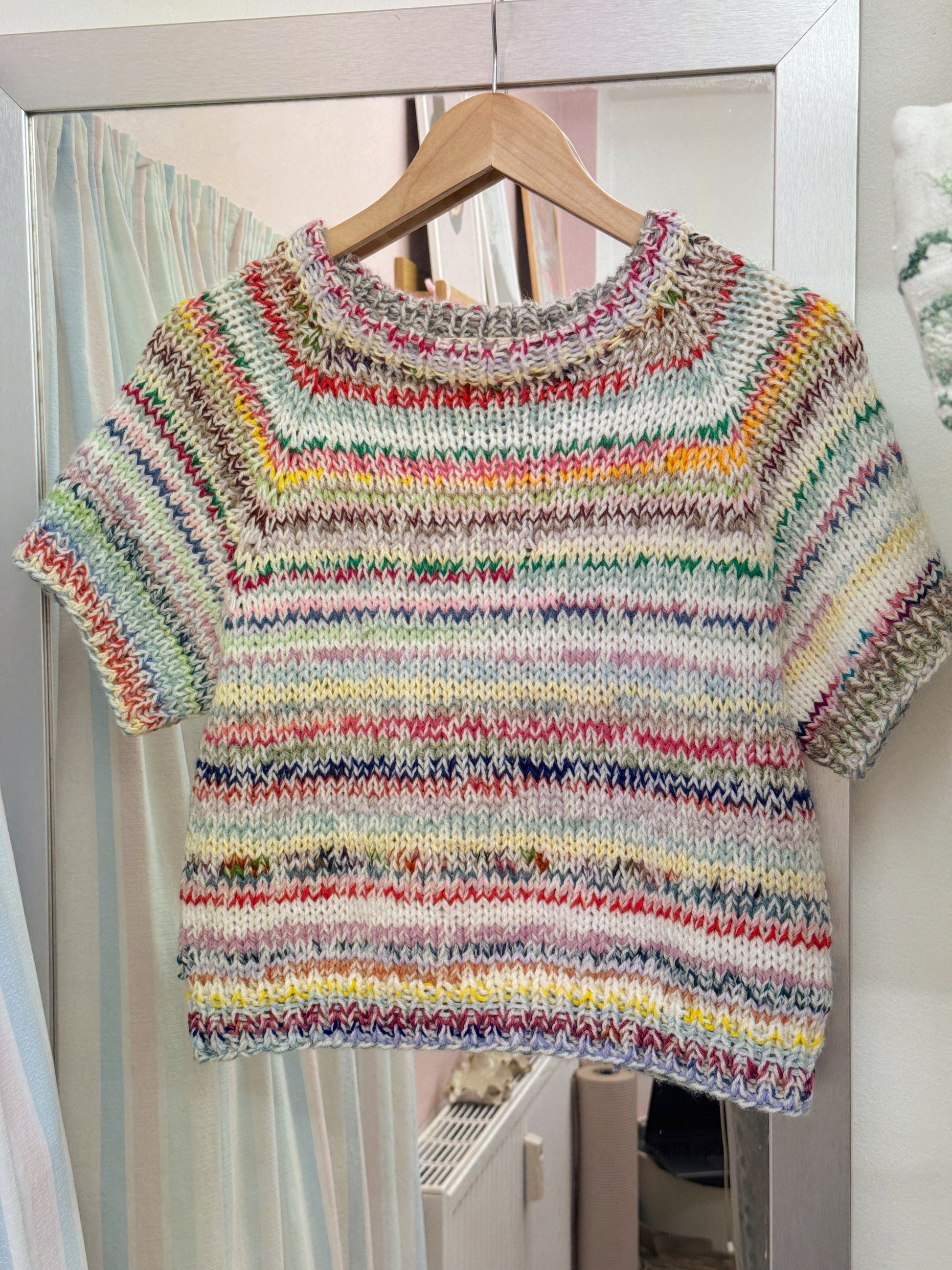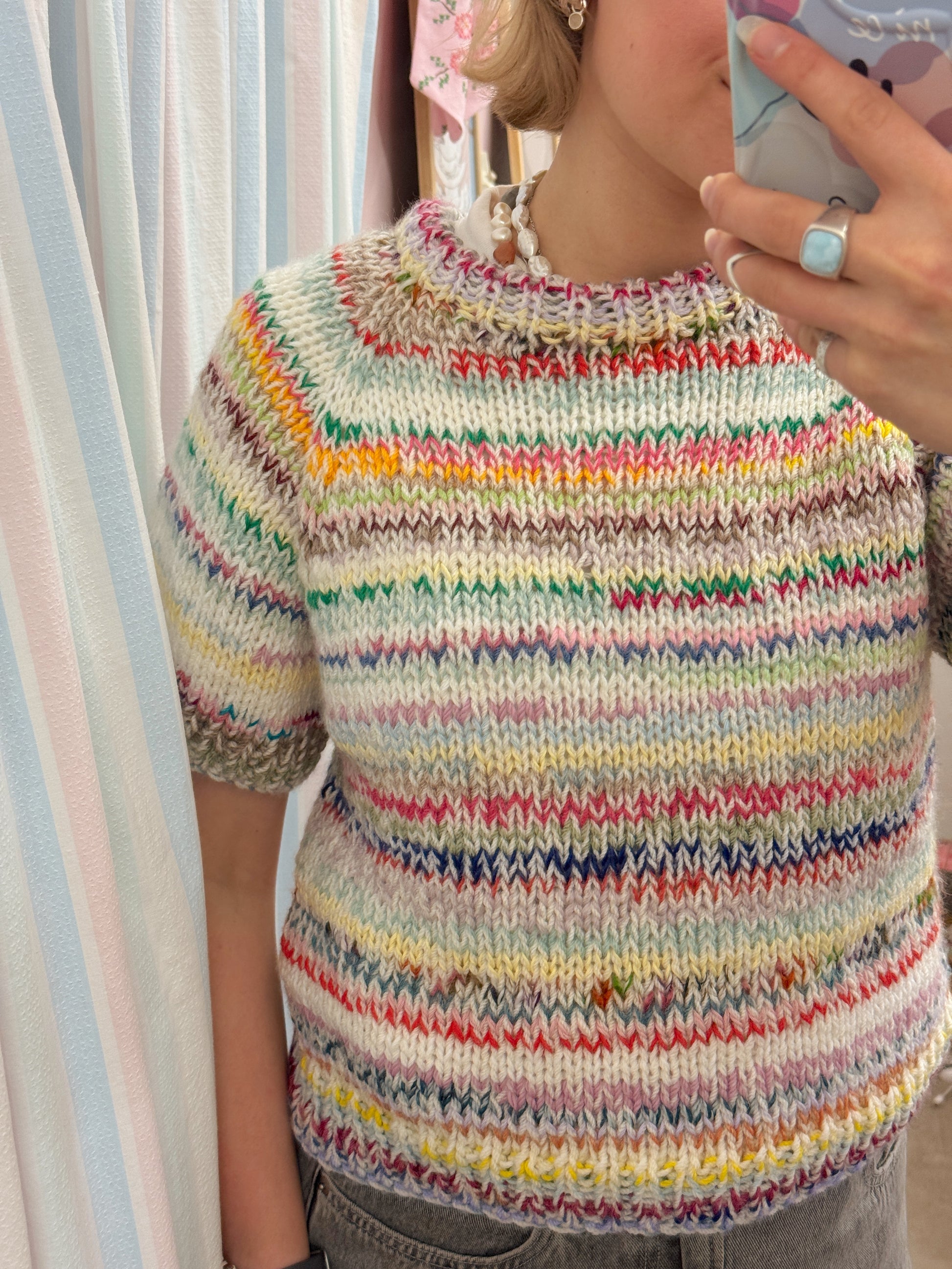 Striktrøje fra KC.Knitting. Den smukkeste multifarvede sag med korte ærmer. Fås i flere størrelser og varianter.