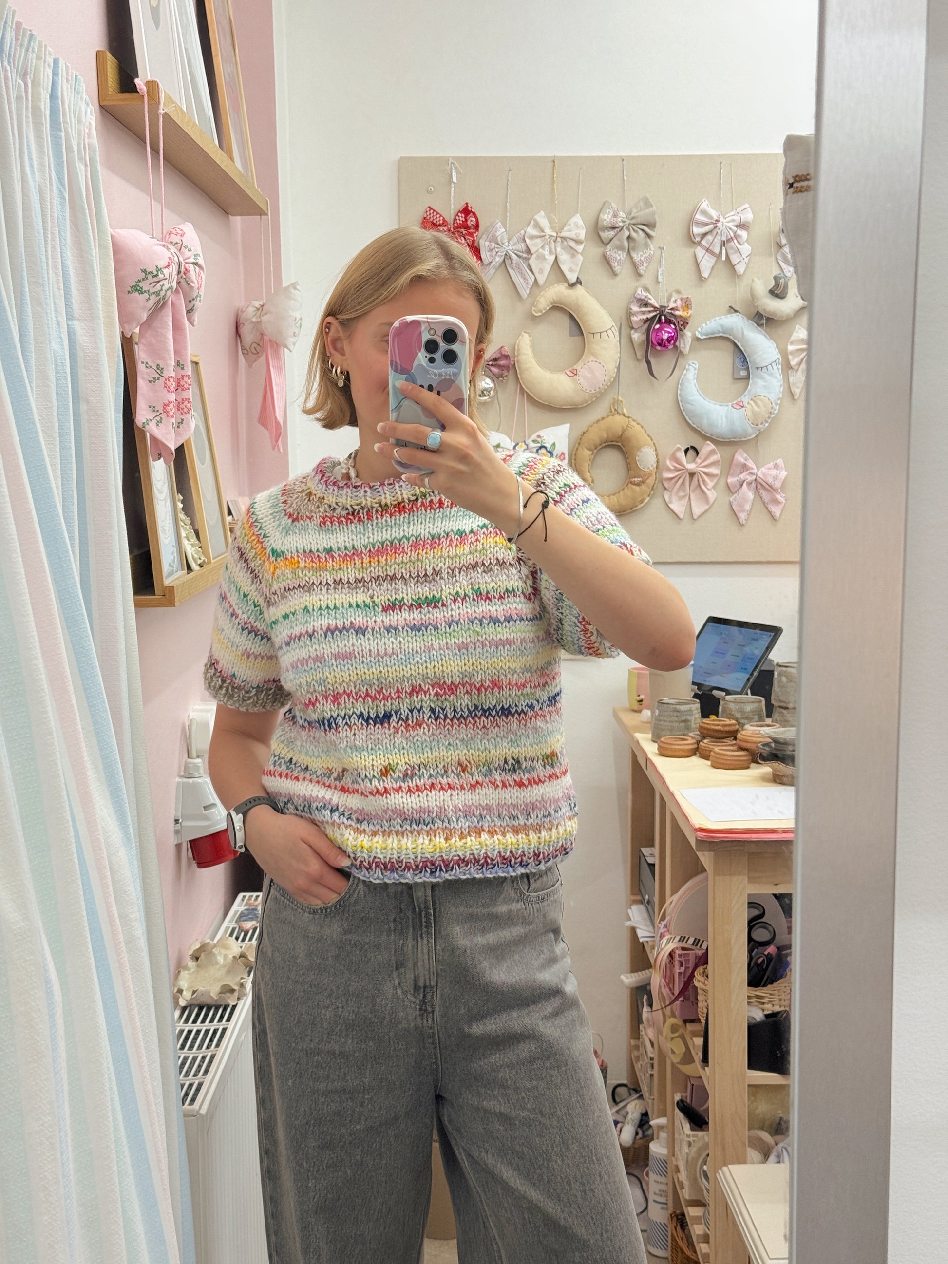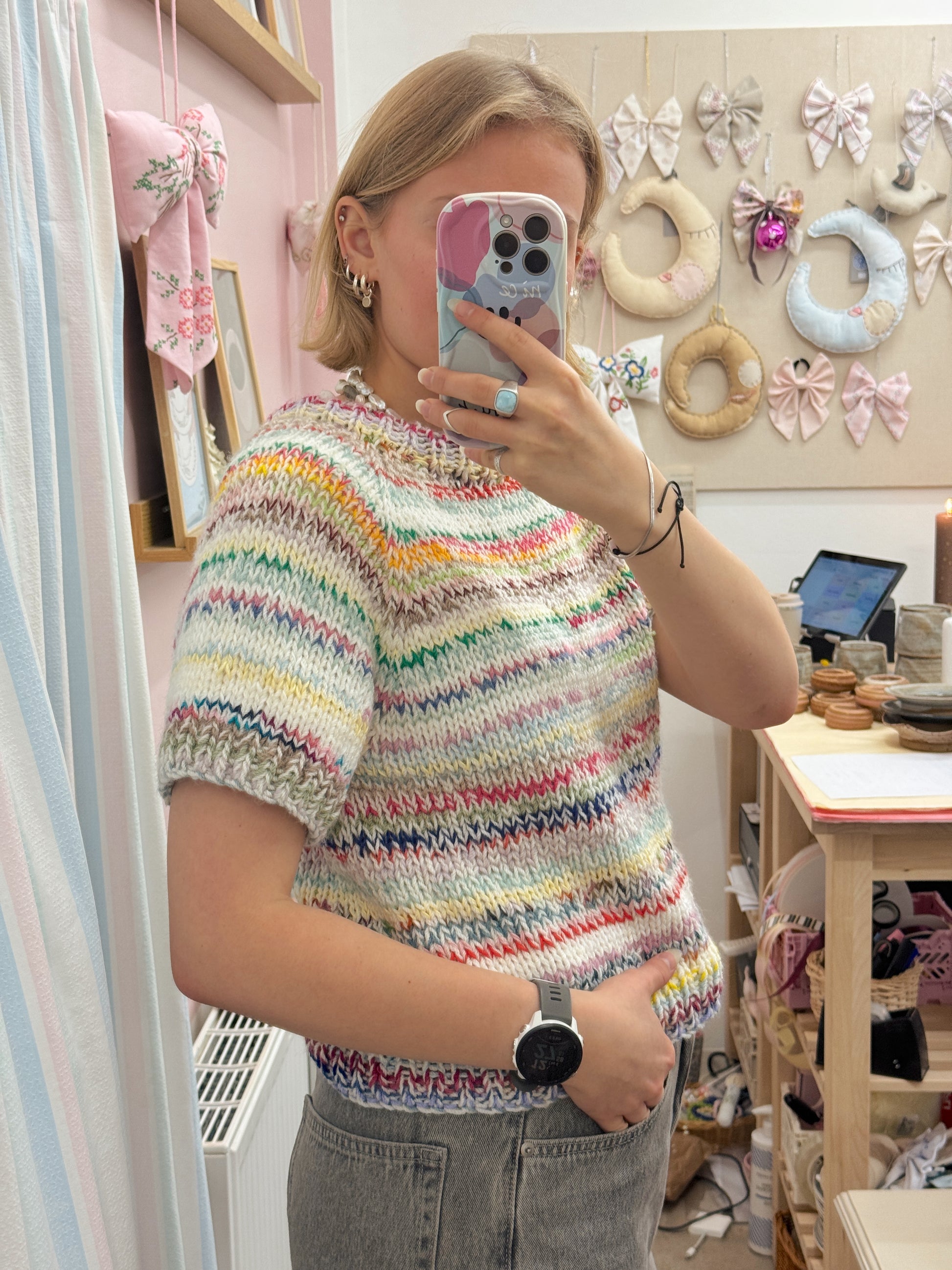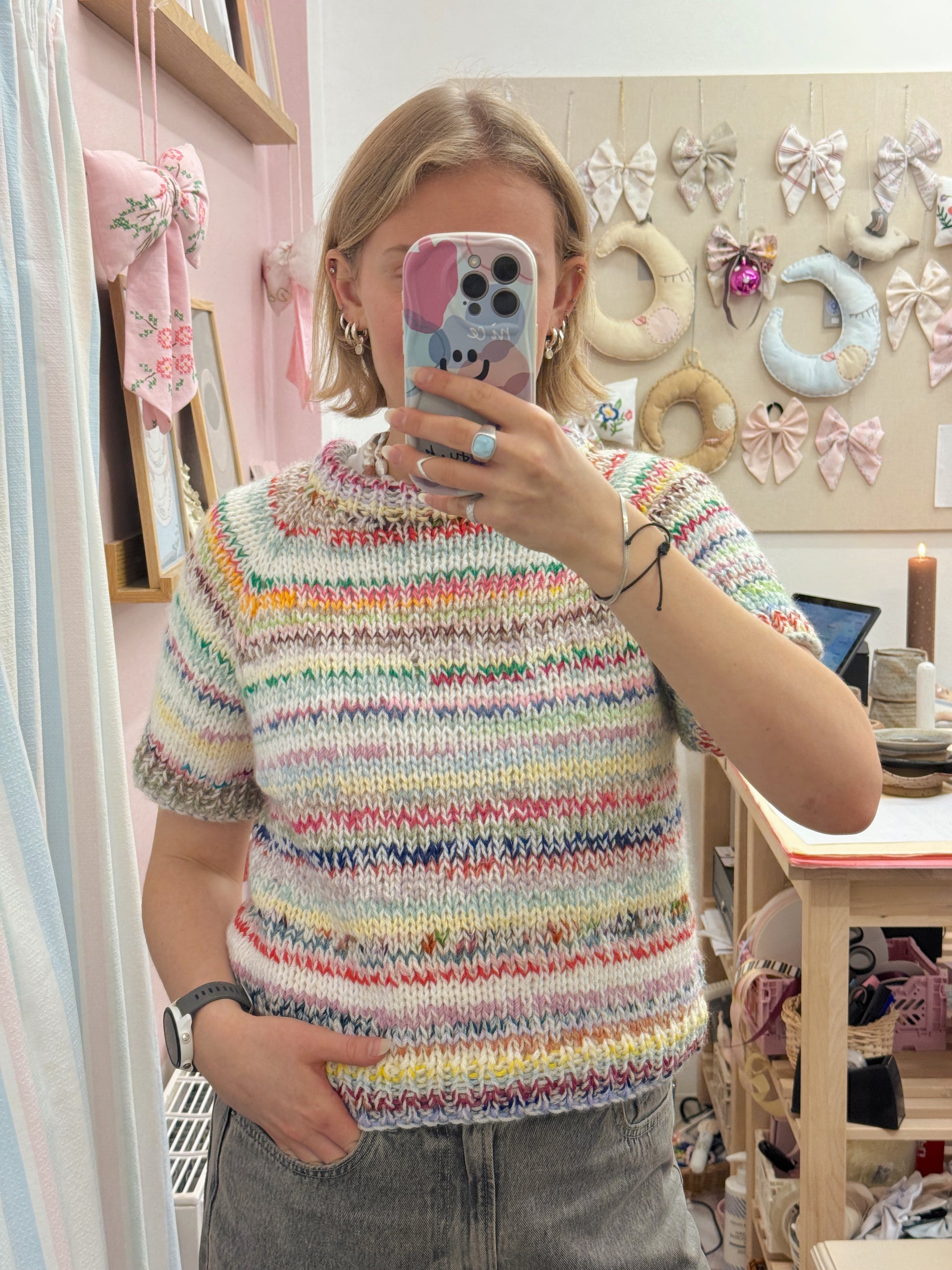 Striktrøje fra KC.Knitting. Den smukkeste multifarvede sag med korte ærmer. Fås i flere størrelser og varianter.