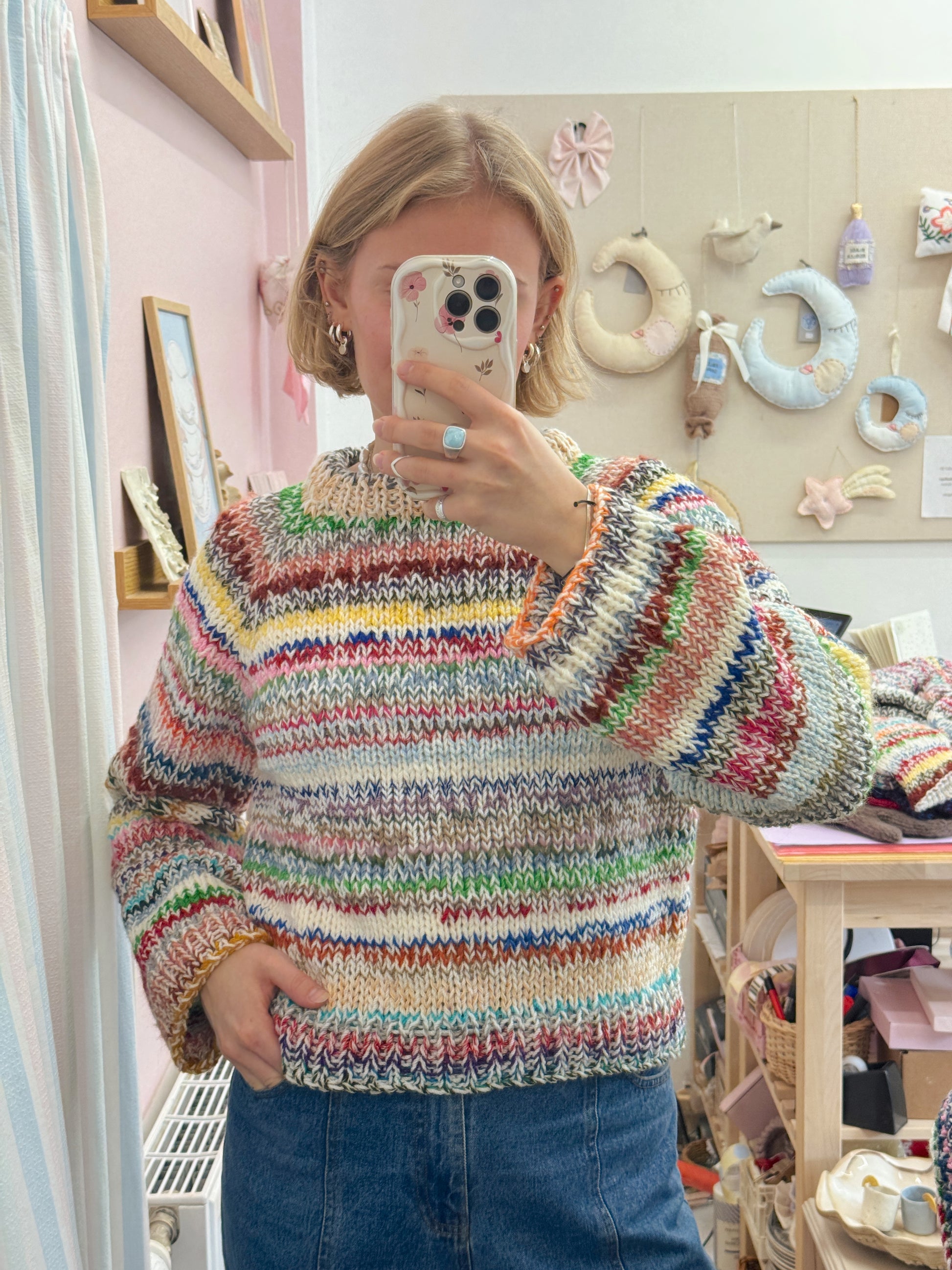 Striktrøje fra KC.Knitting, som strikker i genbrugsgarn. Den smukkeste multifarvede sag med vidde ærmer. Fås i flere størrelser og varianter.