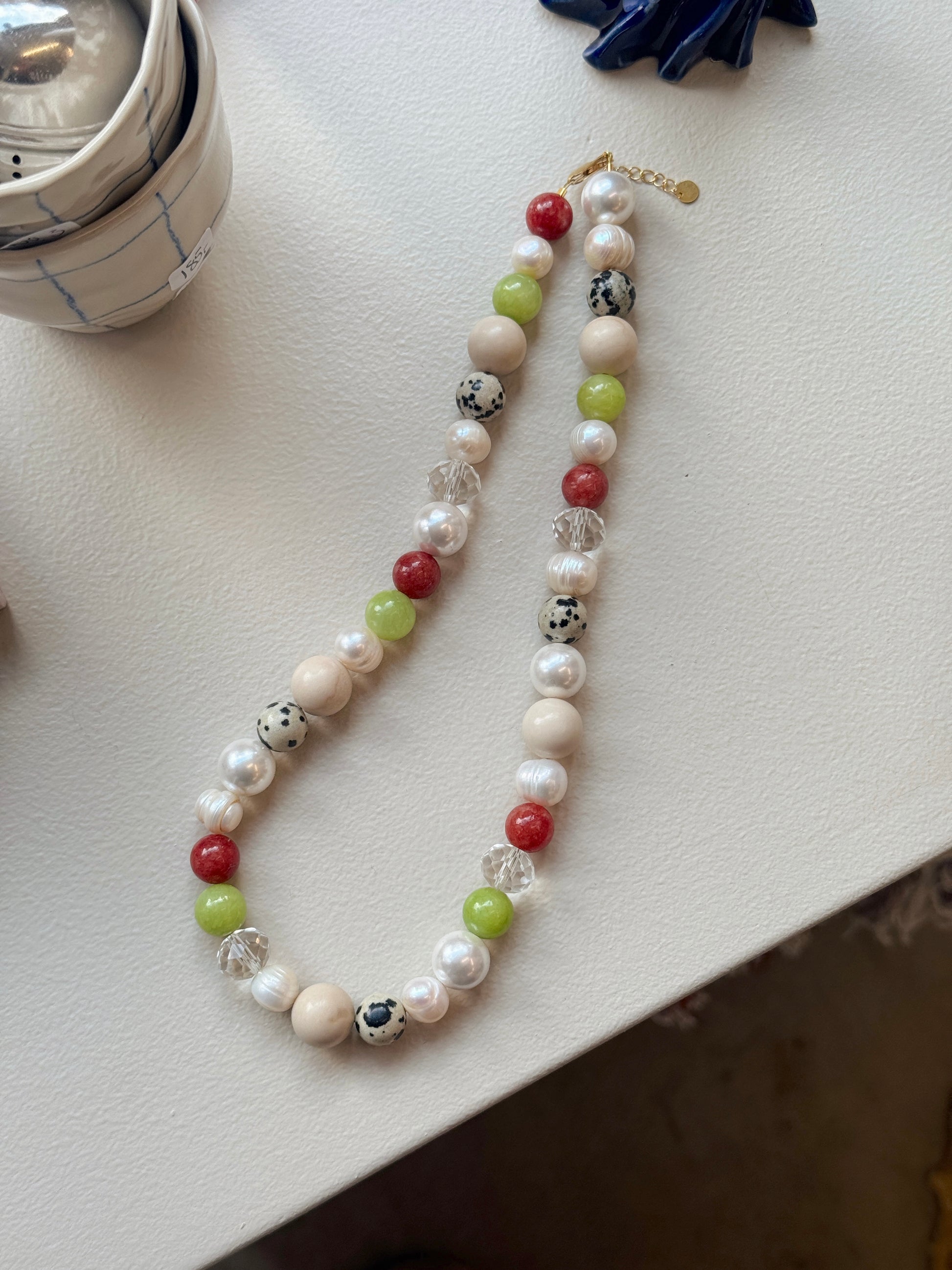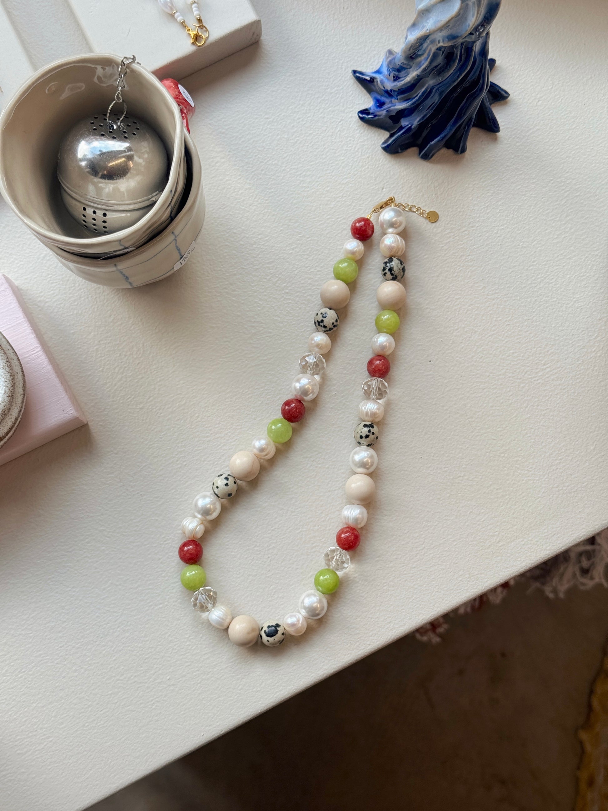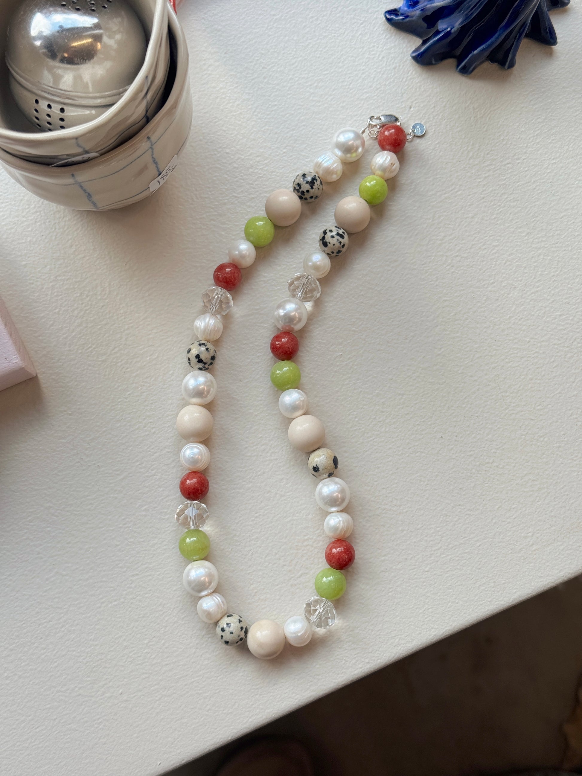 Kæden består af et mix af naturstensperler samt ferskvandsperler - den fås i både guld og sølv, men et begrænset antal af hver. Perlerne er trukket på en wire, som gør kæden yderst holdbar.