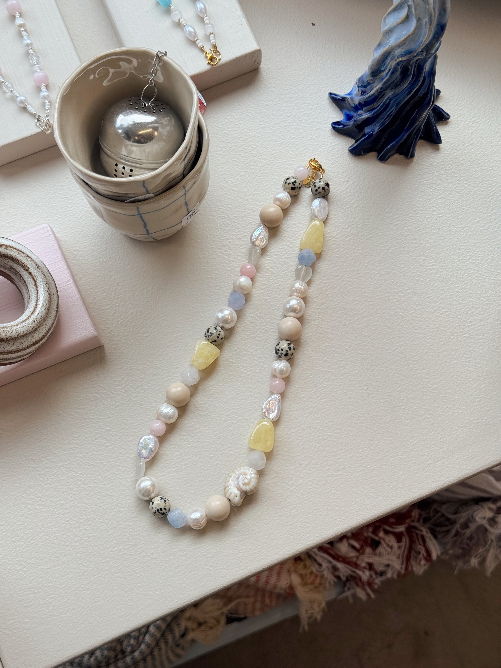 Kæden består af et mix af naturstensperler samt ferskvandsperler - den fås i både guld og sølv, men et begrænset antal af hver. Perlerne er trukket på en wire, som gør kæden yderst holdbar.