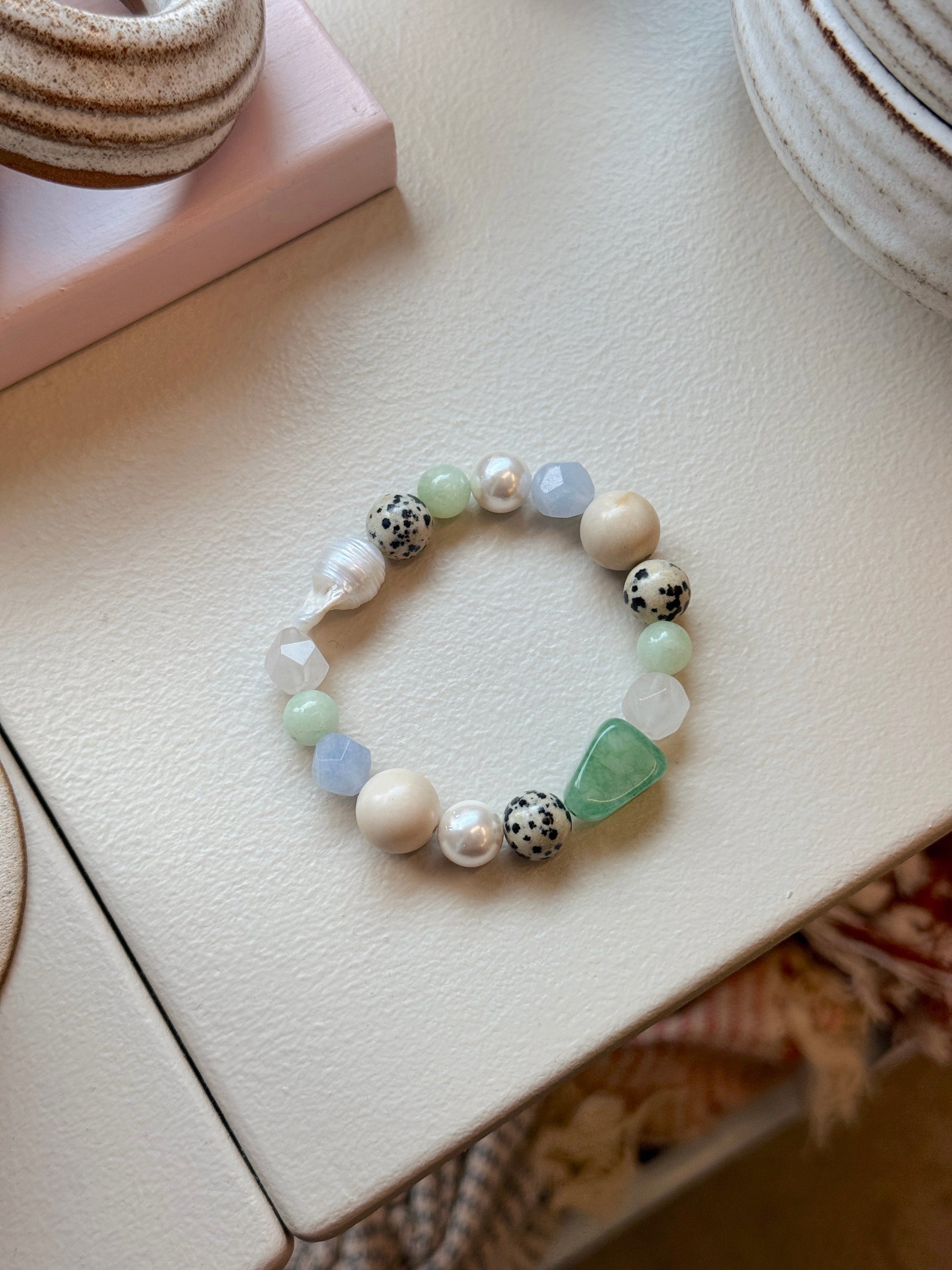 Armbånd med et mix farver, så der er til enhver smag. Armbåndet består af 8-12mm naturstensperler - derfor vil man opleve at perlernes farver og størrelse varierer en smule. Fåes i mange forskellige udgaver.