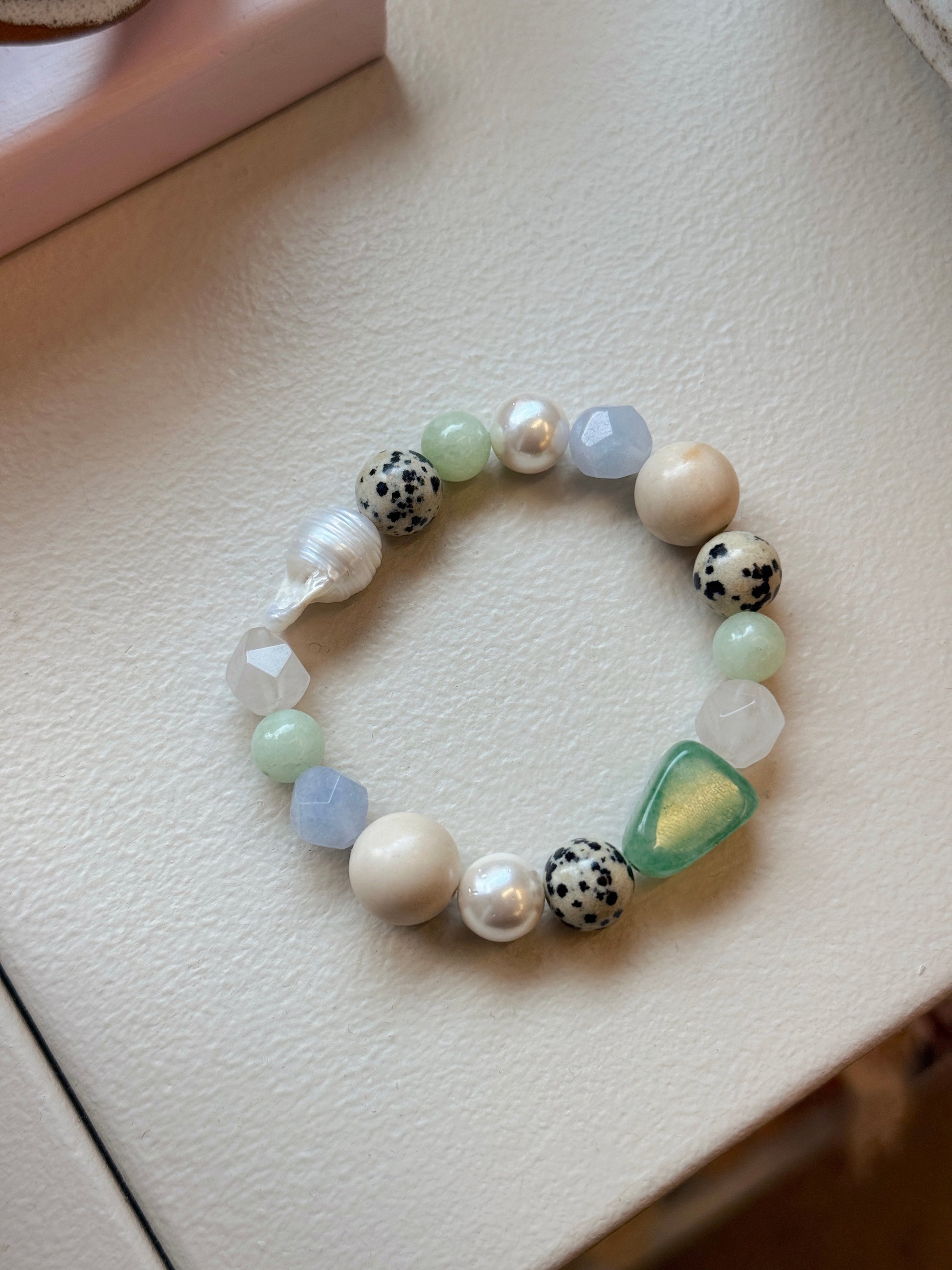 Perlerne er trukket på en elastiksnor, som gør det nemt at tage af og på og samtidig sidder godt på håndleddet.