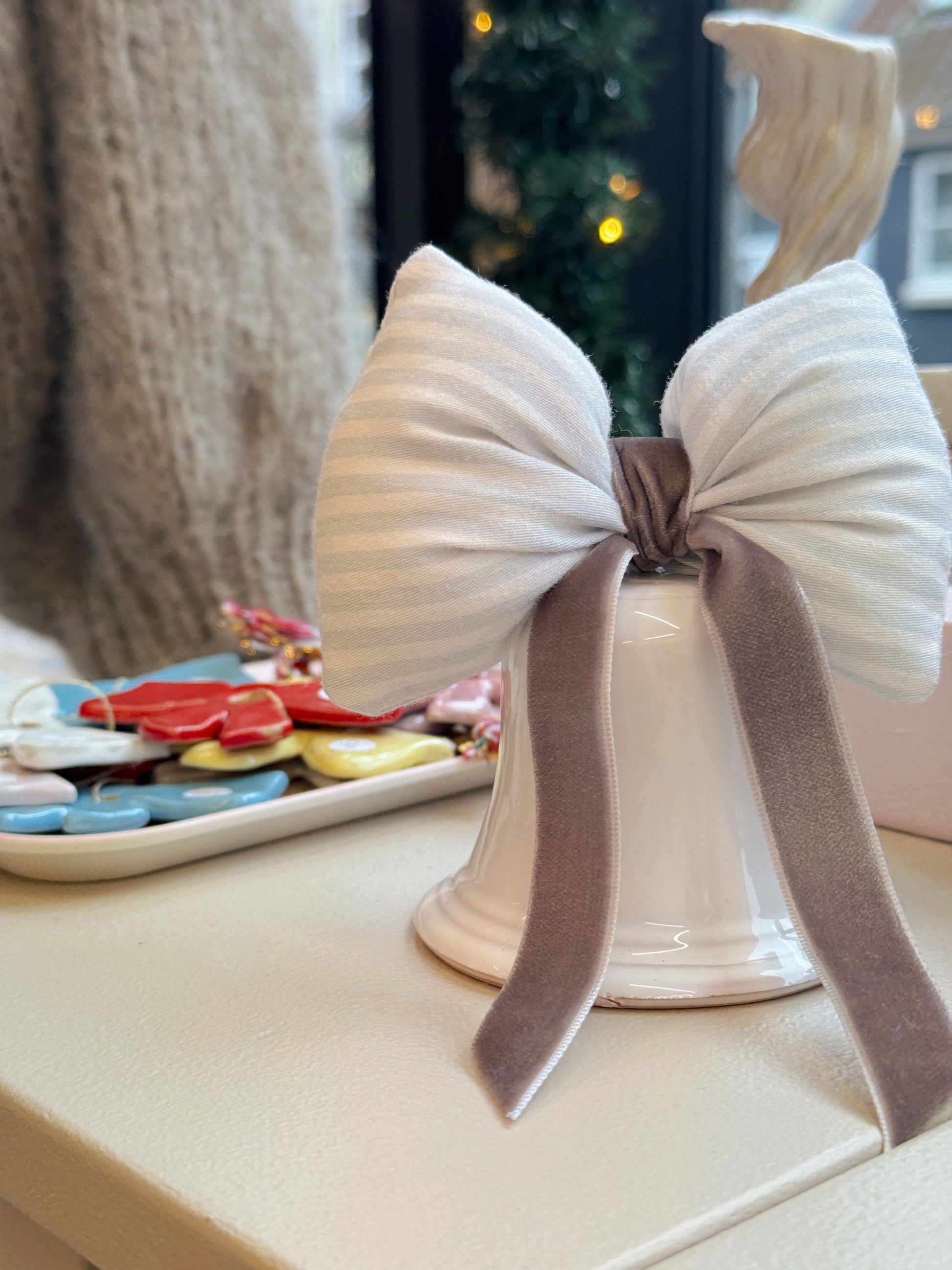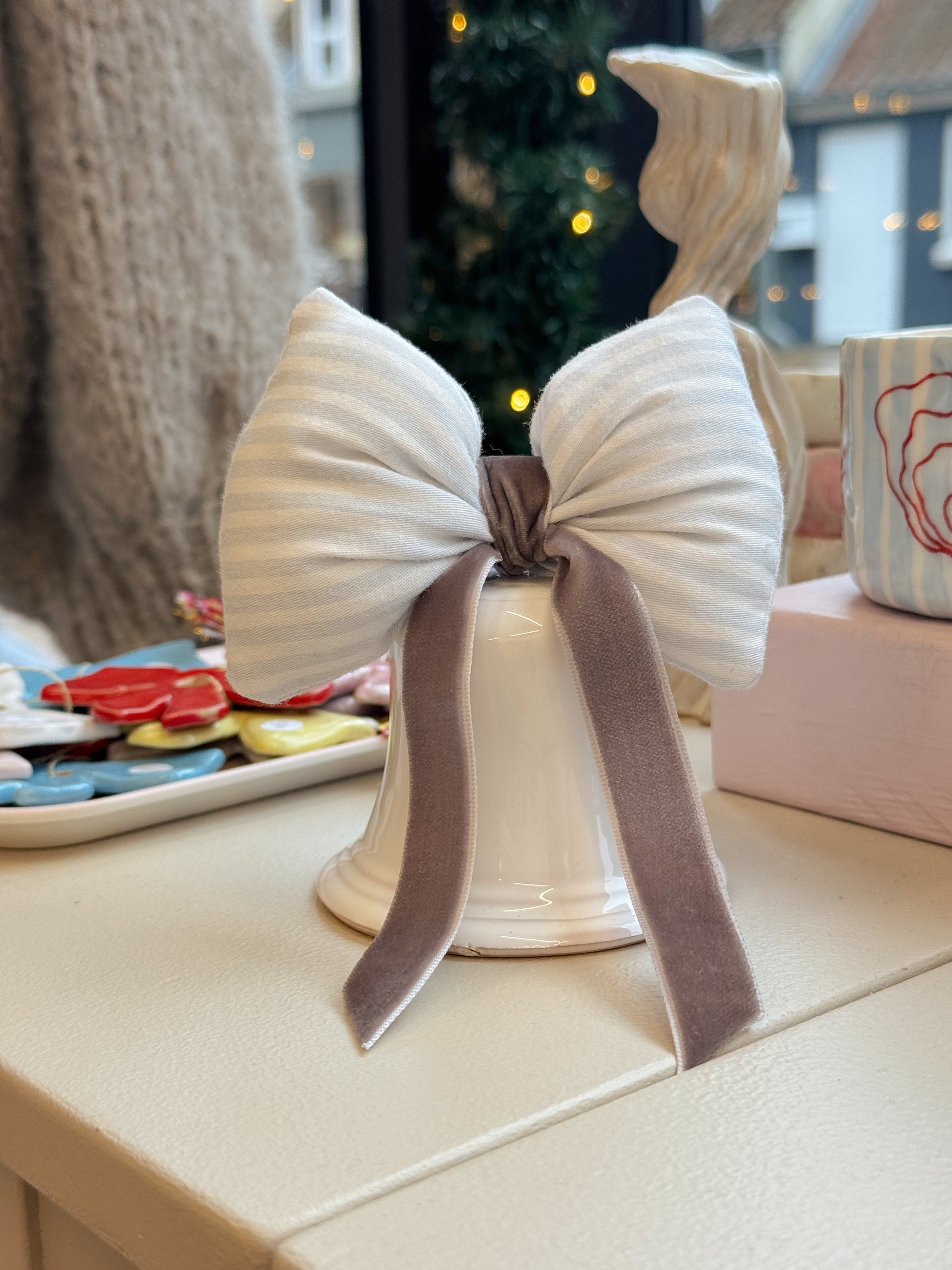 Vintage klokke med hjemmesesyet sløjfe i vintagetekstil og et fint bånd. Mange lader klokker pynte i juletiden, hos Smågt synes vi at de hører til hele året rundt. Lad dem pynte på reoler, borde, kommoder eller dine hylder.
