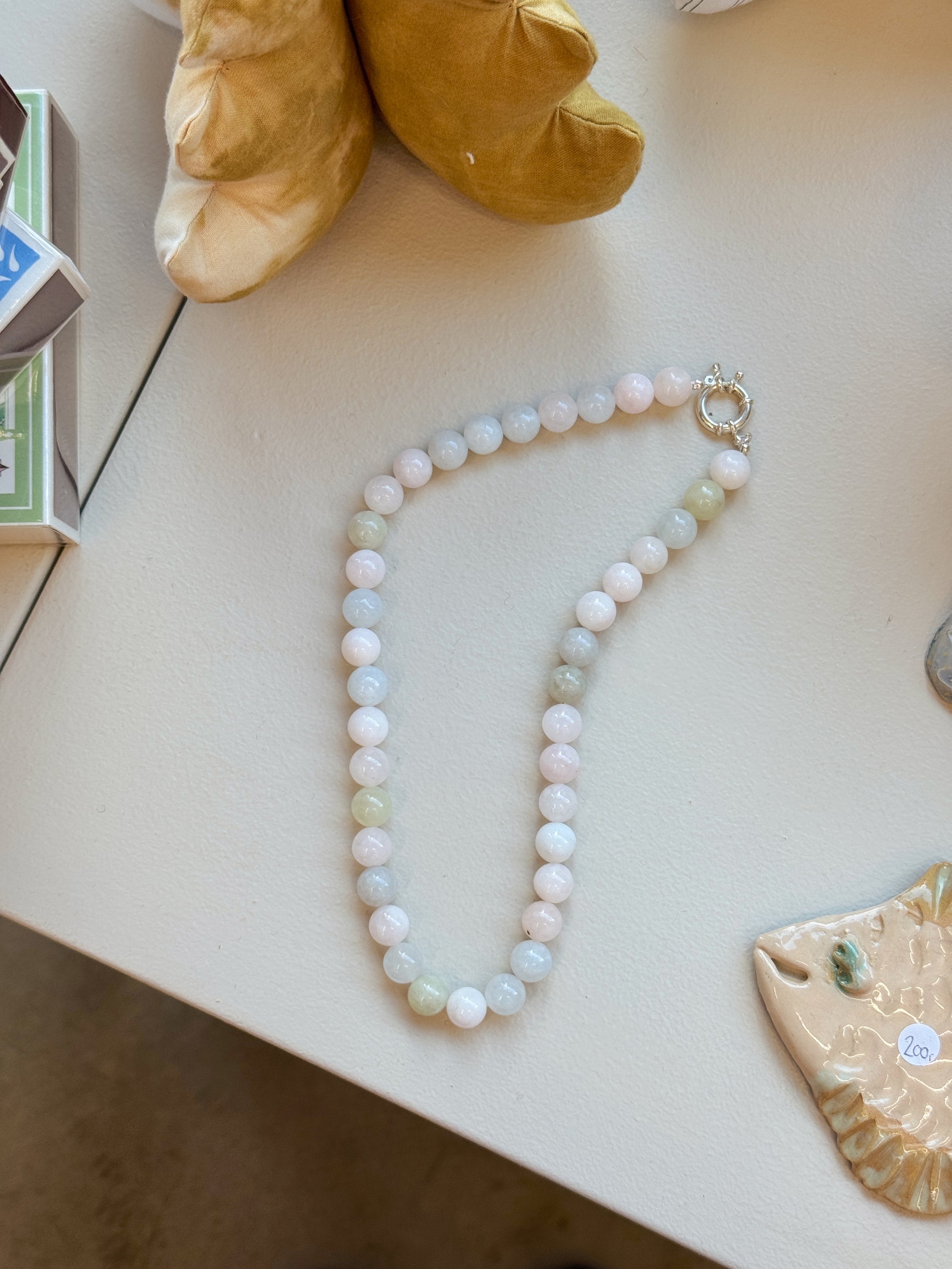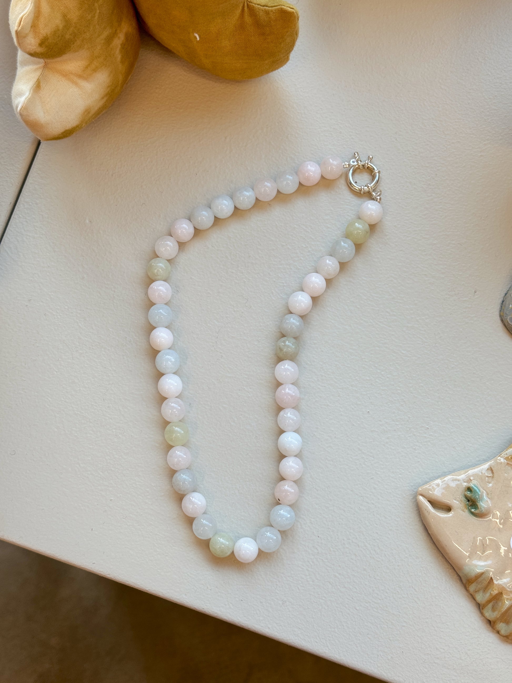 VIVA består af en mix af 10mm jade perler - derfor vil man også opleve at farvernes forløb på hver halskæde er forskellig. Ingen er derfor helt ens.
